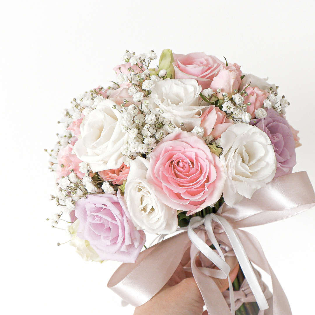 Pink Impression bridal bouquet come with 6 pink rose, 5 lilac rose, spray rose pink, white eustoma, baby breath & eucalyptus baby blue.