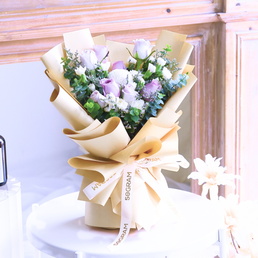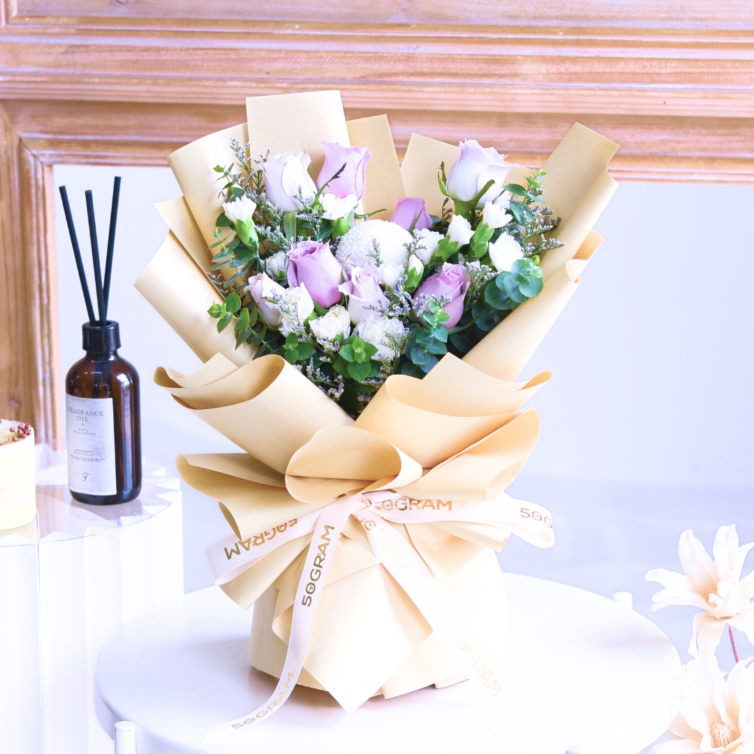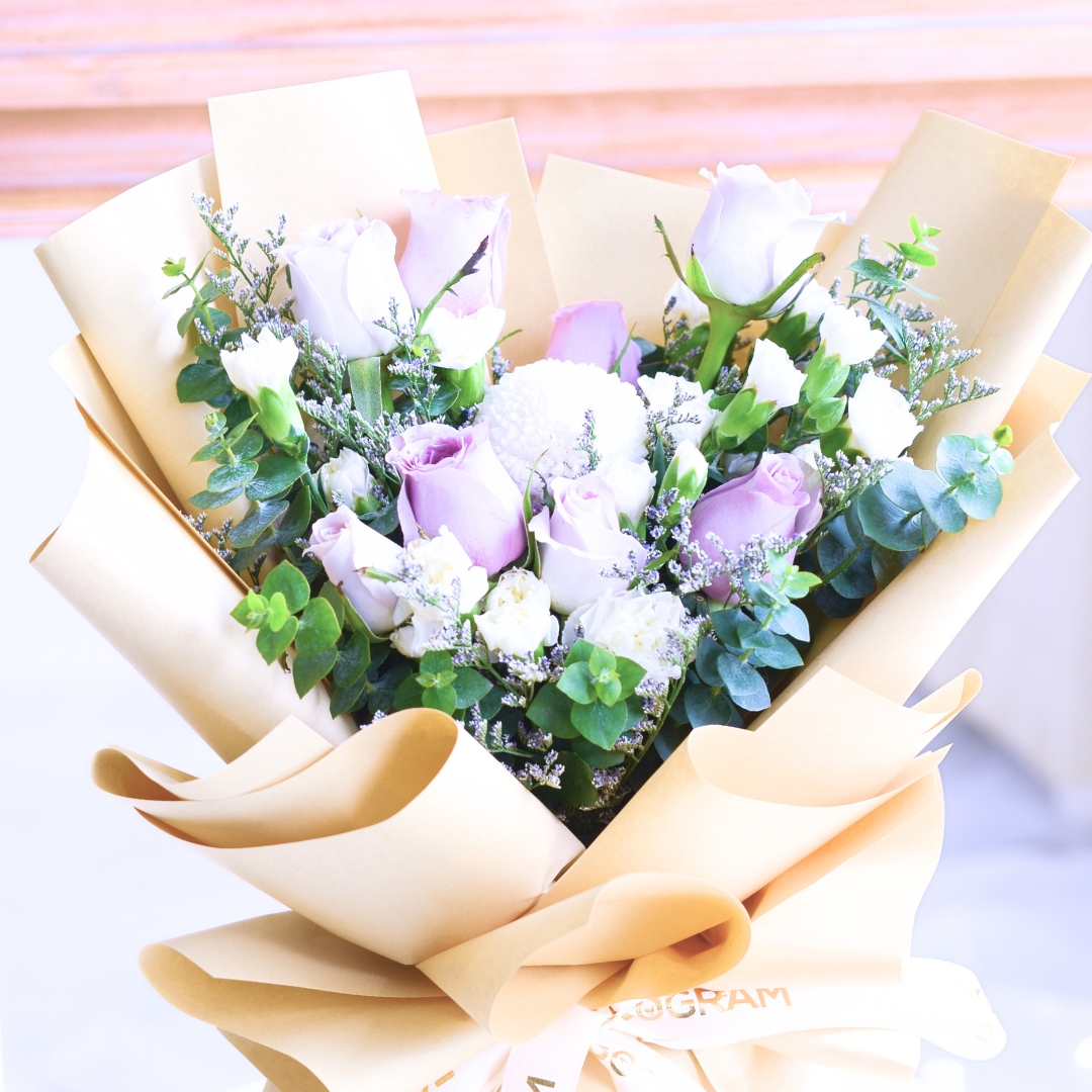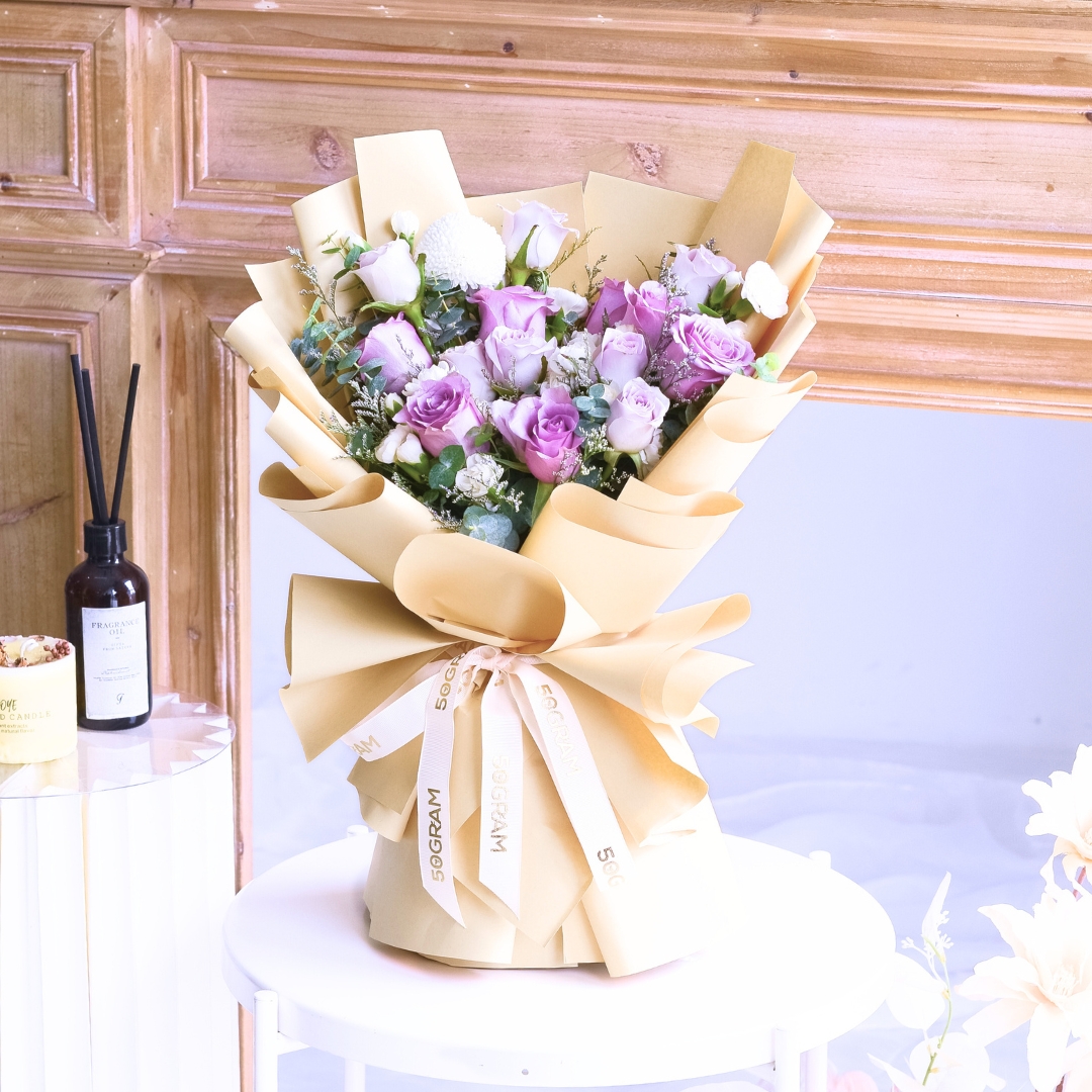 • Free Delivery in KL & PJ: Enjoy the convenience of complimentary delivery within Kuala Lumpur and Petaling Jaya. We ensure that your blush purple roses hand bouquet is carefully delivered, guaranteeing the recipient receives a stunning arrangement that will enchant and delight their senses.