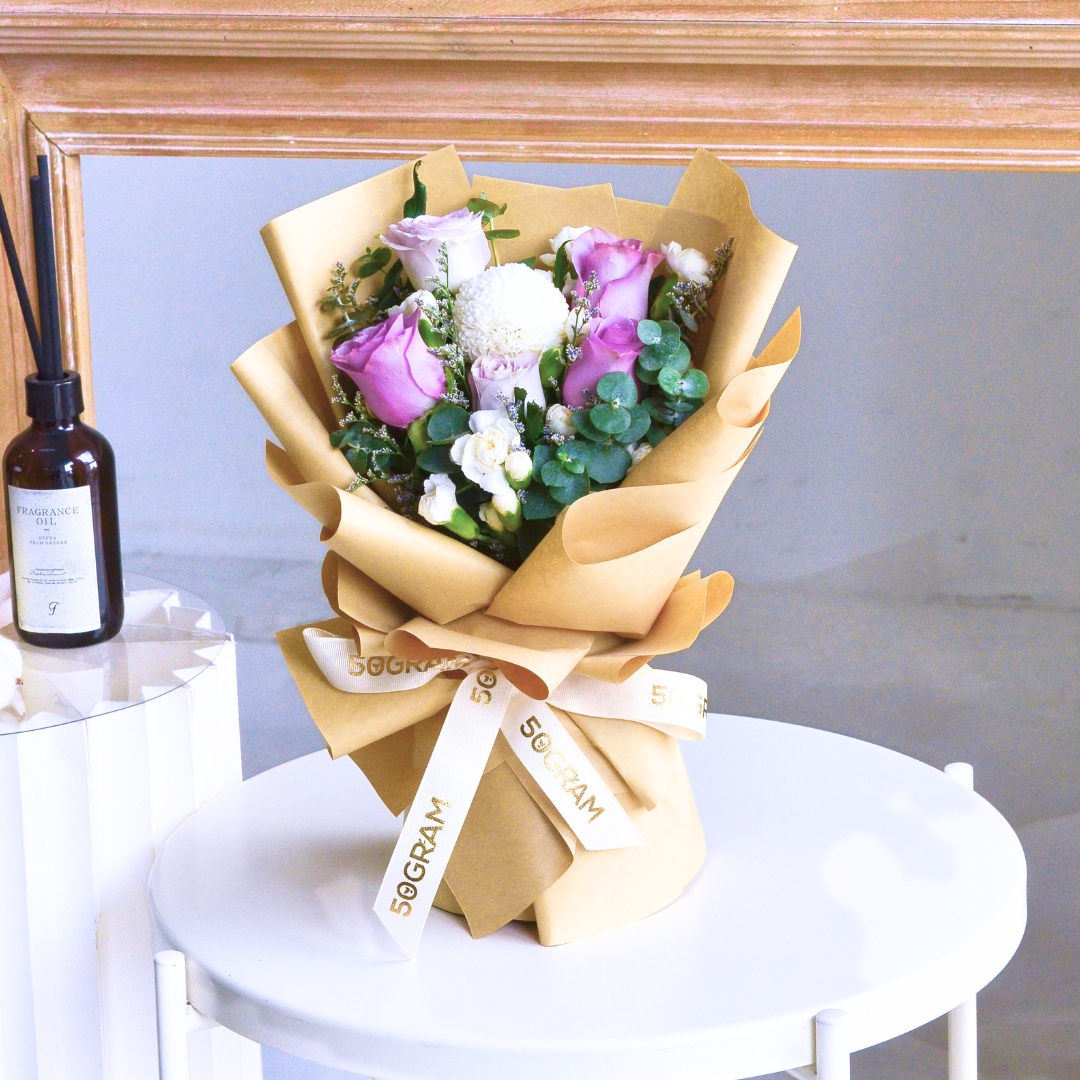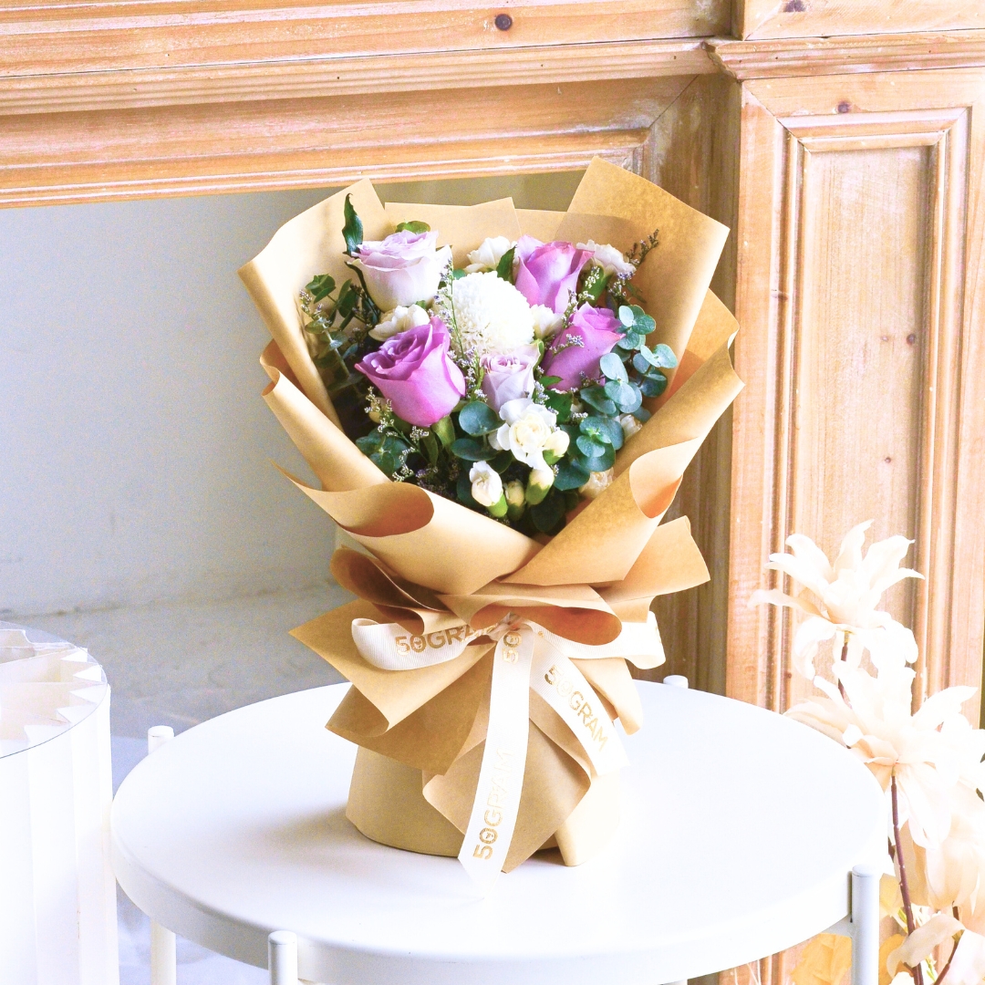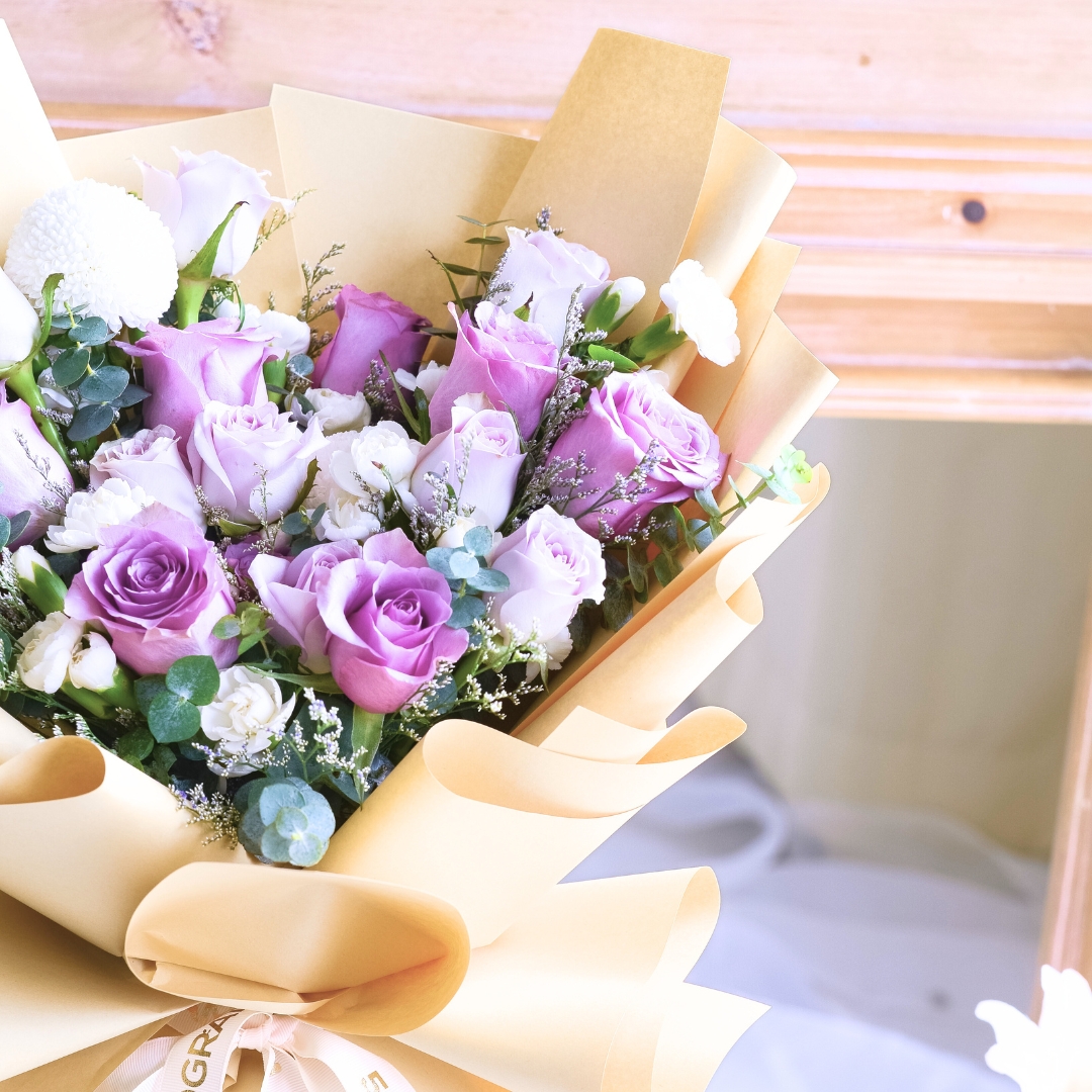 • Free Delivery in KL & PJ: Enjoy the convenience of complimentary delivery within Kuala Lumpur and Petaling Jaya. We ensure that your blush purple roses hand bouquet is carefully delivered, guaranteeing the recipient receives a stunning arrangement that will enchant and delight their senses.
