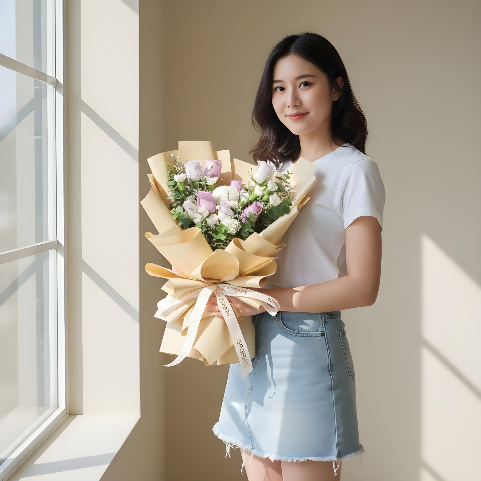 • Elegant Purple Roses: The hand bouquet showcases the timeless beauty of purple roses, symbolizing enchantment and grace. The velvety petals and rich hues create an air of sophistication, making them perfect for conveying admiration and expressing deep emotions.