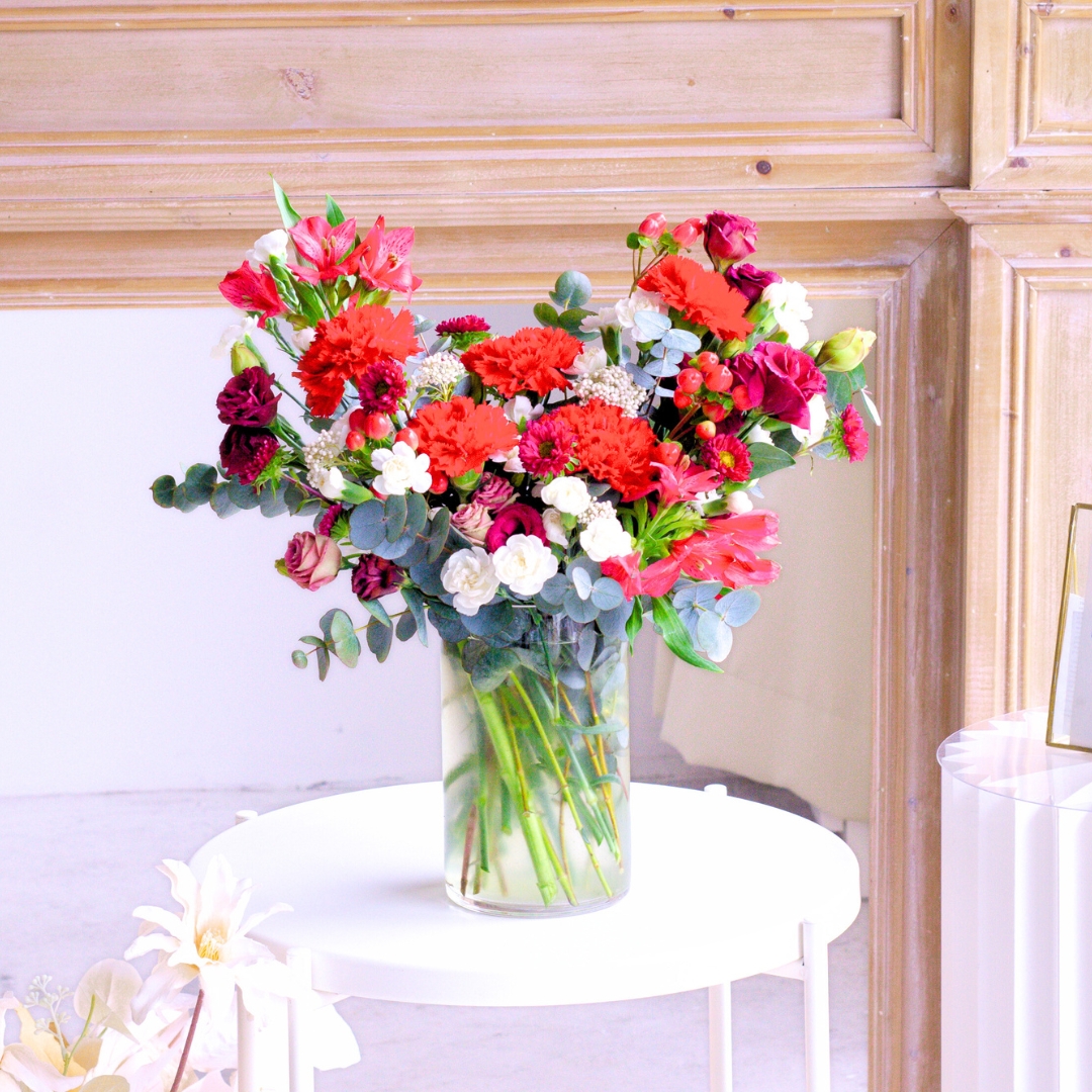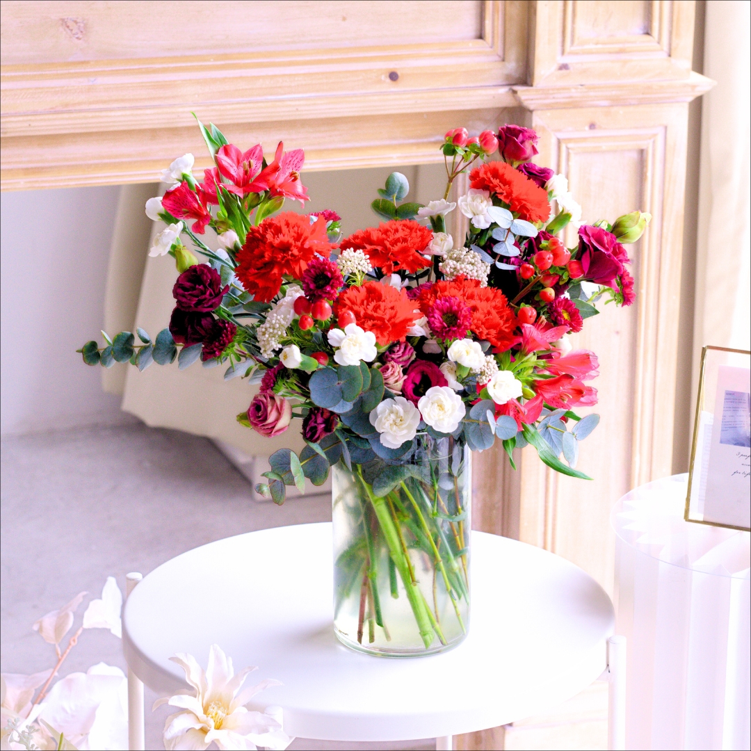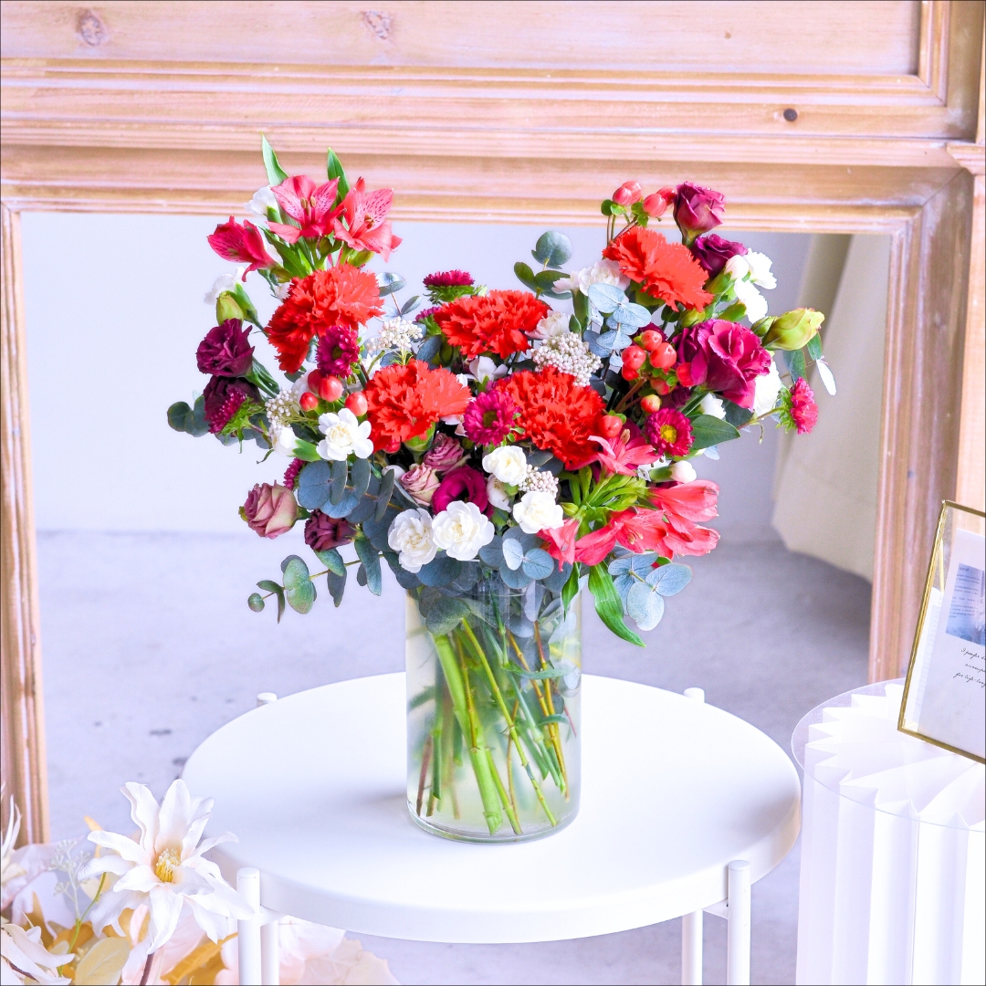 The “Burgundy Bliss Vase Flower” is an elegant and sophisticated floral arrangement that emanates a sense of richness and luxury. This exquisite vase features stunning red carnations and deep maroon eustomas, symbolizing passion, elegance, and the beauty of refined taste.