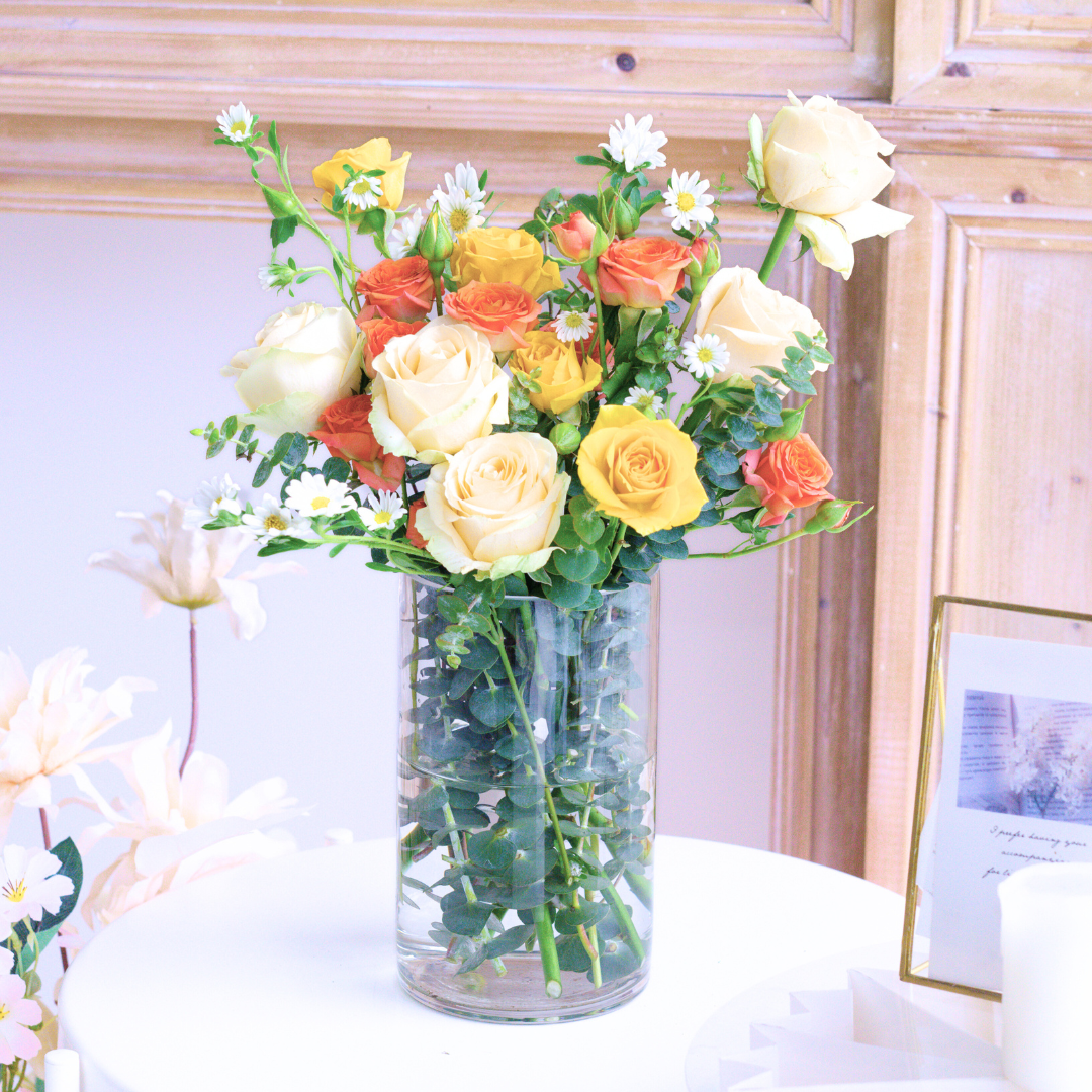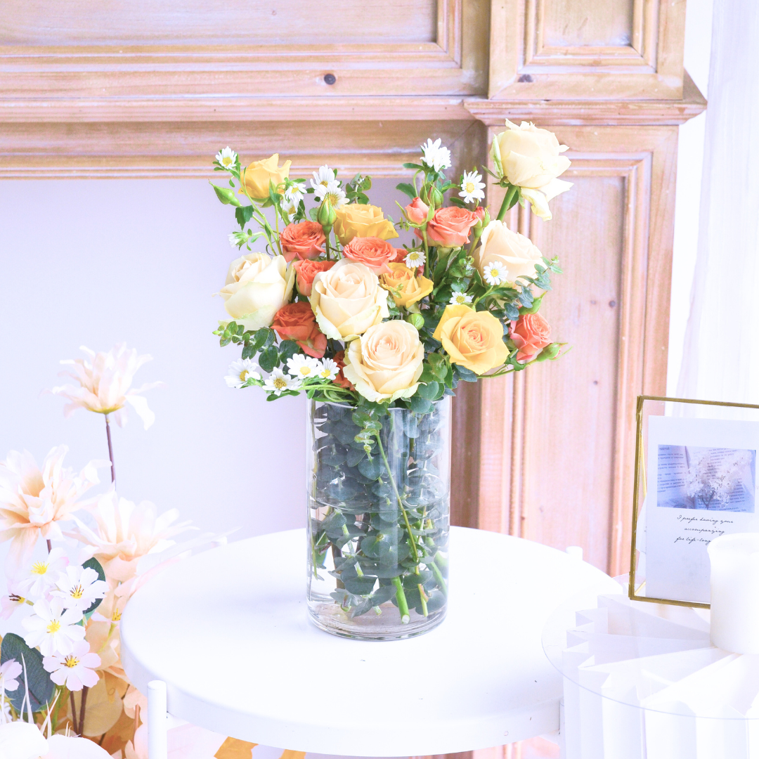 The “Champagne Infusion Vase Flower” is a captivating and unique floral arrangement that blends the sophisticated charm of champagne roses with the vibrant energy of orange roses. This bouquet is a harmonious fusion of elegance and zest, creating a visual and sensory delight.