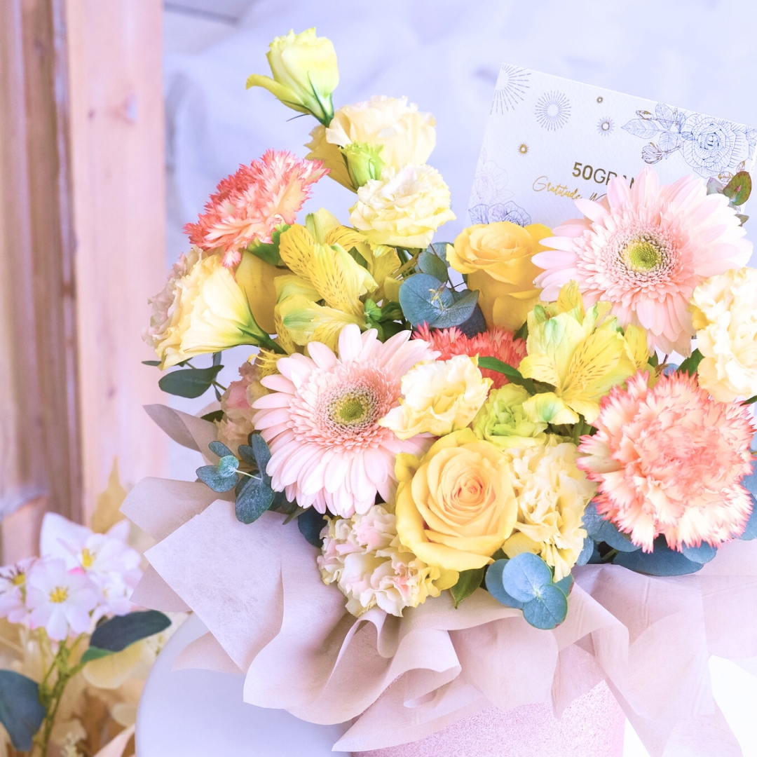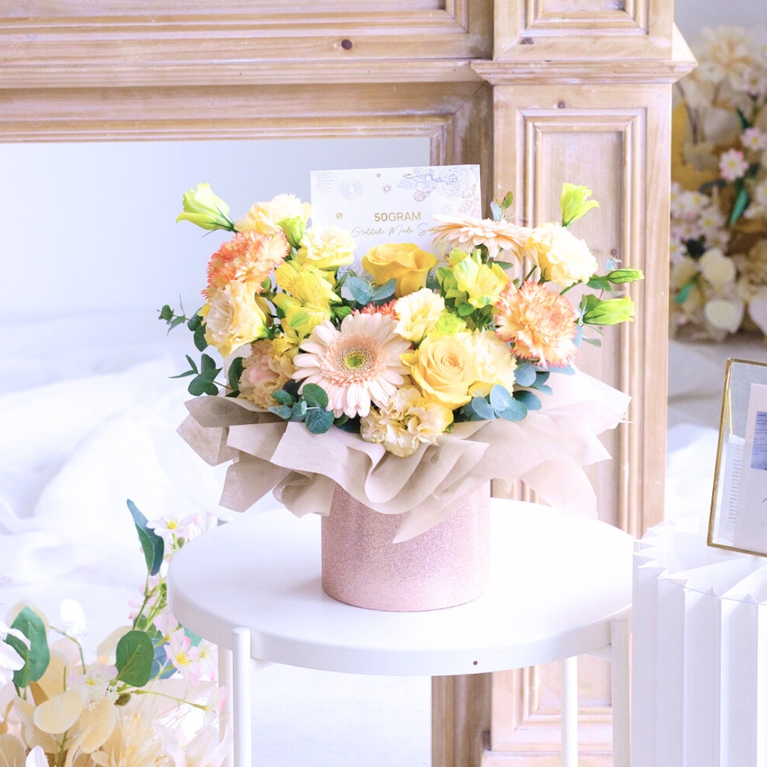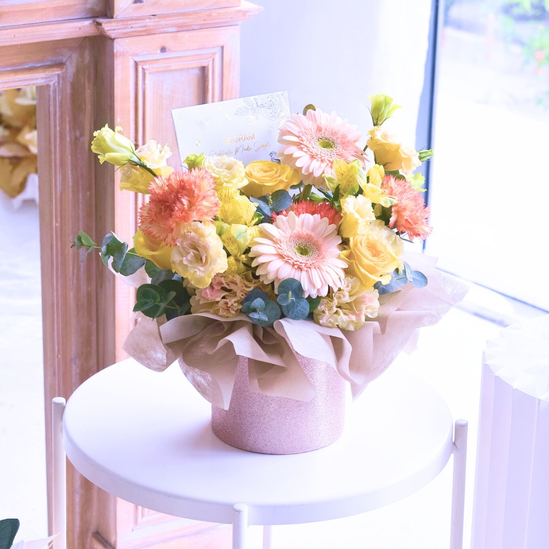 This bouquet comes with Champagne Daisy x 2, Orange Carnation x 3, Yellow Rose x 3, Alstroemeria Yellow, Champagne Eustoma &Β  Eucalyptus.