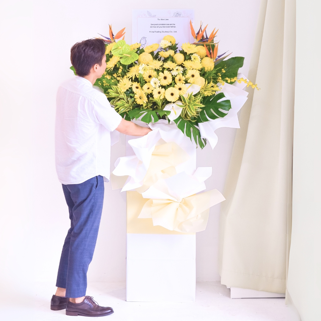 The Cherished Memories Condolences Flower Stand is a heartfelt tribute adorned with vibrant yellow daisies, yellow net mums, yellow ping pong, and yellow dancing lady orchids, symbolizing warmth and remembrance. Complemented by green anthuriums, white daisies, and the striking bird of paradise, this arrangement also features Song of Jamaica and lush green foliage. Presented on a square bottom stand and wrapped in serene white, it conveys a message of cherished memories and peace.