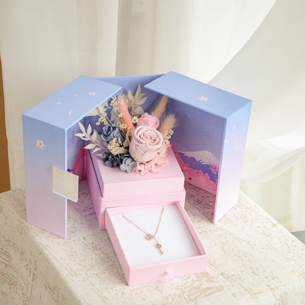 The Cherry Blossom Memory Box Preserved Box with Pink and Blue Preserved Roses is an excellent choice for weddings, anniversaries, or any other special occasion.