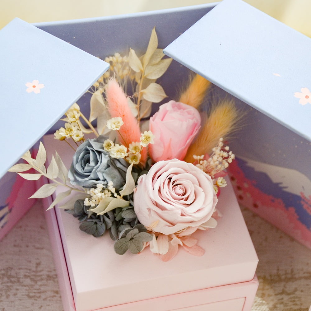 Cherry Blossom Preserved Flower Box comes with pastel colour roses, and are fitted in a Sakura-themed box.