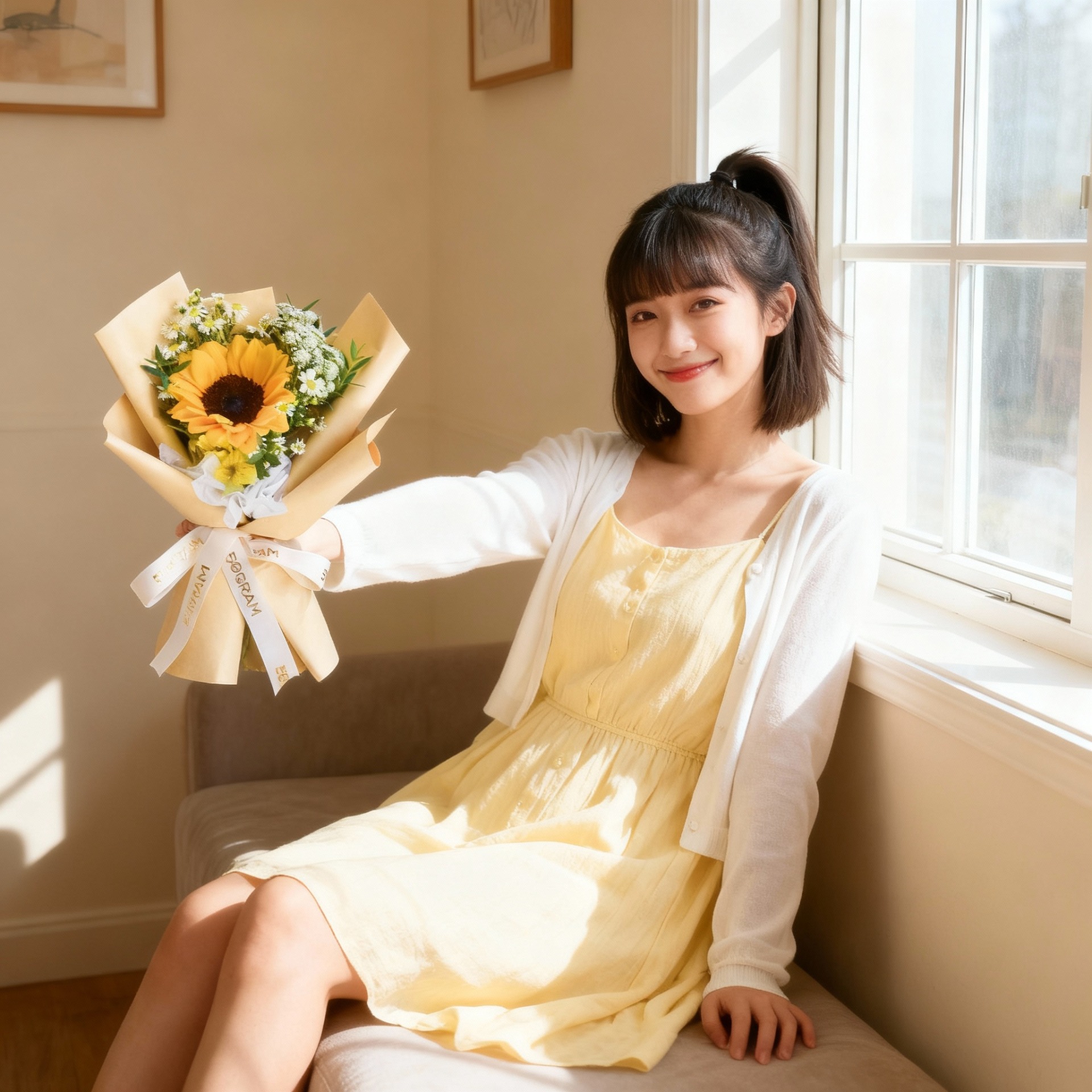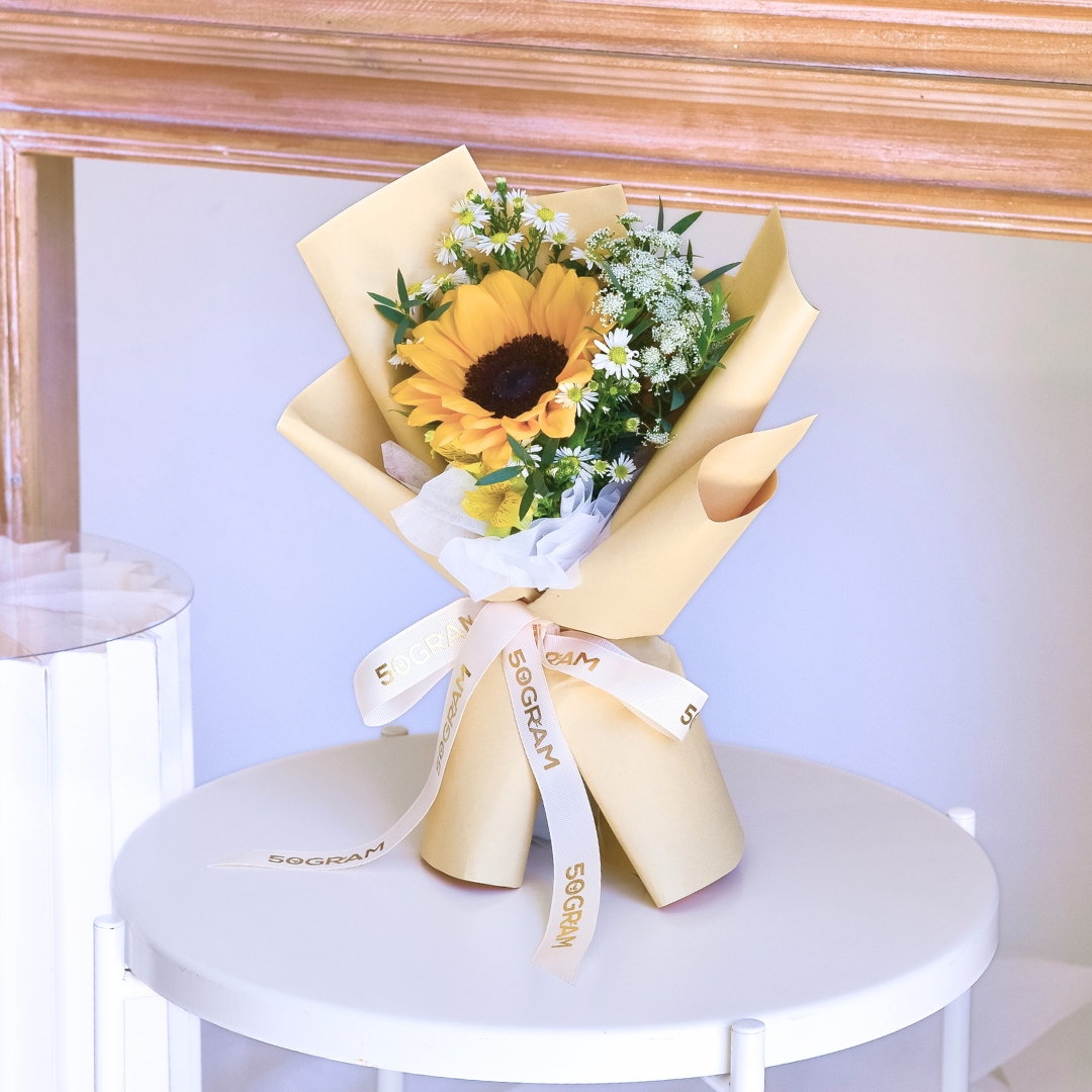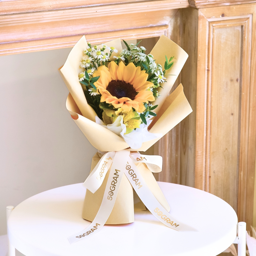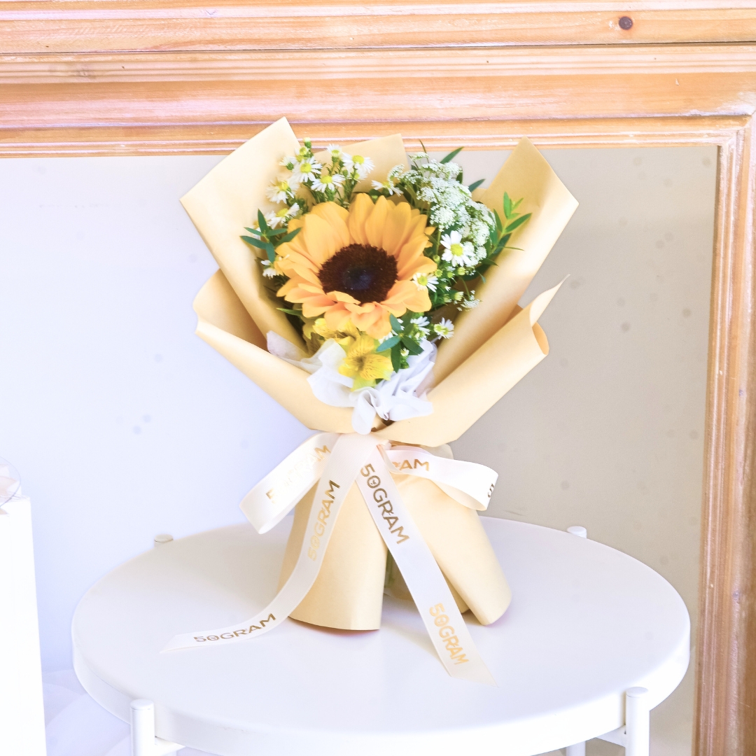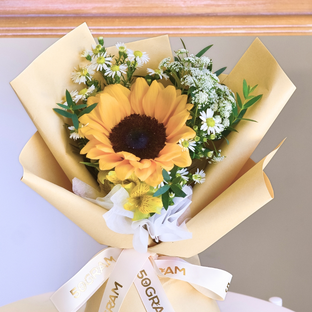 The bouquet comes with Sunflower x 1, Yellow Alstroemeria, Ammi Majus, Peacock White & Eucalyptus.