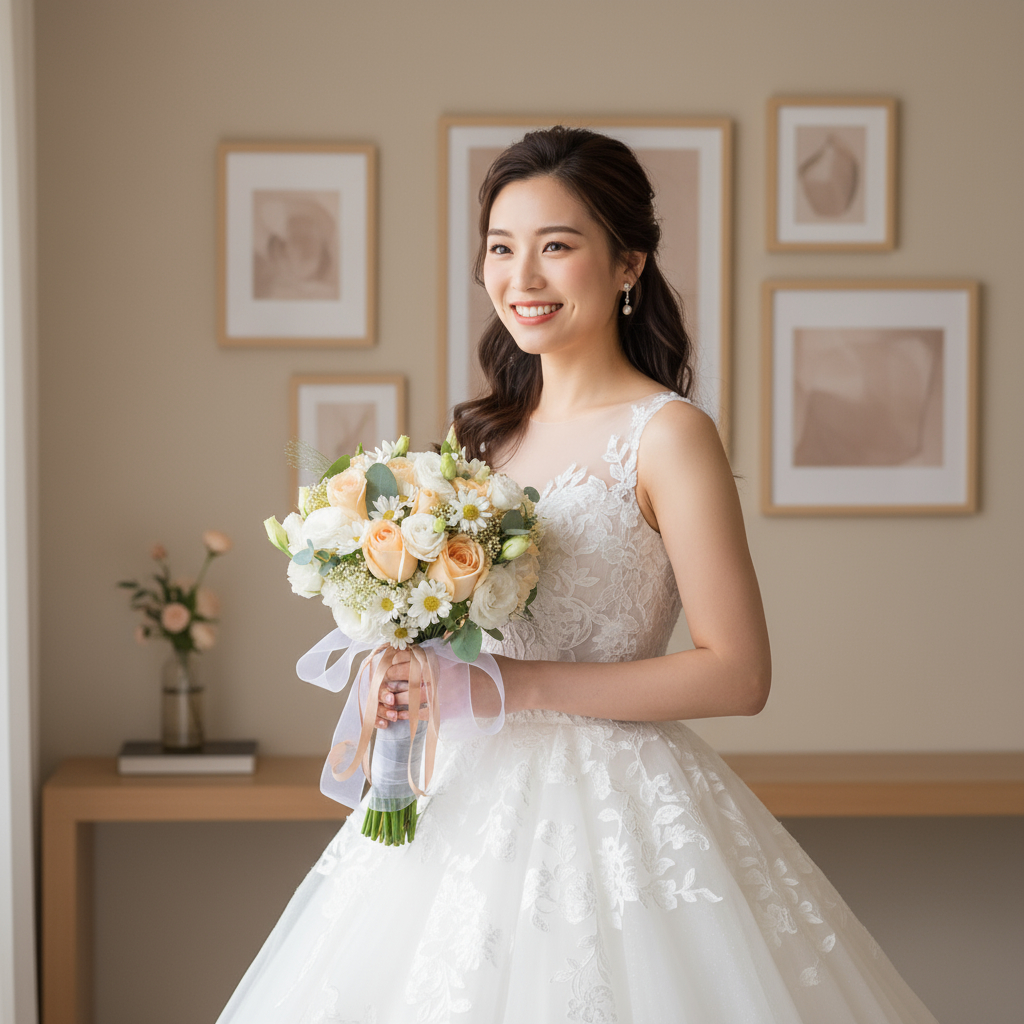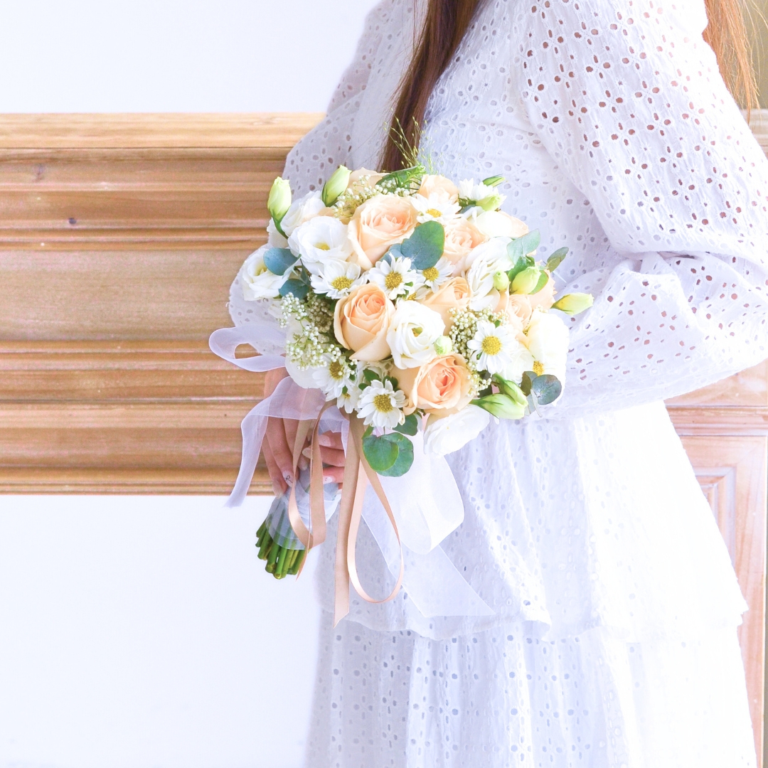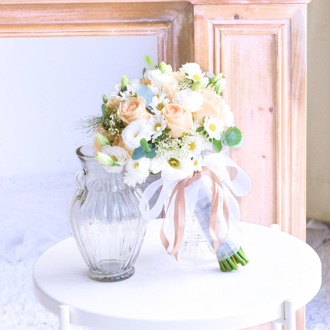 The “Creamy Radiance Bridal Bouquet” is an elegant and timeless arrangement featuring soft champagne roses, delicate white eustoma, and graceful hana white flowers. This bouquet exudes sophistication and grace, with its creamy tones and gentle textures creating a perfect, understated look for a bride who desires a classic and refined appearance on her special day. š¹š¤š