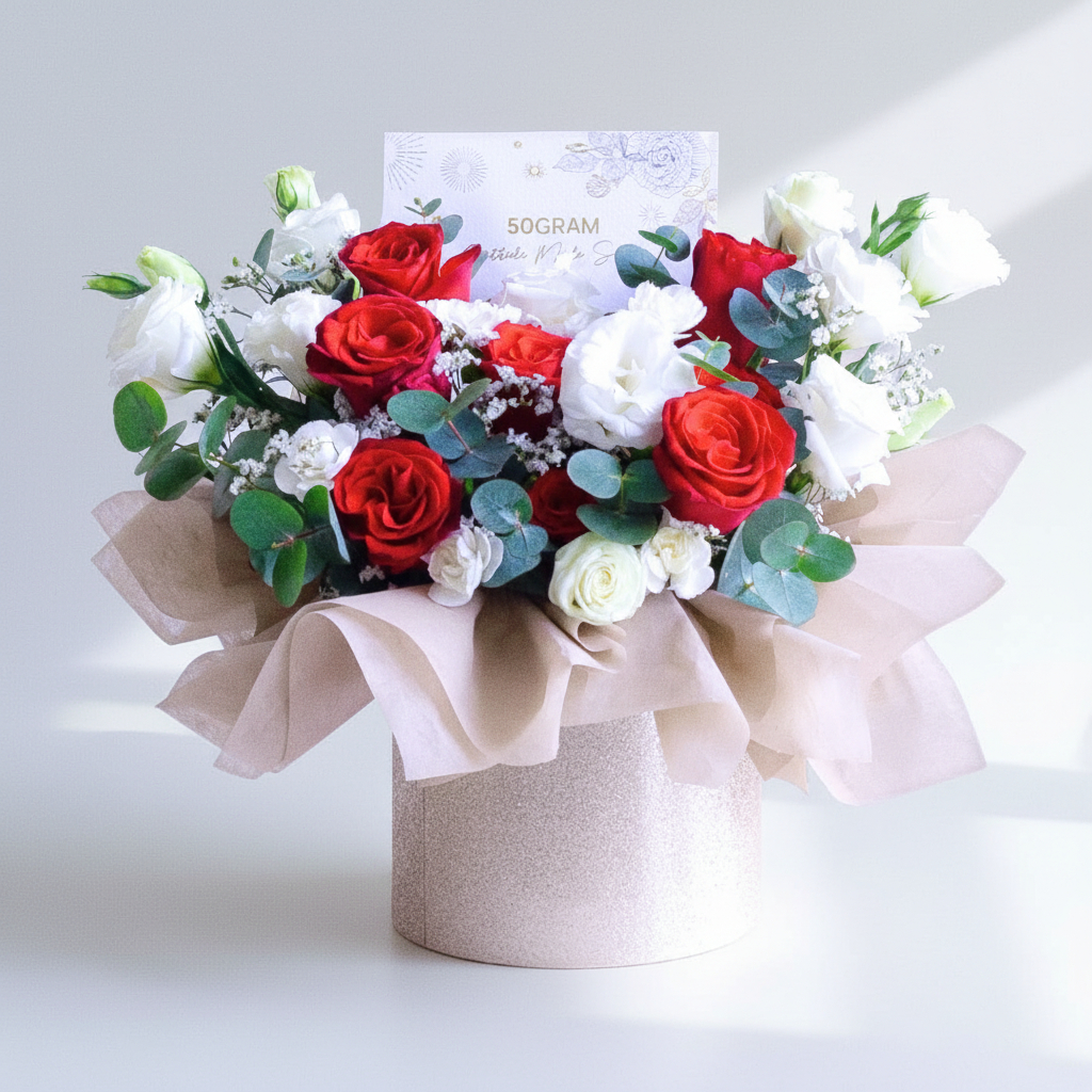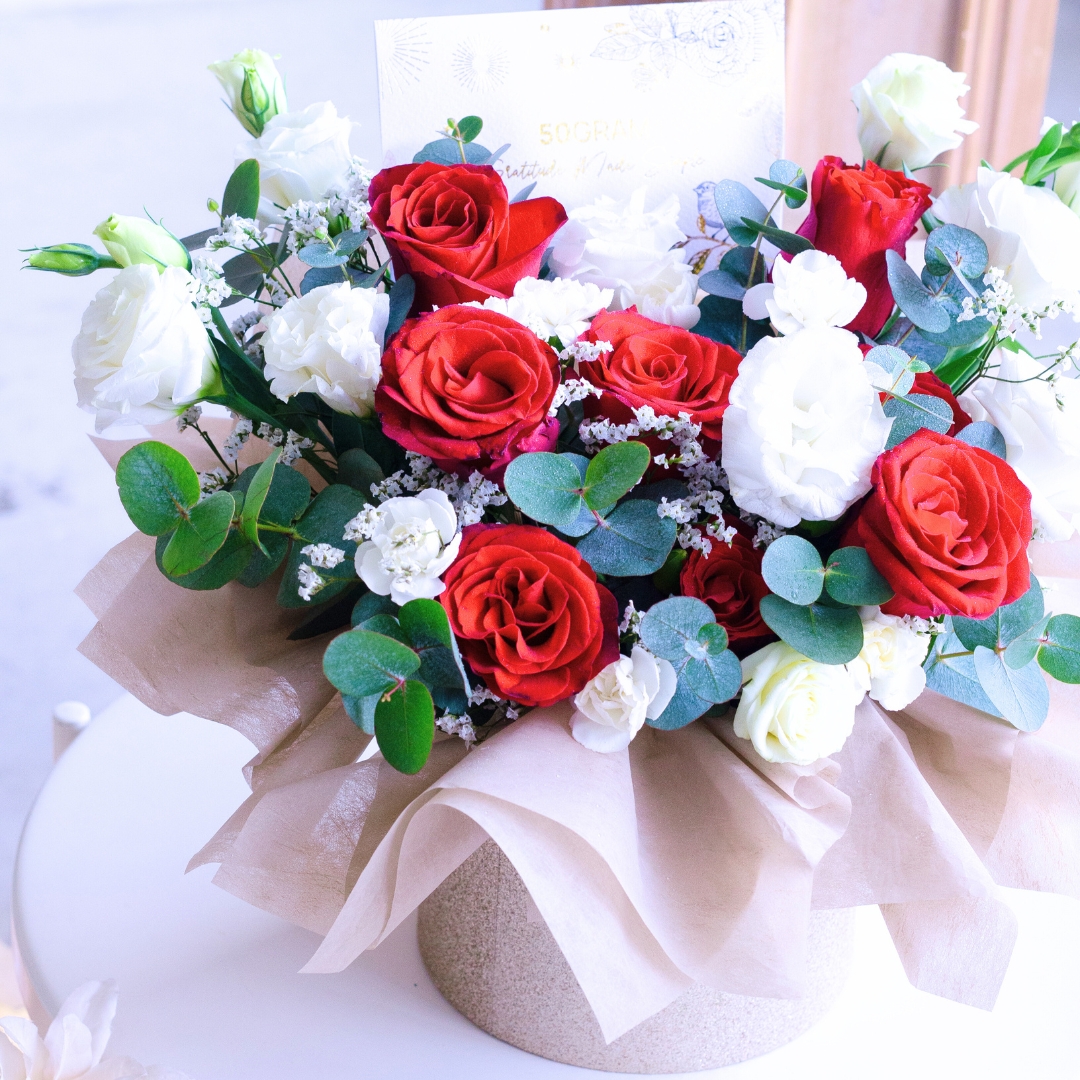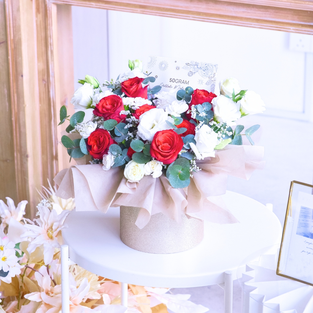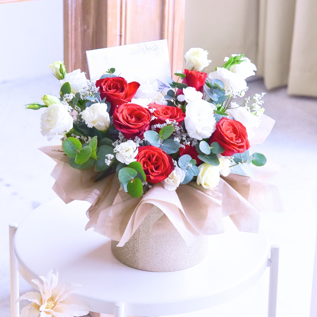 This flower box comes with Kenya Red Rose x 7, White Eustoma, White Caspia, Spray Carnation Pink & Eucalyptus.