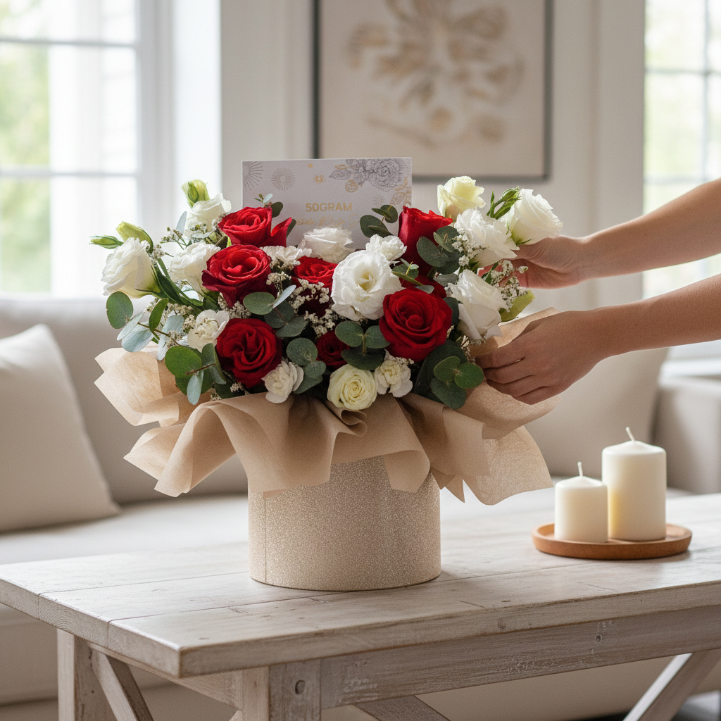 The red roses, with their rich and velvety petals, evoke feelings of passion, devotion, and eternal commitment. As the quintessential symbol of love, each rose in the arrangement speaks volumes, conveying heartfelt sentiments and igniting the flame of romance.