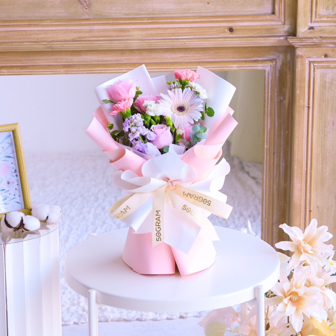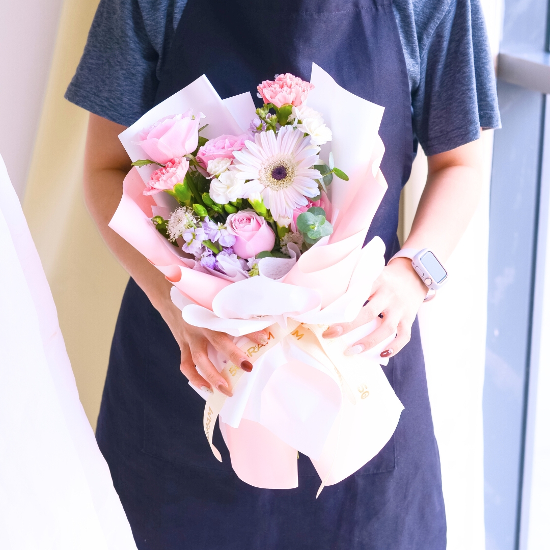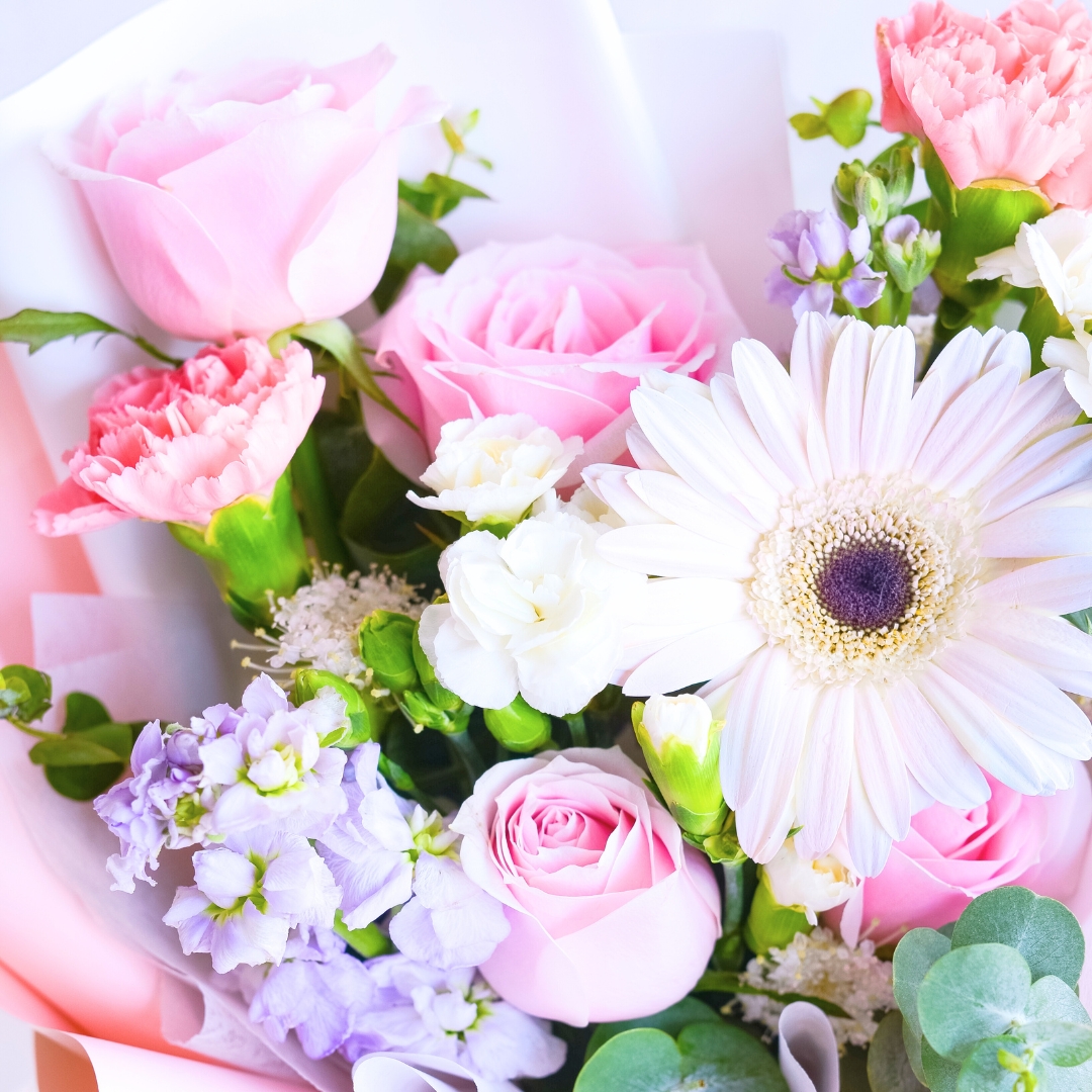 This Regular size bouquet comes with Pink Rose x 4, White Daisy x 1, Lilac Matthiola x 2, Pink Carnation x 2, Mini White Carnation, Laced Flower & Eucalyptus.