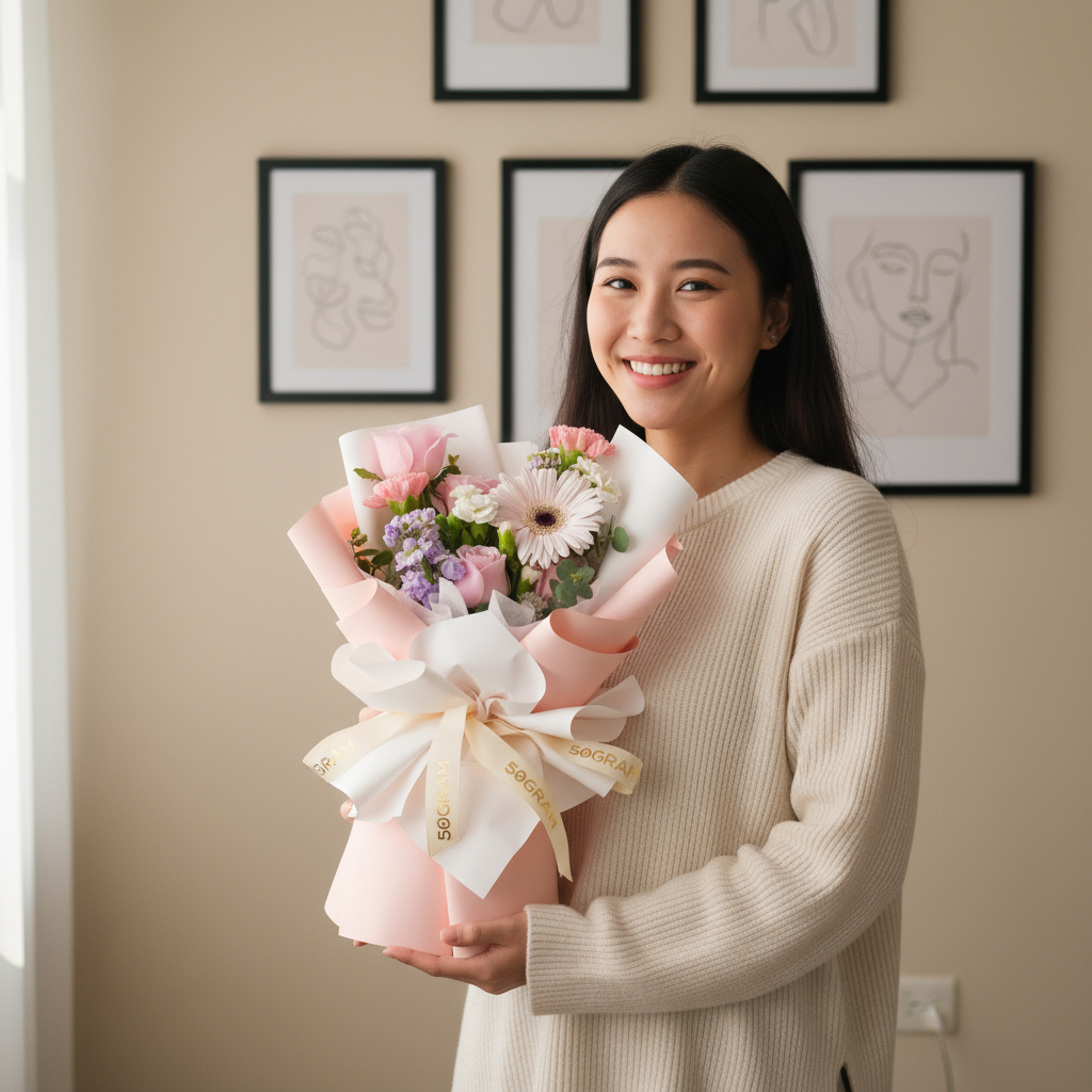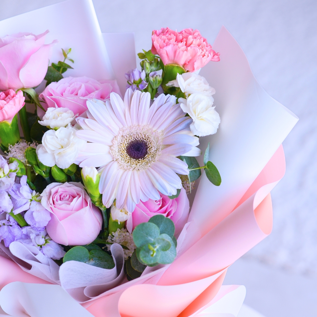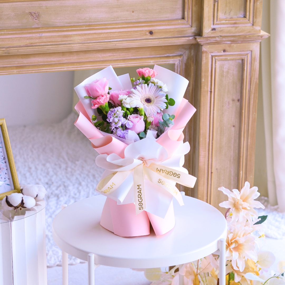 This Regular size bouquet comes with Pink Rose x 4, White Daisy x 1, Lilac Matthiola x 2, Pink Carnation x 2, Mini White Carnation, Laced Flower & Eucalyptus.