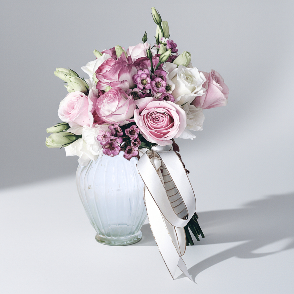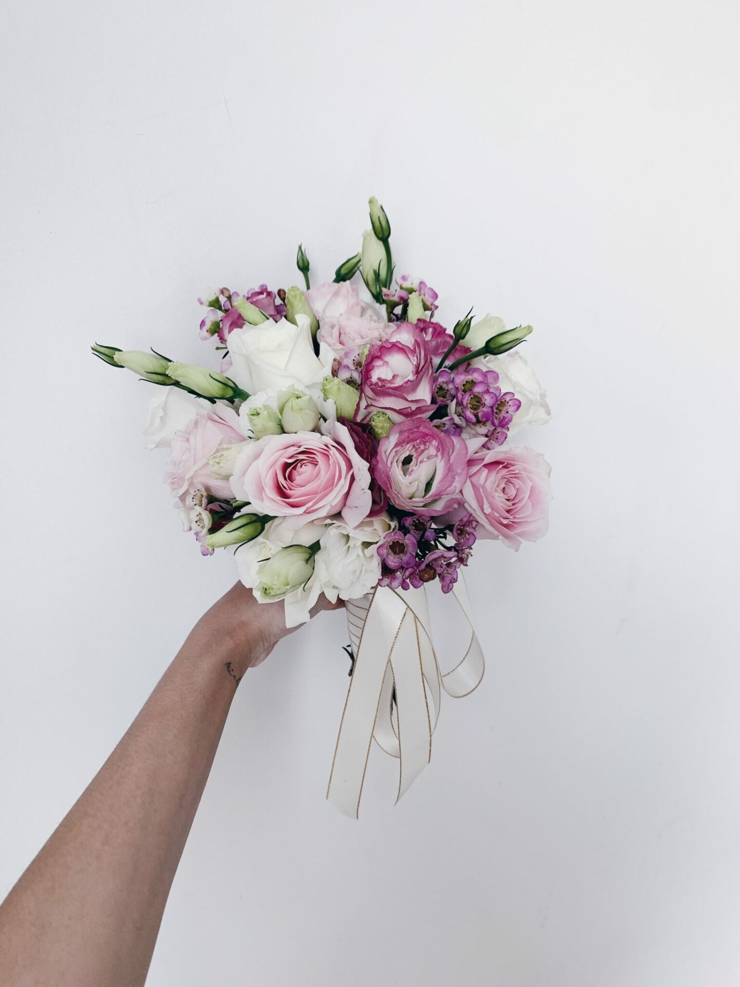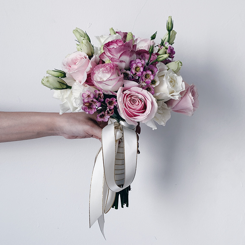 Delilah come with 7 pink roses, 5 white roses, 5 wax flowers, 5 pink-white eustomas, & 4 white eustomas.