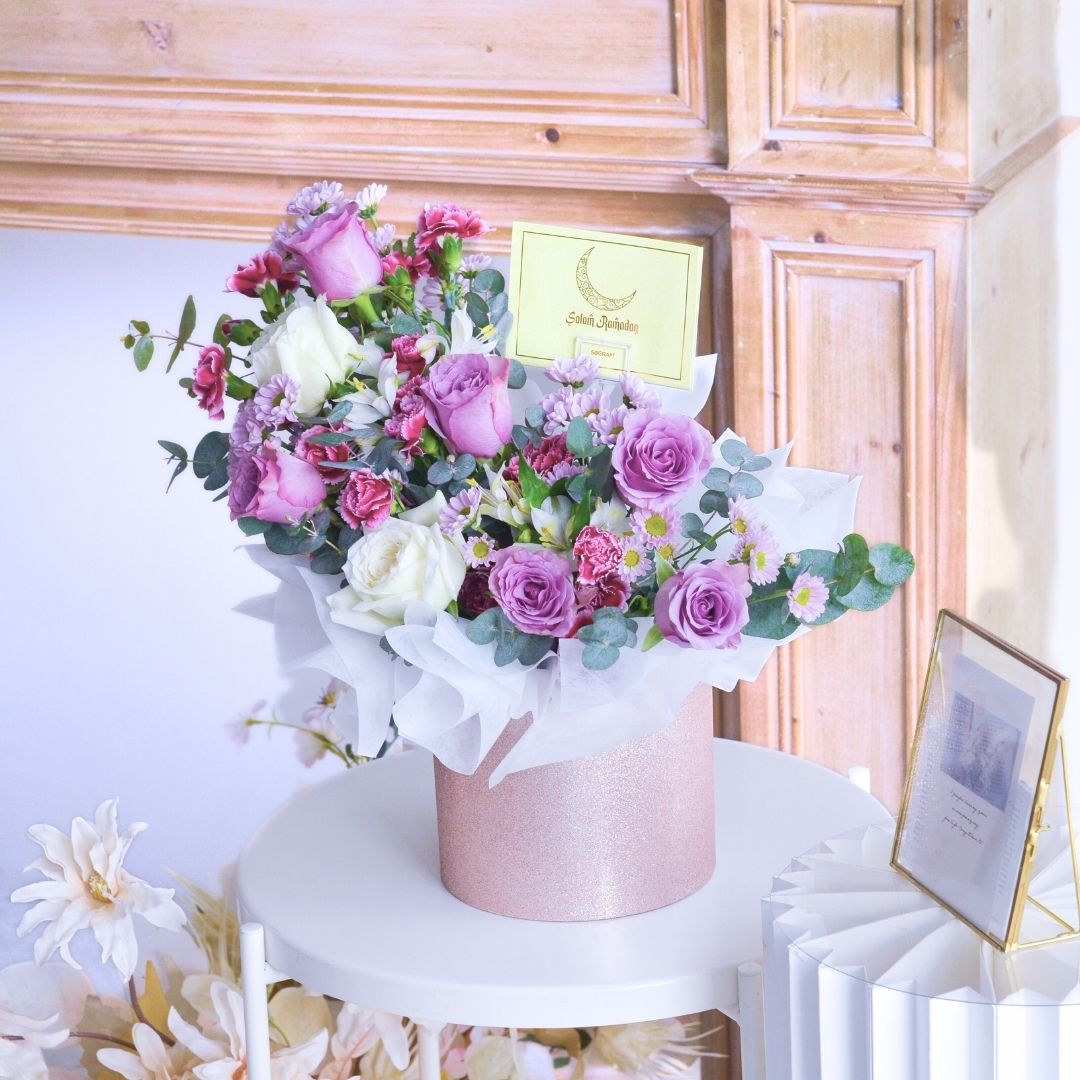 The “Eid Elegance Ramadan Flower Box” is a sophisticated and graceful floral arrangement designed to celebrate the joyous occasion of Eid during Ramadan. This exquisite flower box features a harmonious blend of purple and white roses, symbolizing elegance, purity, and the spiritual significance of the season.