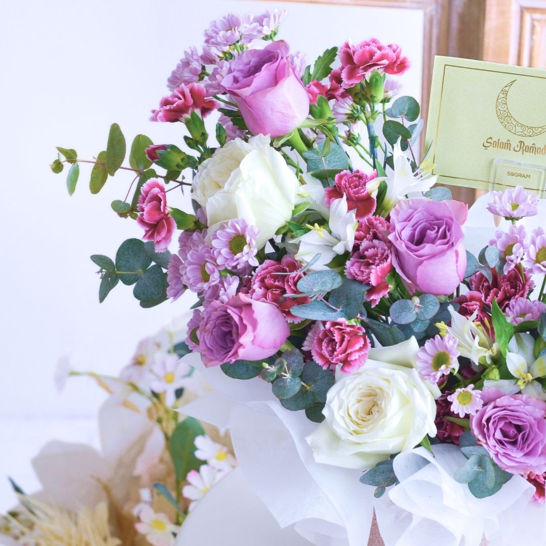 The deep purple roses convey a sense of regality, spirituality, and the profound connection to the divine. Paired with the pristine white roses, representing purity and peace, the bouquet becomes a visual ode to the spiritual journey of Ramadan.