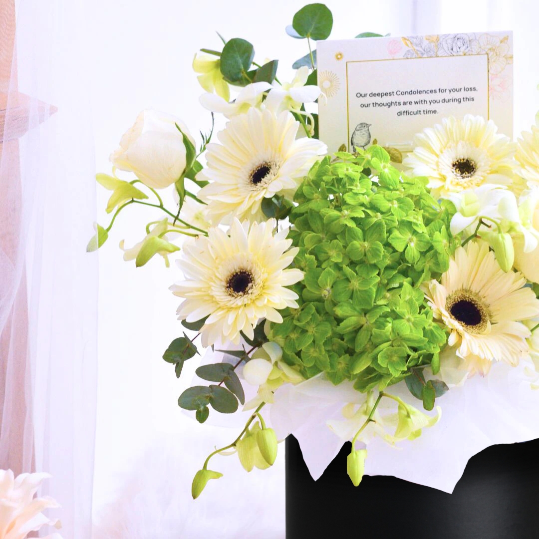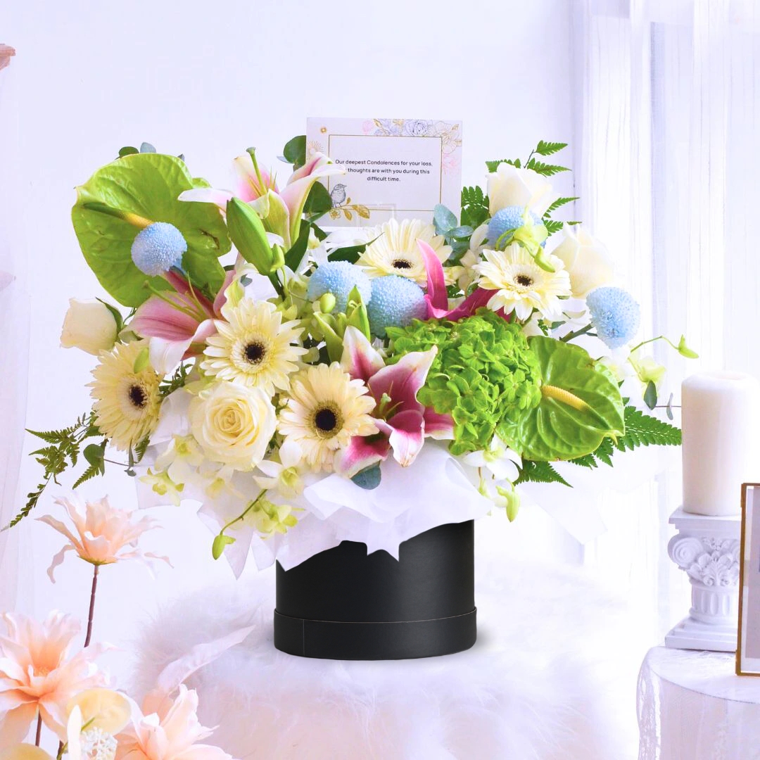 The Emerald Solace Memorial Flower Box is a poignant expression of condolences. It’s thoughtfully curated with an array of flowers including green hydrangeas, white gerberas, roses, and ping pong flowers, along with striking pink lilies and elegant white orchids. The rare green anthuriums add an exotic touch, while the verdant paku and cineraria leaves provide a lush backdrop. This green-themed condolence flower box, presented on a stand, offers a respectful tribute and a comforting presence during times of sorrow.