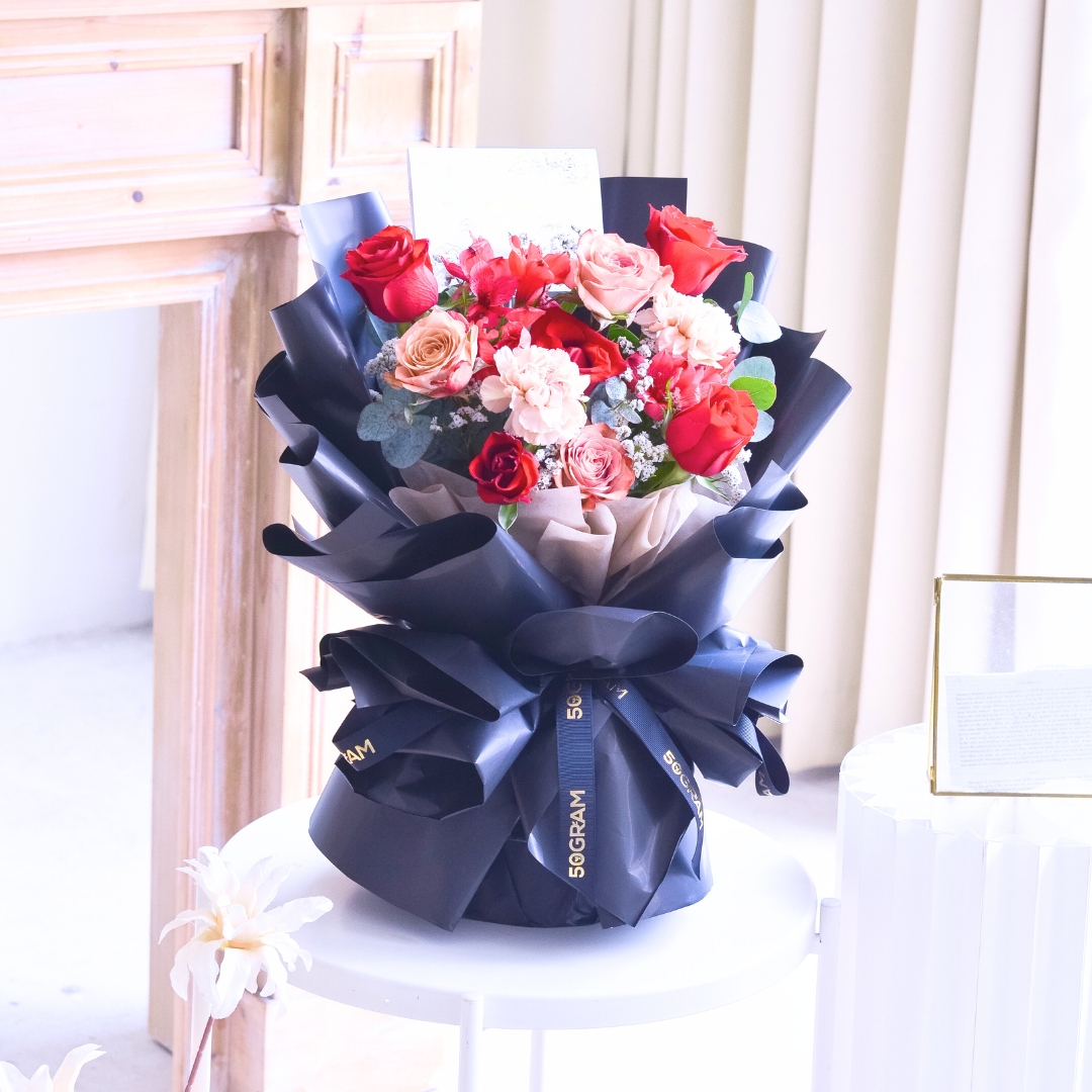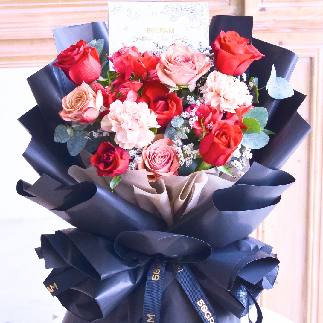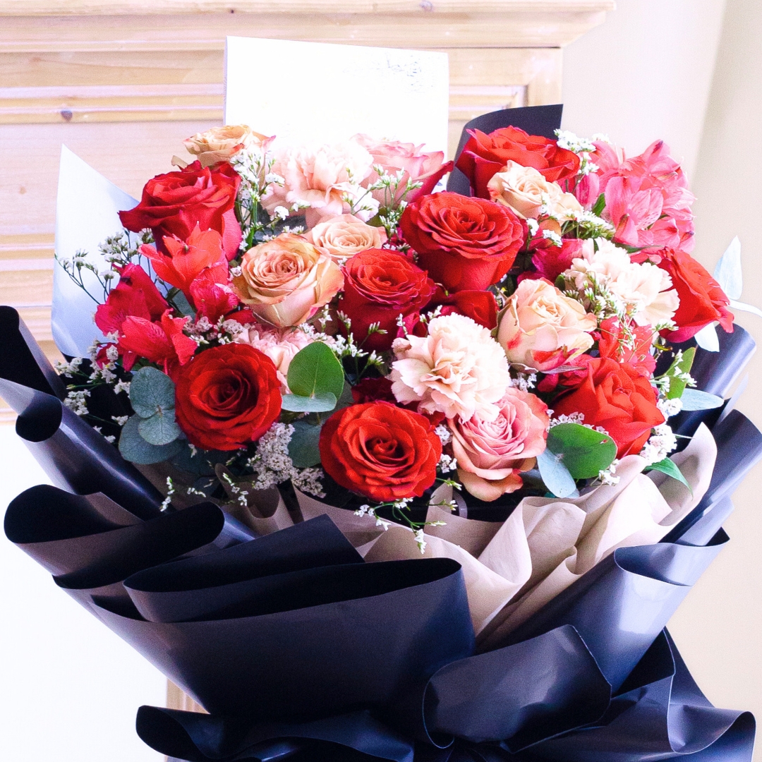 This Medium size comes with Kenya Red Rose x 5, Cappuccino Rose x 3, Dusty Carnation x 2, Alstroemeria Red, White Caspia & Eucalyptus.