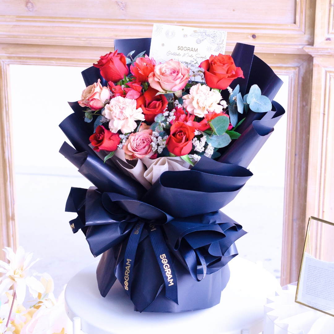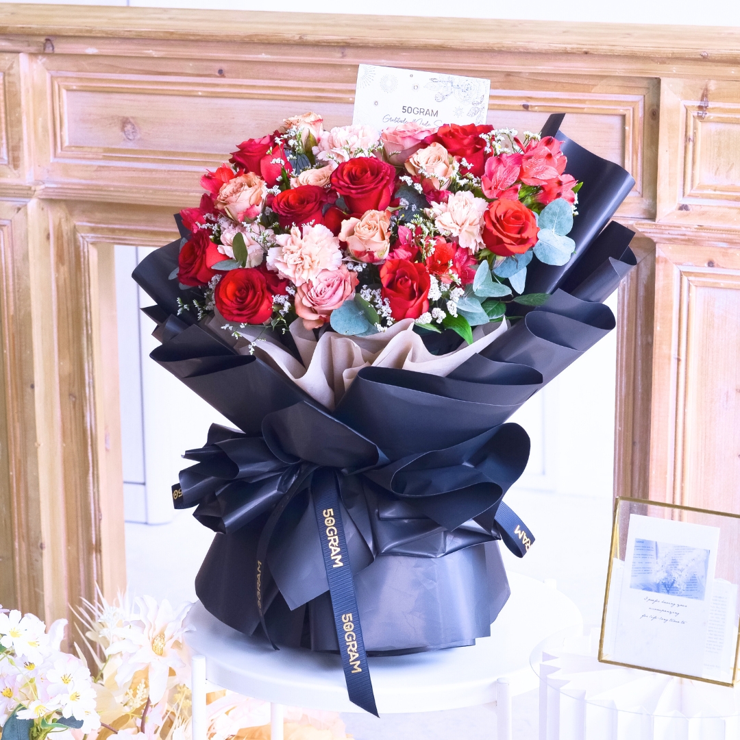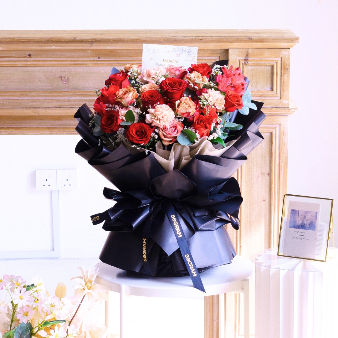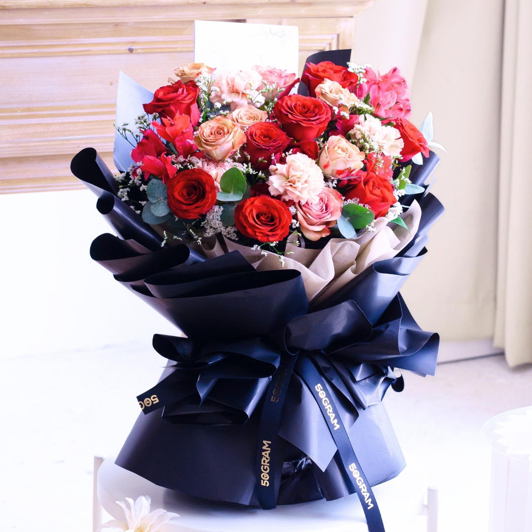 This Medium size comes with Kenya Red Rose x 5, Cappuccino Rose x 3, Dusty Carnation x 2, Alstroemeria Red, White Caspia & Eucalyptus.