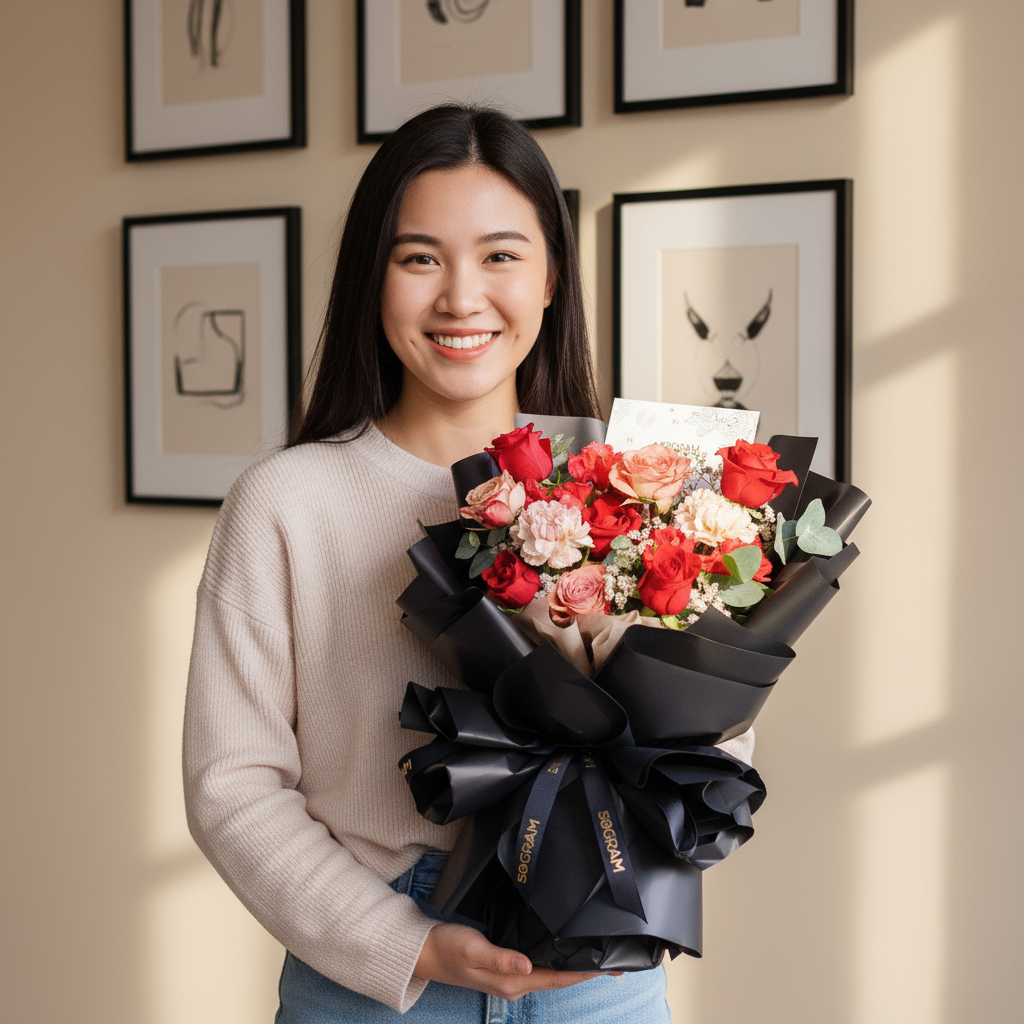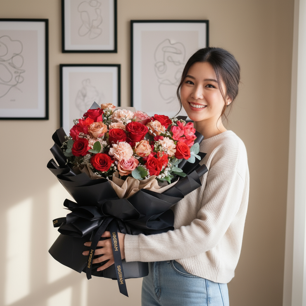 The “Endless Devotion 520 Day Pink Rose Hand Bouquet” is a captivating and heartfelt floral arrangement designed to convey endless love and devotion on “I Love You Day.” This exquisite hand bouquet features passionate red roses, sophisticated cappuccino roses, and delicate dusty carnations, symbolizing deep affection, admiration, and enduring commitment.
