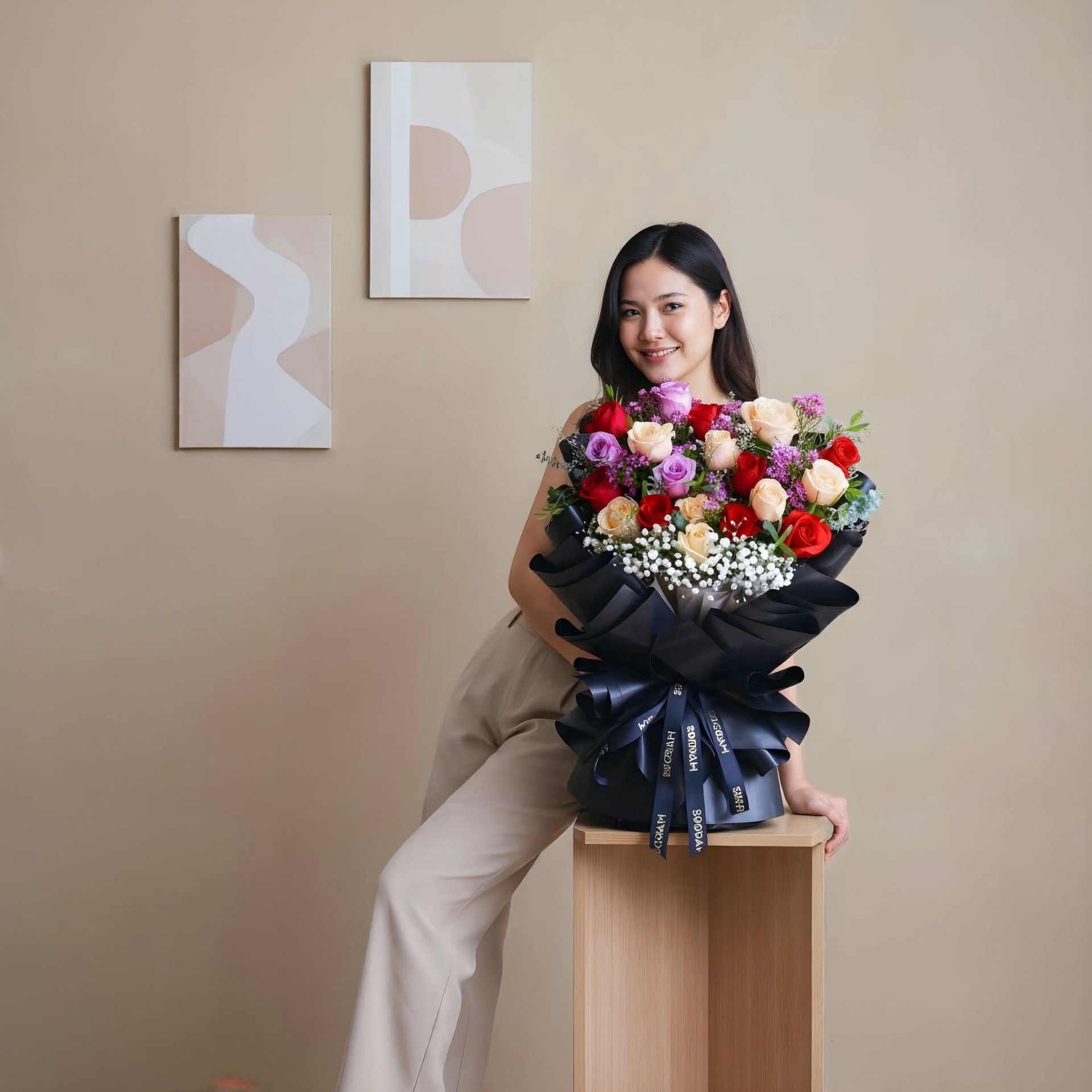Mixing different rose colours into a bouquet is a personalized way to combine many messages into one display. Mixing red, champagne and purple roses could mean gratitude and adoration. Sending a message through rose colour meanings is an extraordinary way to share your true feelings.