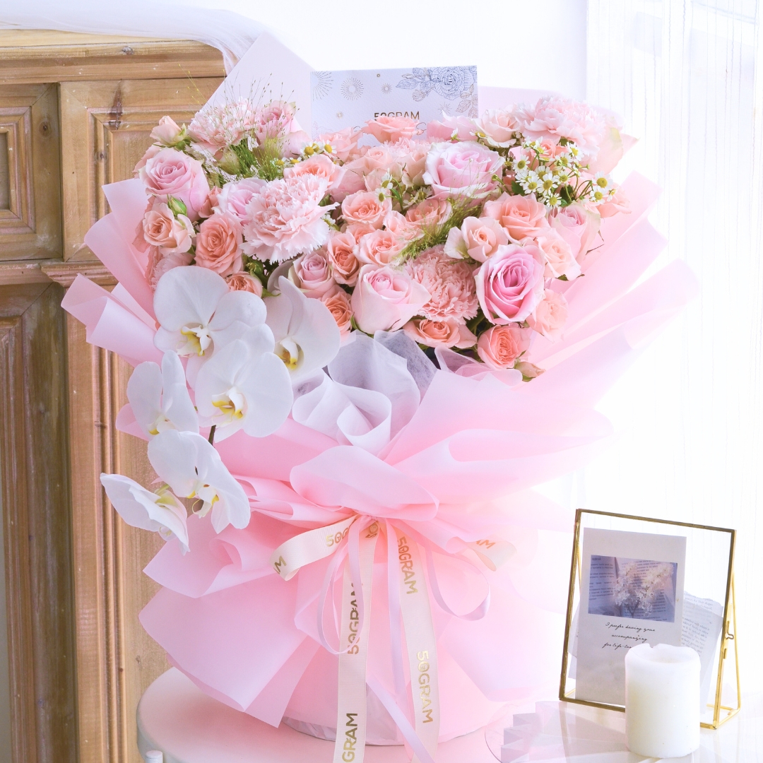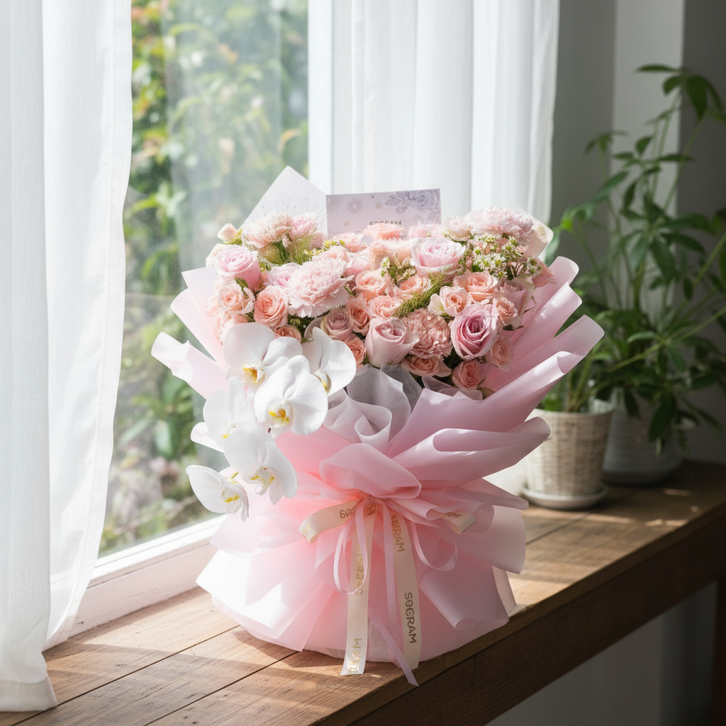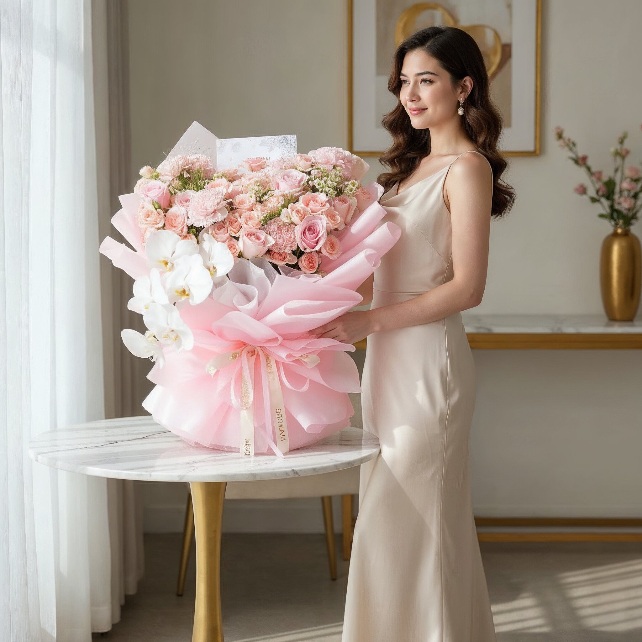 The “Exquisite Elegance Hand Bouquet” is a refined and graceful arrangement that combines soft pink roses and mini pink roses with delicate pink carnations. Enhanced by the airy texture of panicum fountain and the stunning white phalaenopsis orchid, this bouquet exudes sophistication and charm. Perfect for expressing admiration and elegance, it symbolizes beauty, grace, and the timeless allure of exquisite blooms. πŸŒΈπŸ’–πŸ€πŸŒΏ