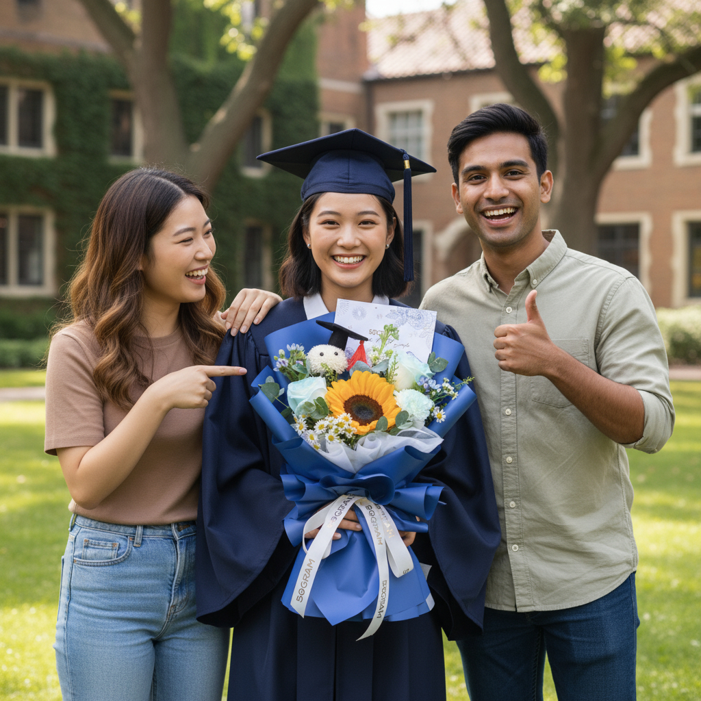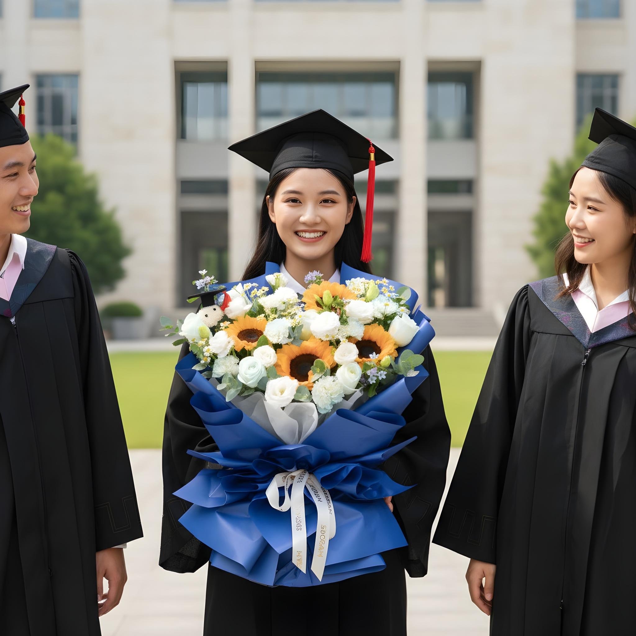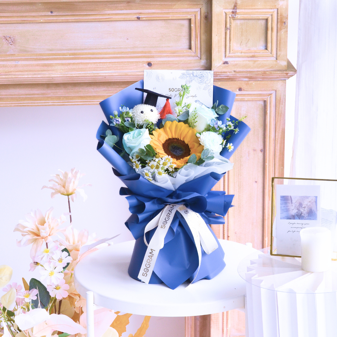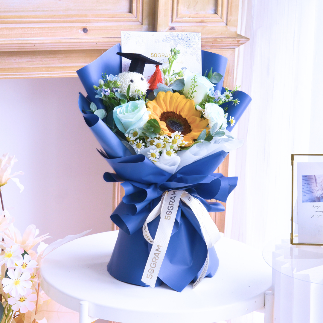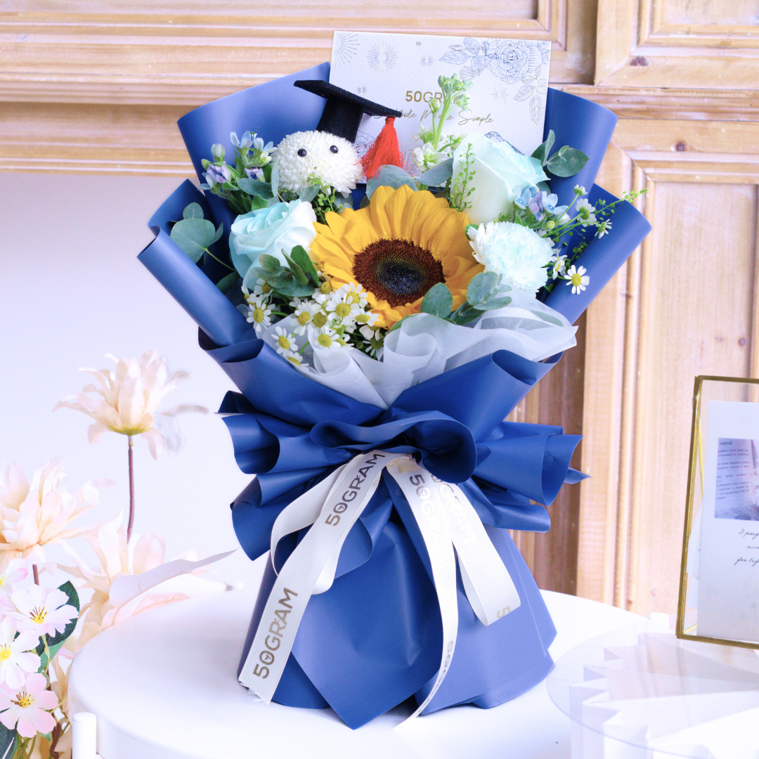 Wrapped in a beautiful shade of blue, which conveys tranquility and depth, the “Floral Milestone” is not just a bouquet; it’s a visual testament to the graduate’s hard work and dedication. It’s the perfect gift to celebrate an academic achievement and the beginning of a new phase in life. This arrangement represents the graduate’s journey and the exciting milestones that lie ahead, encapsulating the sentiment of the occasion in every petal and every shade of blue.