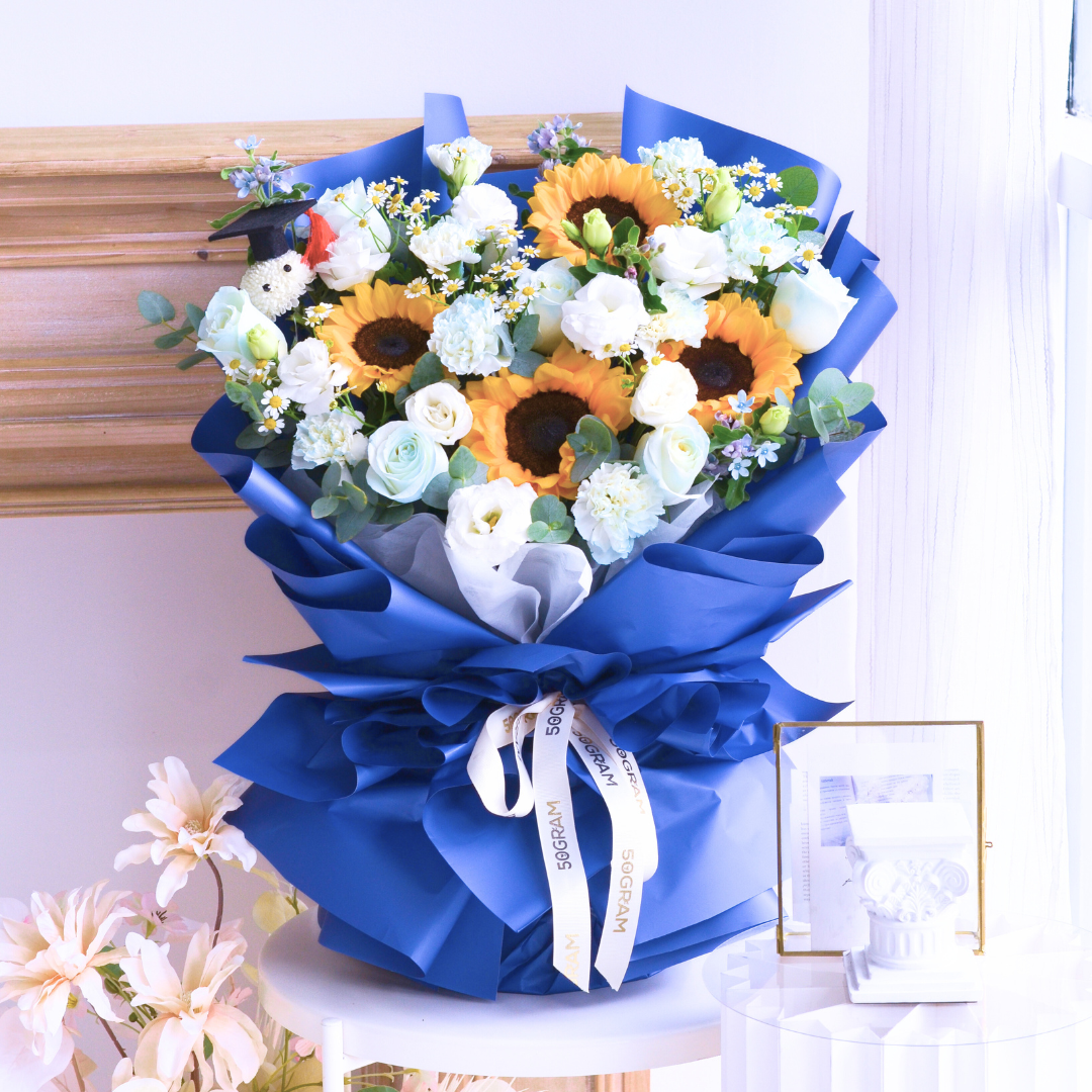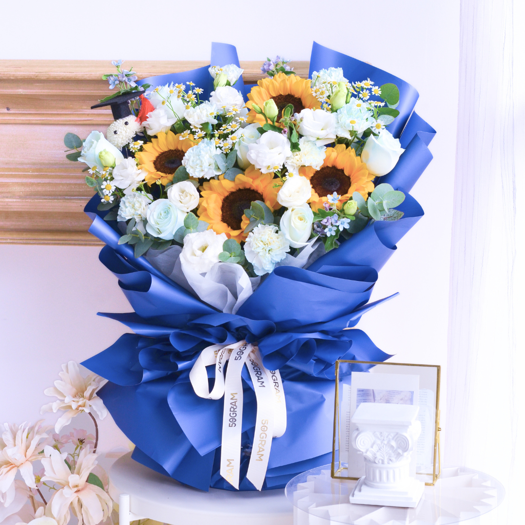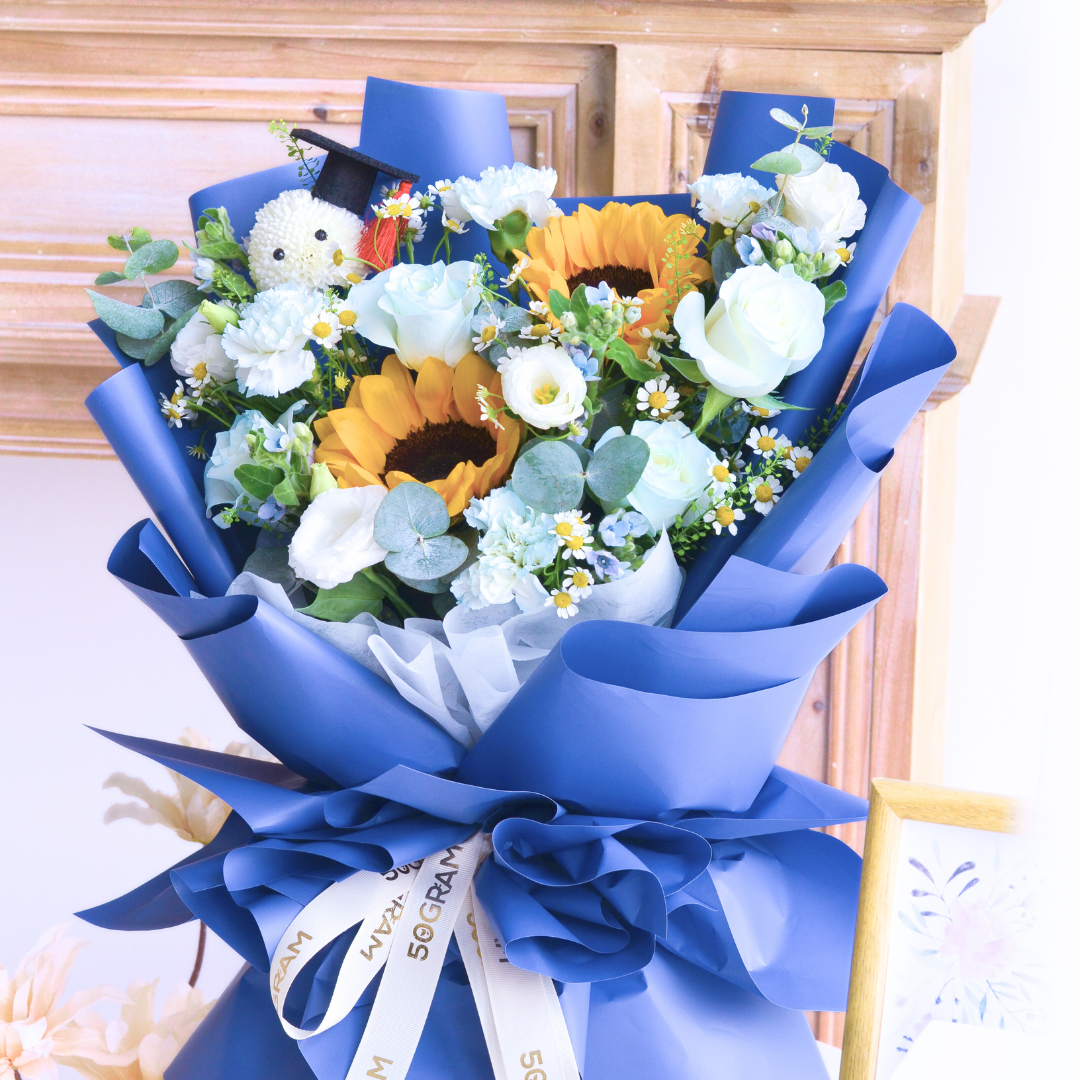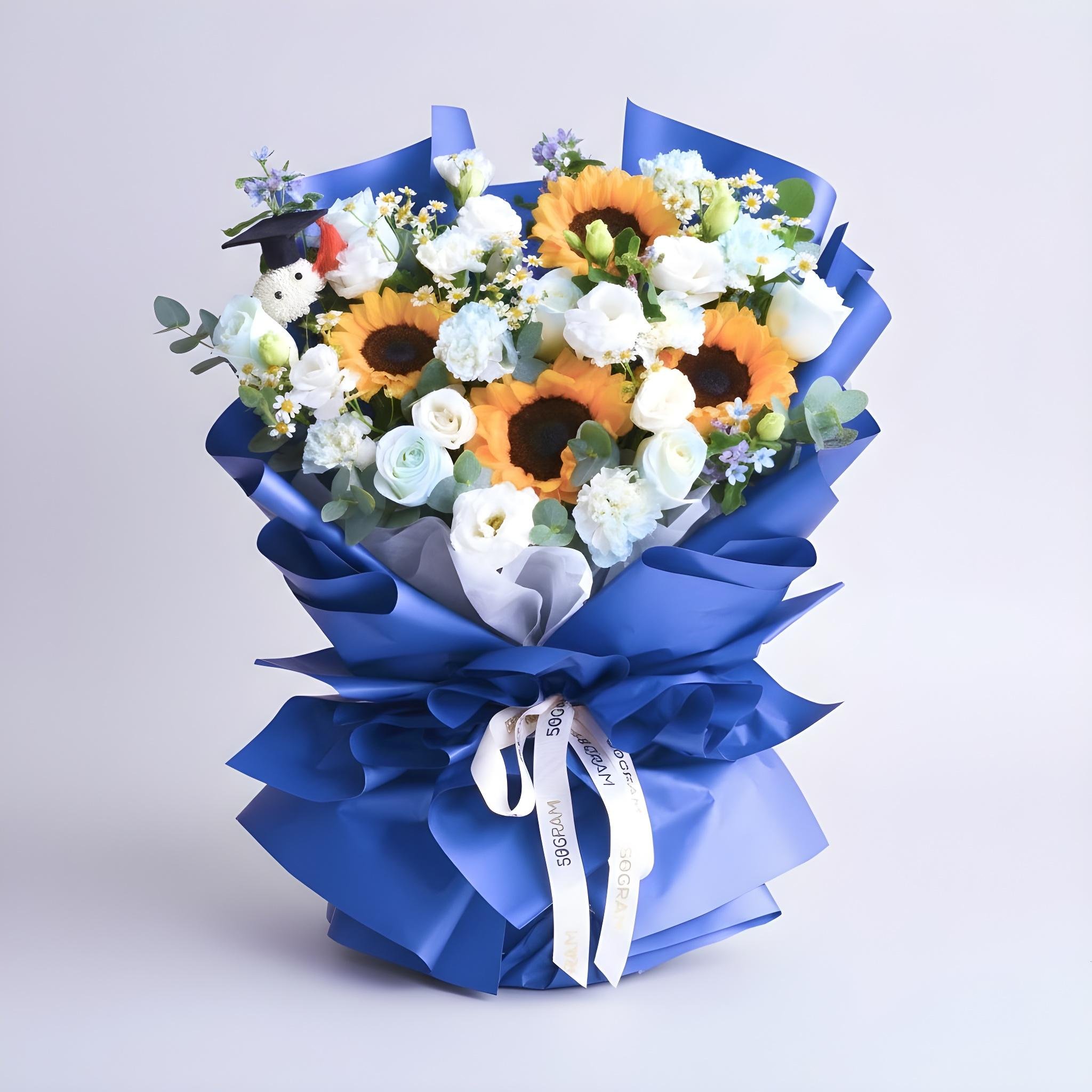 “Floral Milestone” is a celebratory bouquet that marks a significant achievement, like a graduation, with a vibrant mix of sunflowers and ping pong chrysanthemums, elegantly wrapped in shades of blue. This arrangement embodies the transition from one chapter of life to the next with style and flair.