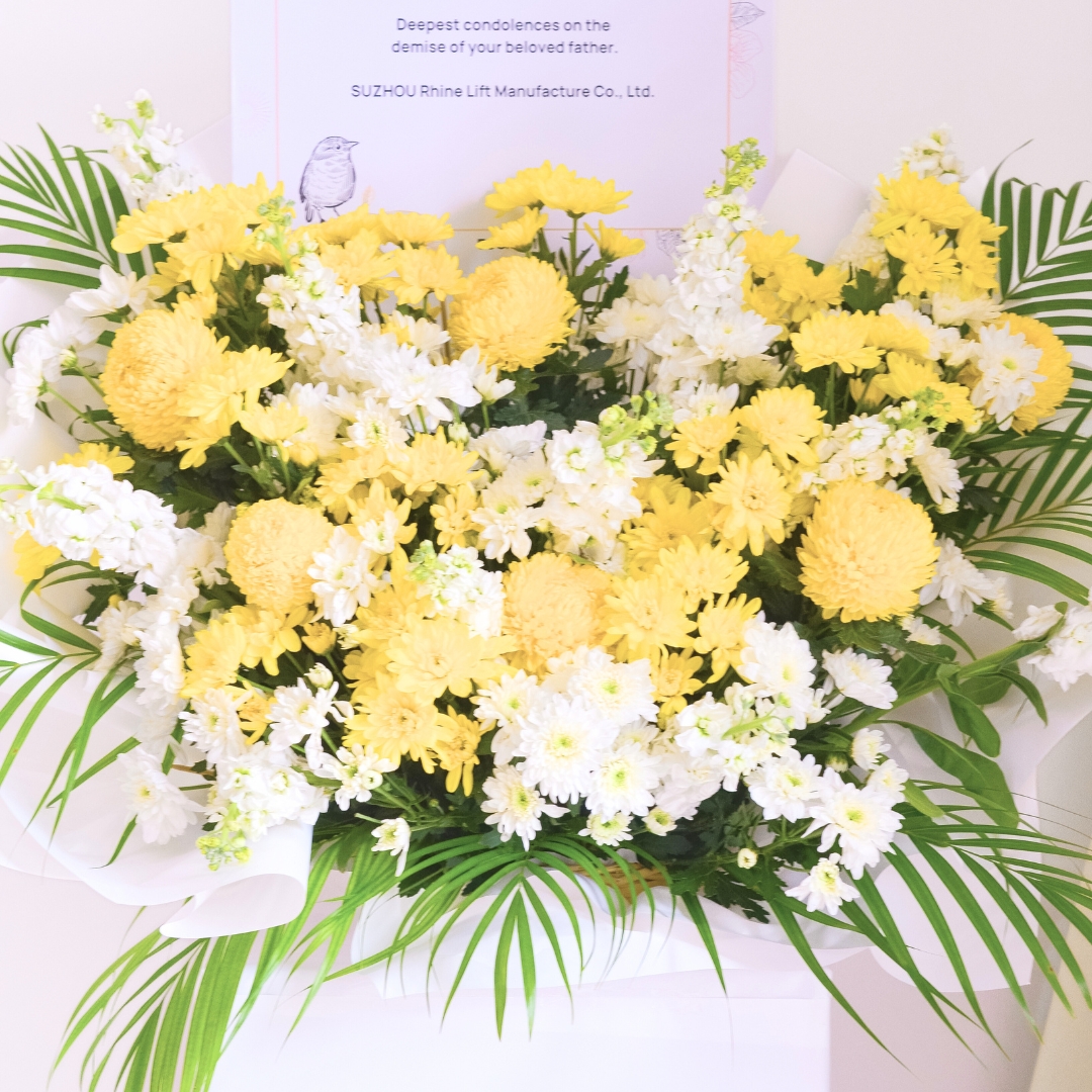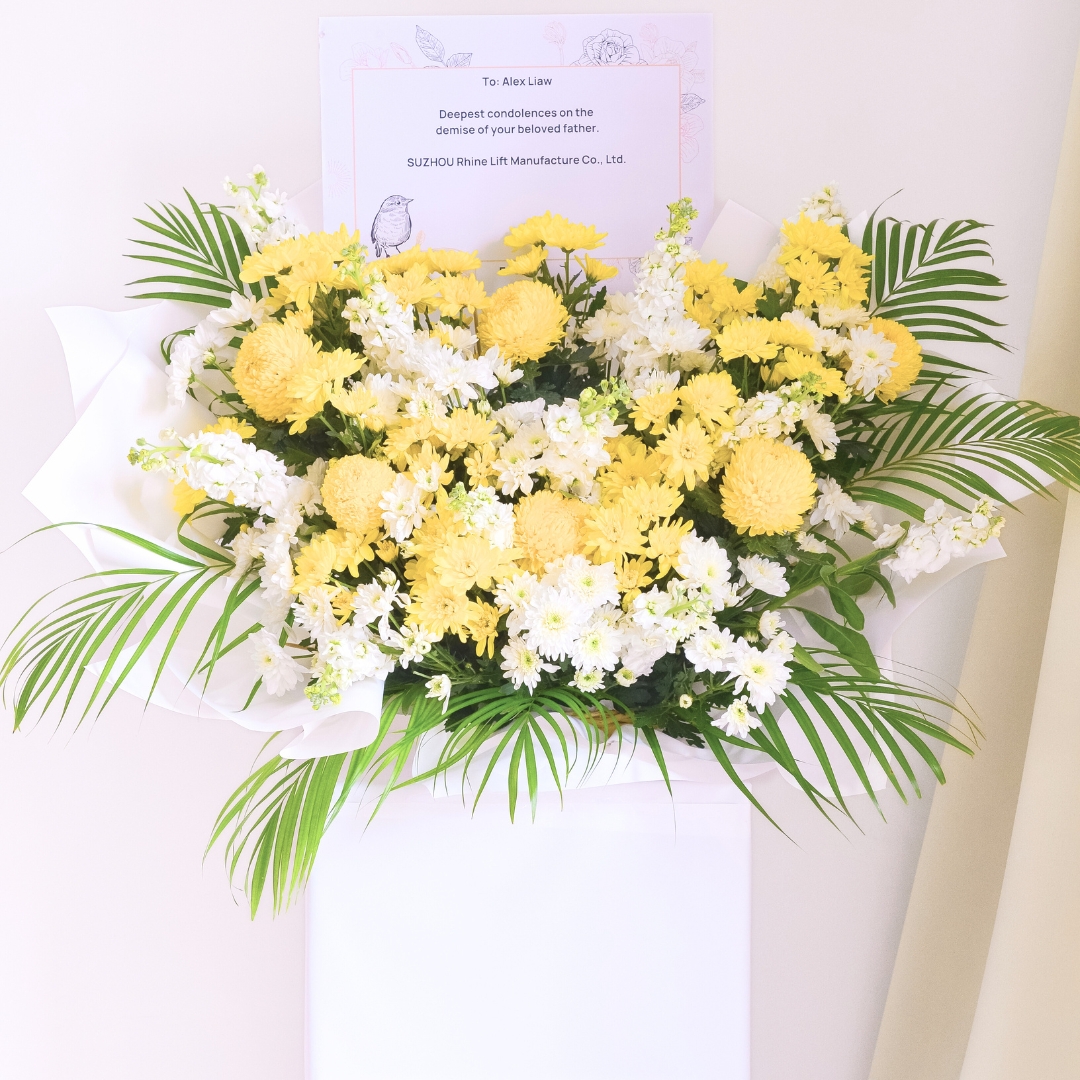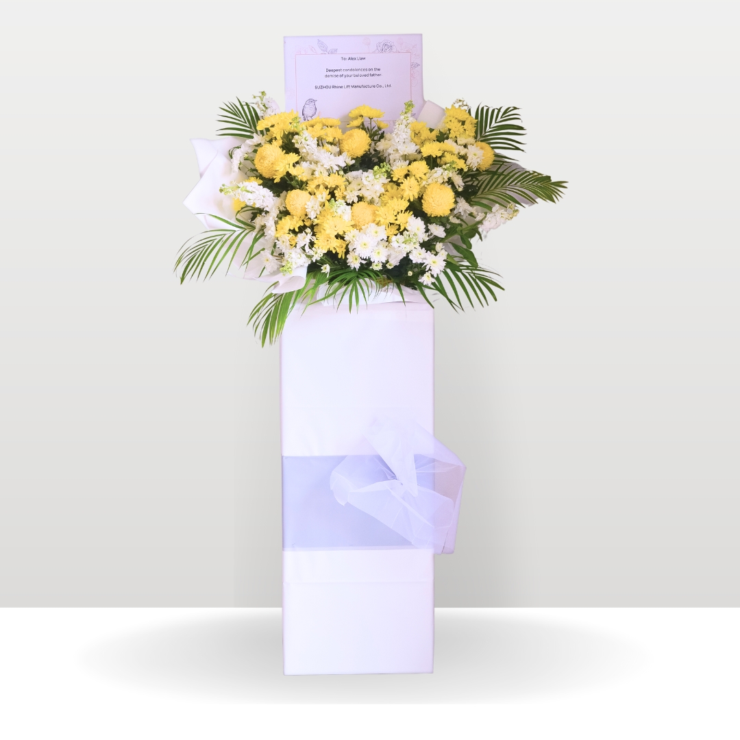 The Gentle Comfort Condolences Flower Stand offers a serene blend of yellow and white tones, symbolizing warmth and peace. Featuring yellow paper mums, white pom poms, and yellow pom poms, paired beautifully with the soft texture of white matthiola. The addition of palm leaves and green foliage brings natural elegance to the arrangement. Displayed on a square bottom stand with clean white wrapping, this flower stand provides a heartfelt expression of condolences, offering gentle comfort during times of loss.