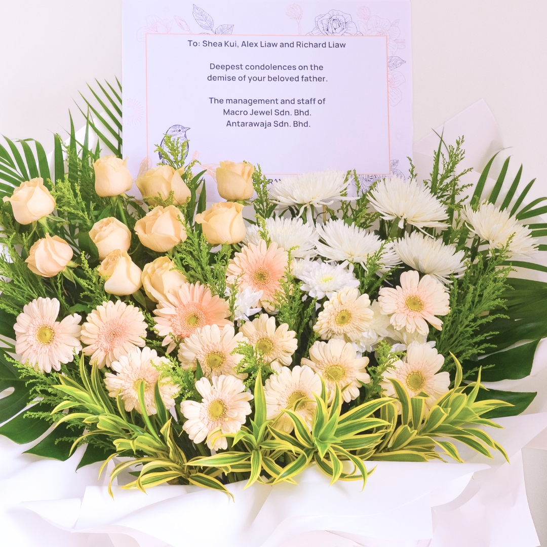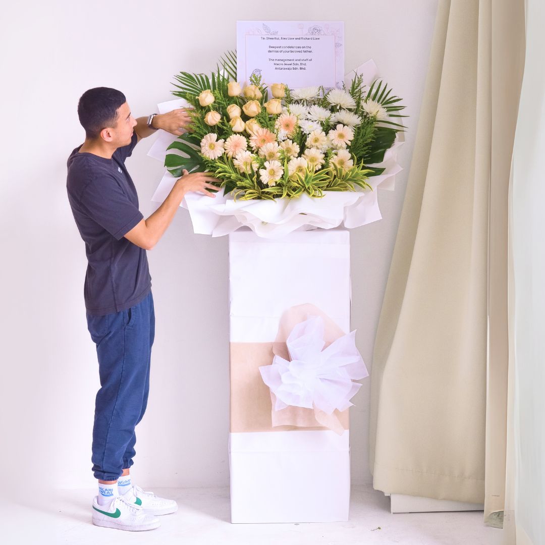 The Graceful Remembrance Condolences Flower Stand offers a serene and heartfelt tribute with a soft arrangement of champagne daisies, white net mums, and fresh green foliage. Presented on a square bottom stand and wrapped elegantly in white, this thoughtful arrangement conveys peace, respect, and compassion, offering comfort during a time of loss.