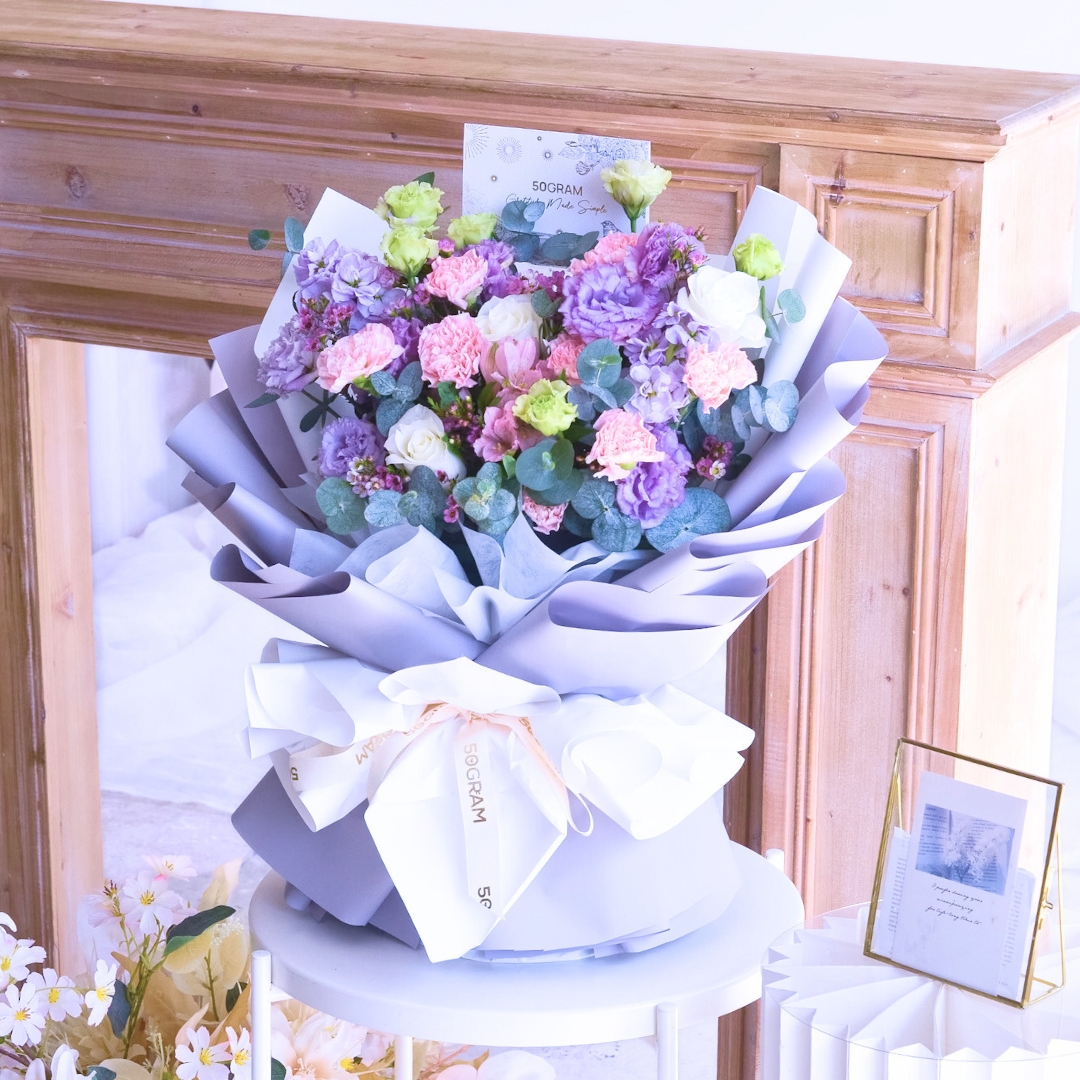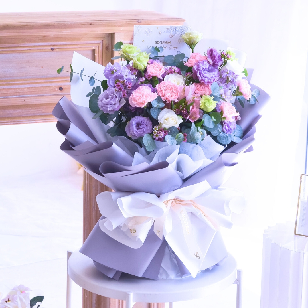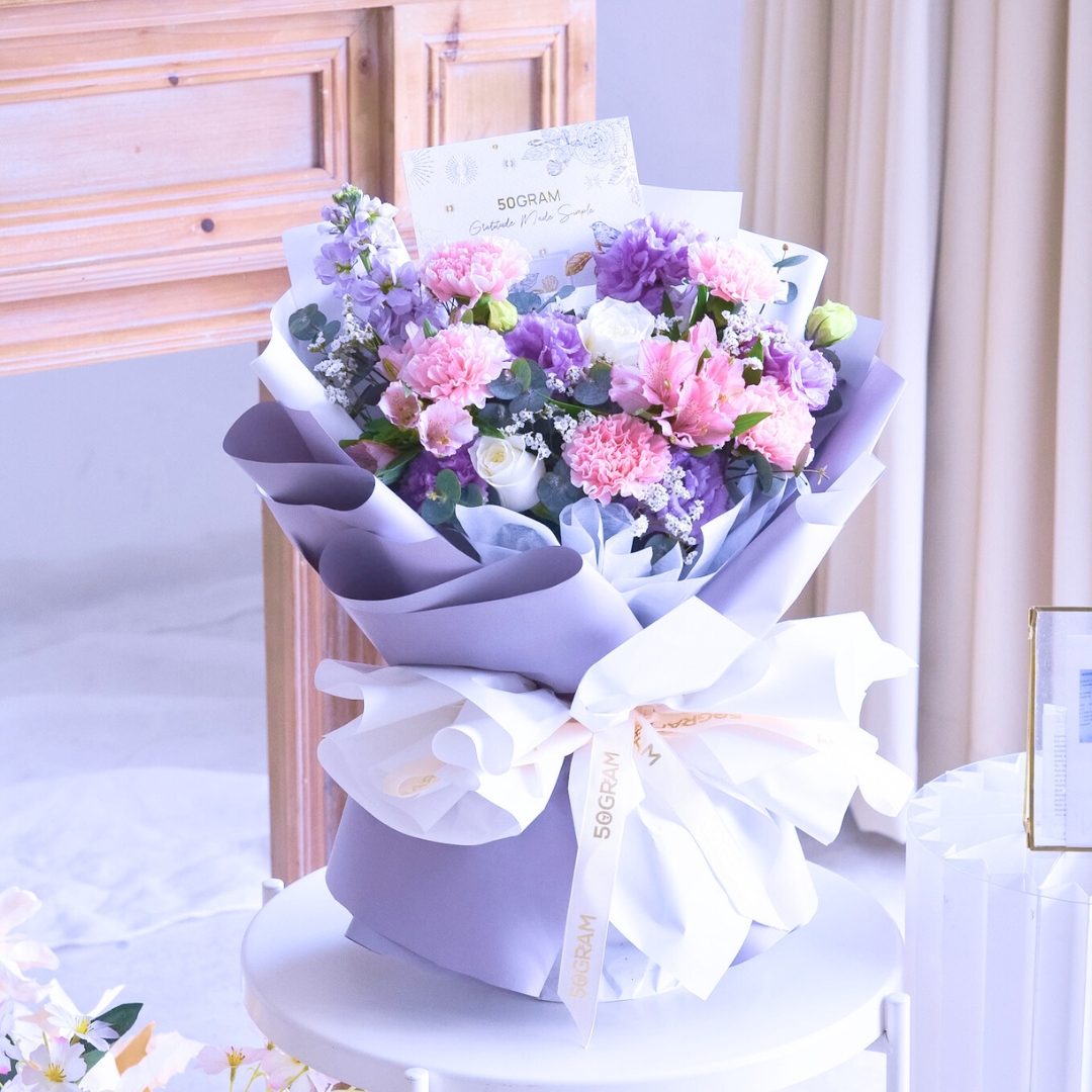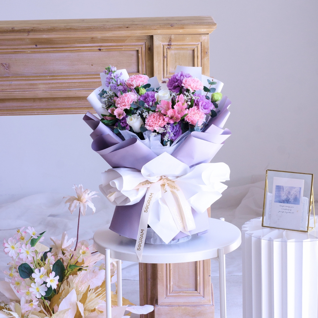 The pink carnations, with their gentle hue, represent affection, gratitude, and the nurturing spirit of mothers. Paired with the purity of white roses, symbolizing love and reverence, and the elegance of purple eustoma, the bouquet becomes a touching tribute to the love and sacrifices of mothers everywhere.