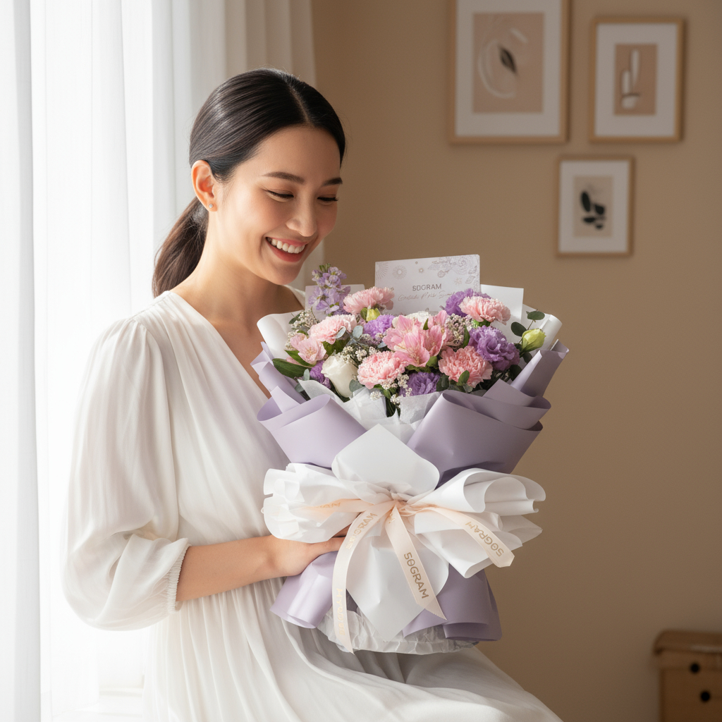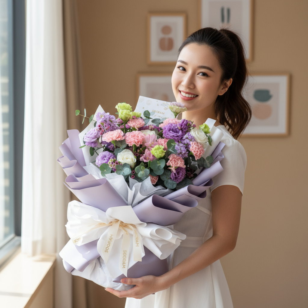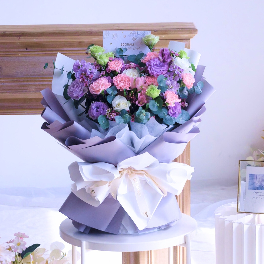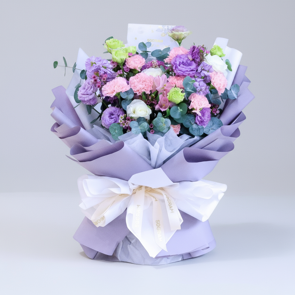 The pink carnations, with their gentle hue, represent affection, gratitude, and the nurturing spirit of mothers. Paired with the purity of white roses, symbolizing love and reverence, and the elegance of purple eustoma, the bouquet becomes a touching tribute to the love and sacrifices of mothers everywhere.