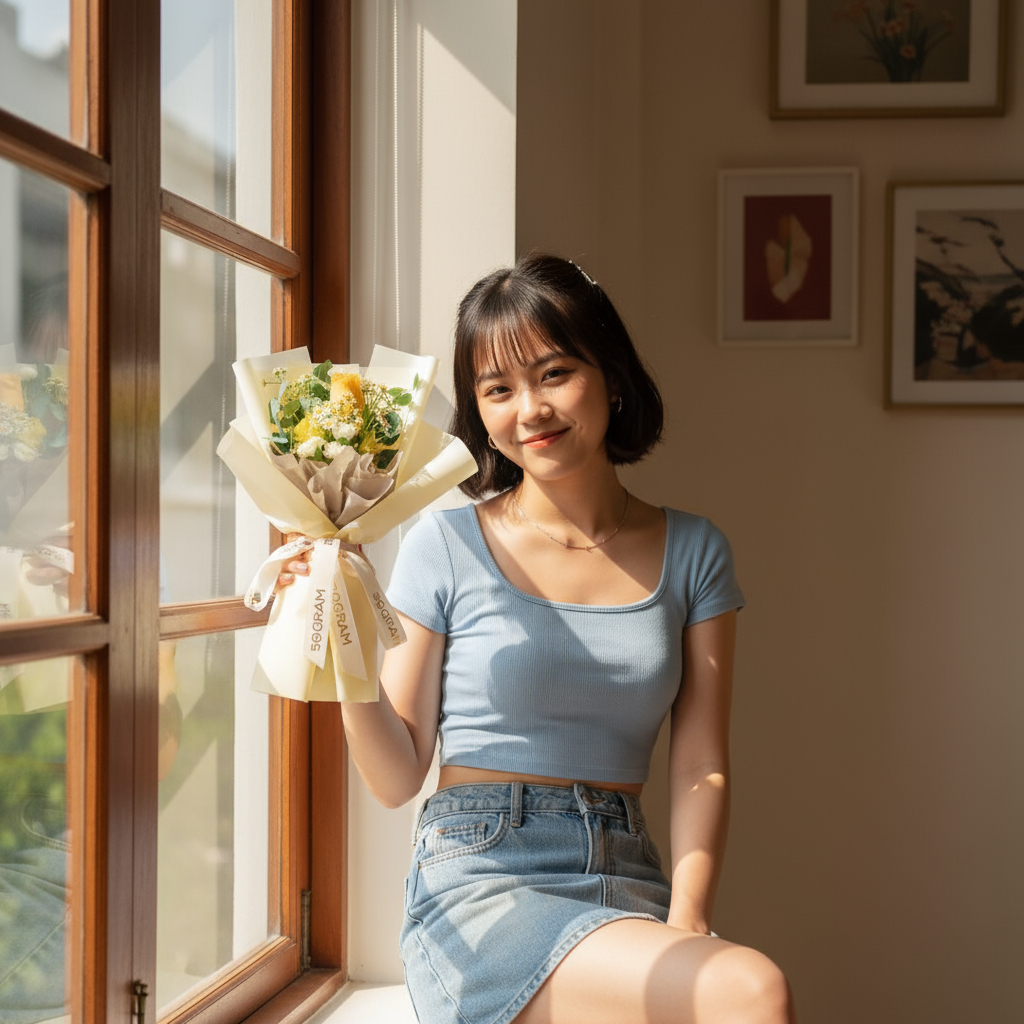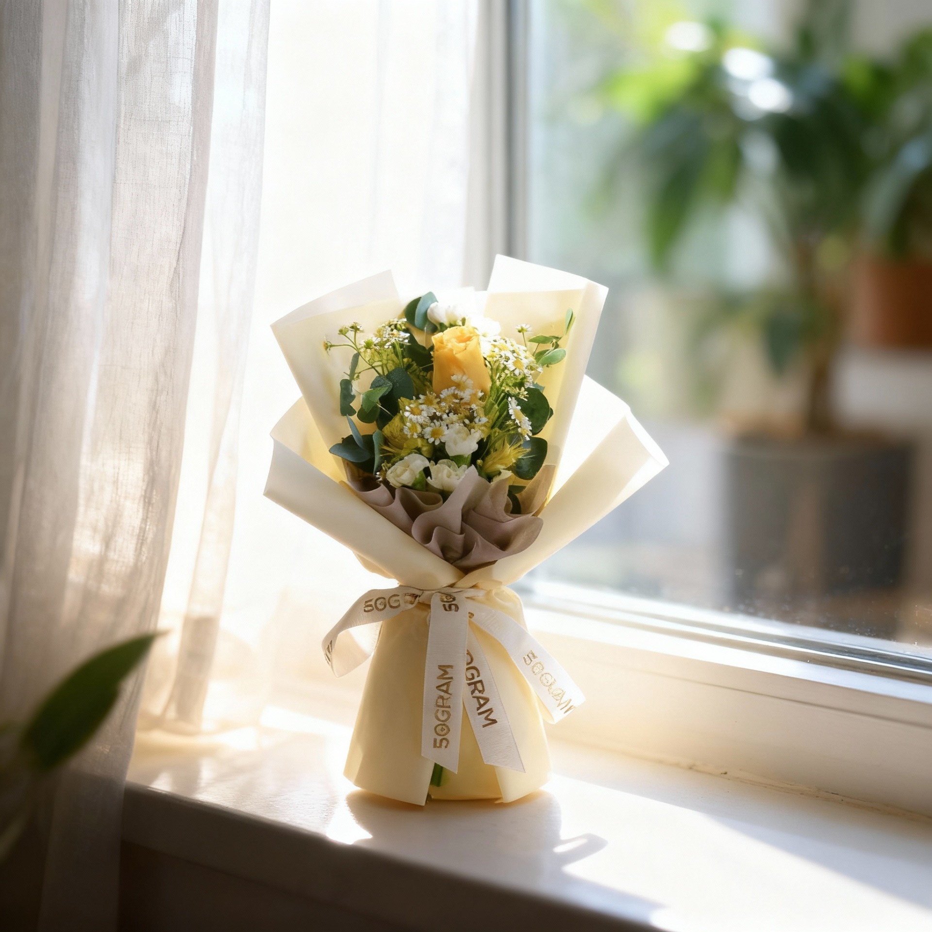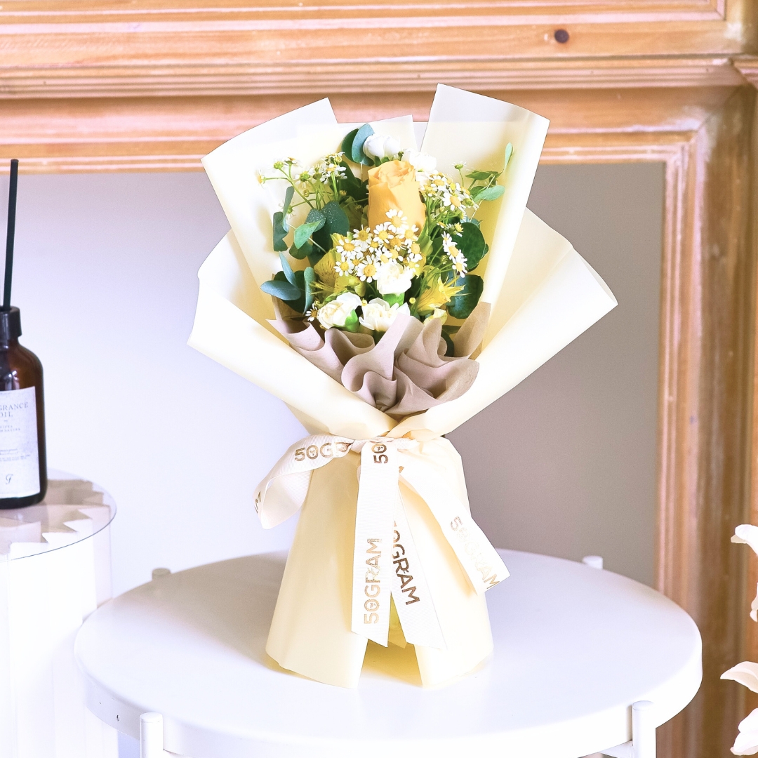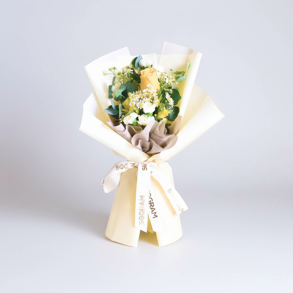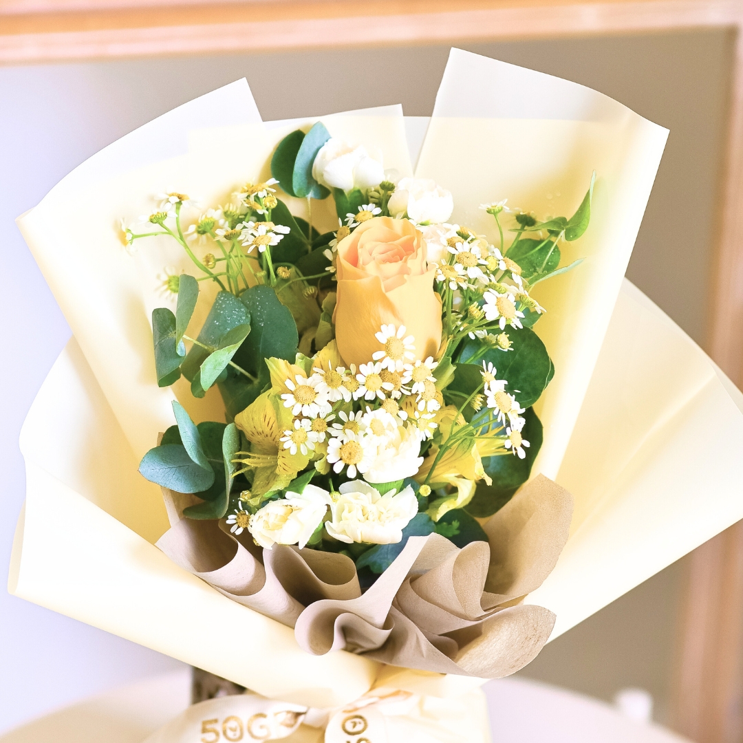 The bouquet comes with Yellow Rose x 1, Yellow Alstroemeria, Chamomile, White Spray Carnation & Eucalyptus.