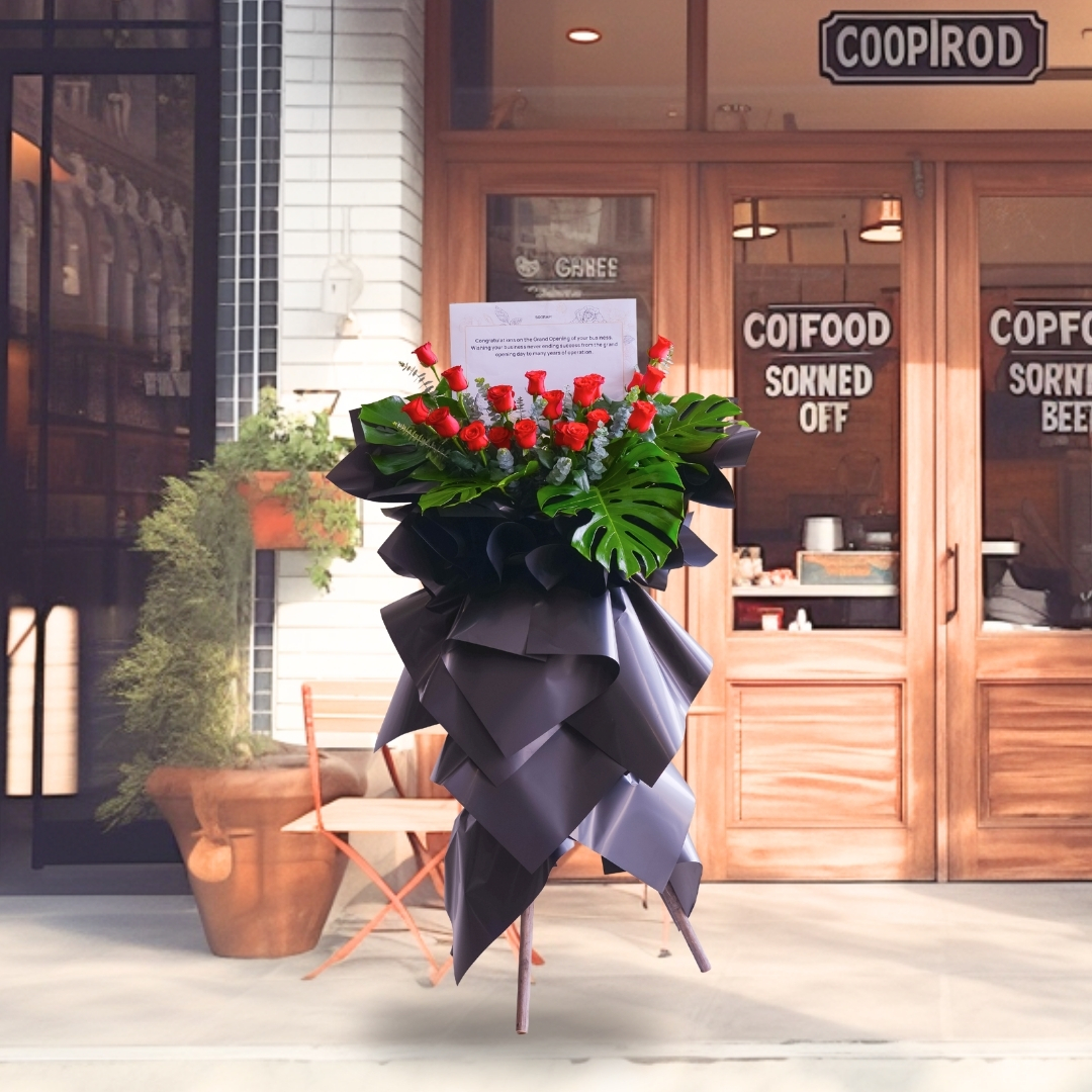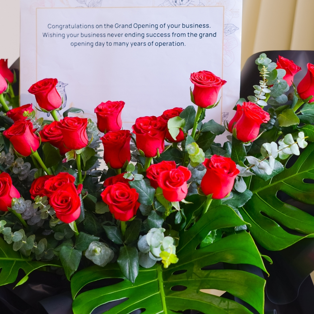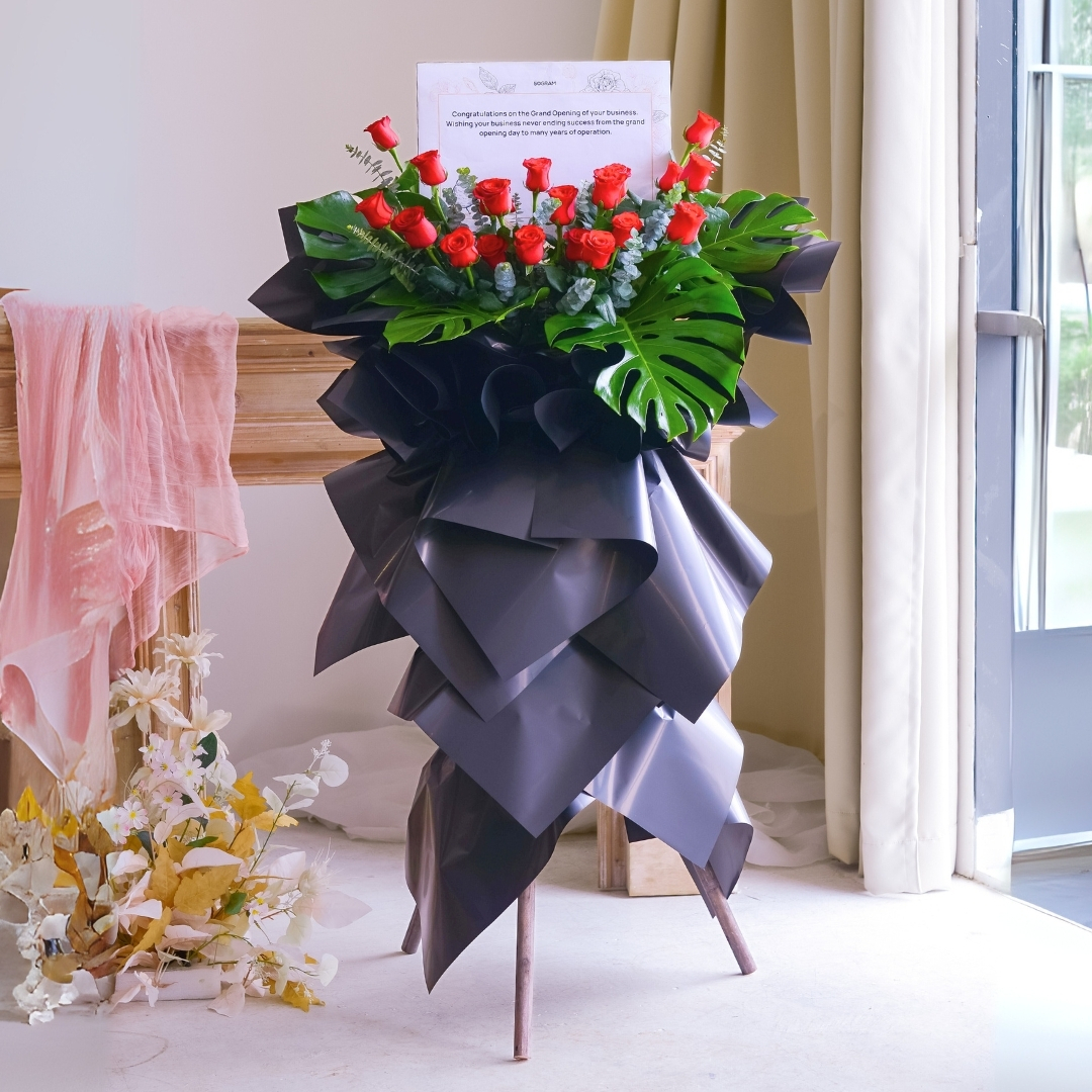• Lavish Lustres Opening Stand (Standard size) come with 20 stalks of red roses, eucalyptus leaf, giant leaf element & message card board.