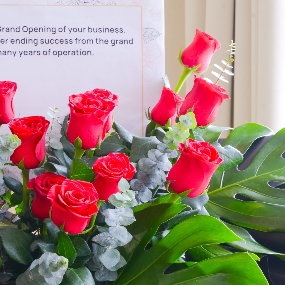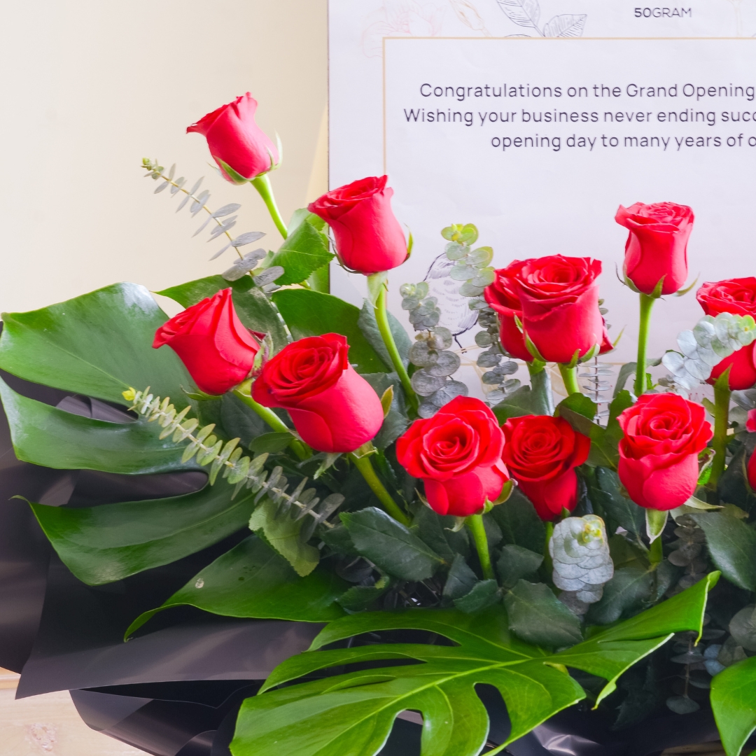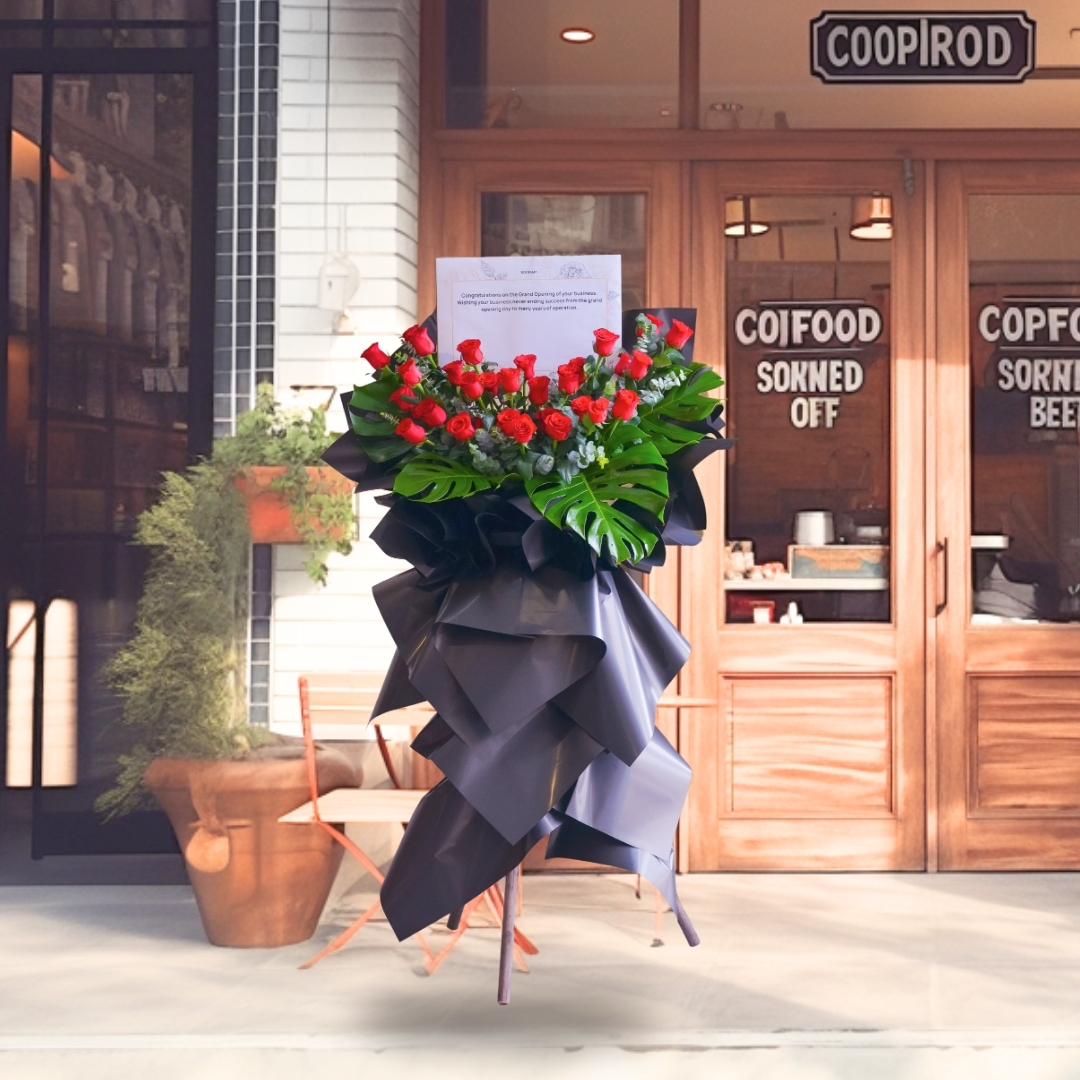 • Lavish Lustres Opening Stand (Standard size) come with 20 stalks of red roses, eucalyptus leaf, giant leaf element & message card board.