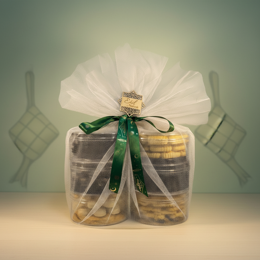 Santapan Warisan Raya is inspired by the traditional festive trays that adorn living rooms during Syawal. This set features three assorted Raya cookies individually wrapped in sheer white netting and finished with a delicate ribbon, reflecting the softness and elegance of the festive season.