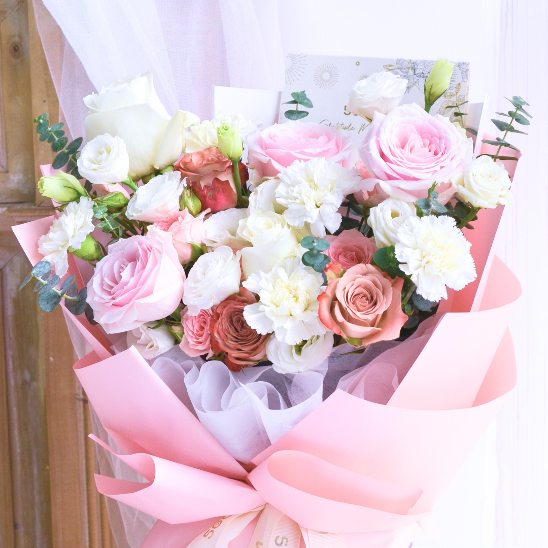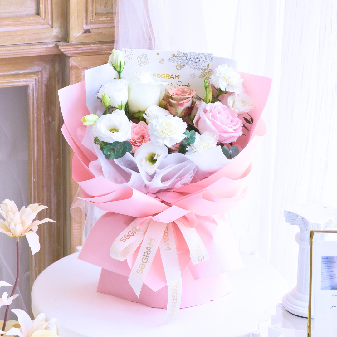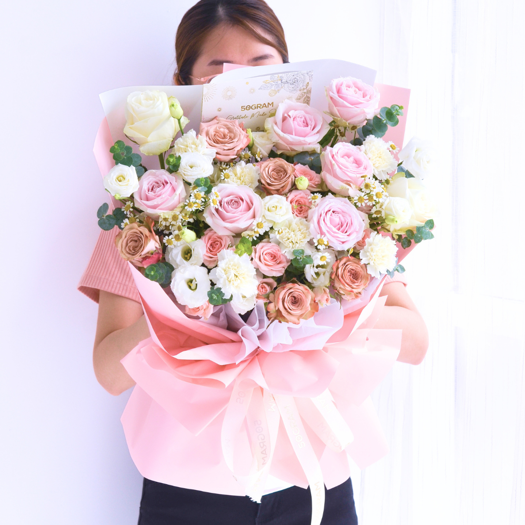 The “Love Bonds Pink Roses Hand Bouquet” is an exquisite floral arrangement that beautifully captures the essence of strong connections and heartfelt emotions. This hand bouquet combines delicate pink roses and charming cappuccino roses, thoughtfully arranged to symbolize the depth of love and the unique bond shared between two individuals. With free delivery in Kuala Lumpur (KL) and Petaling Jaya (PJ), surprise your loved ones or add a touch of charm to any occasion with this enchanting hand bouquet.