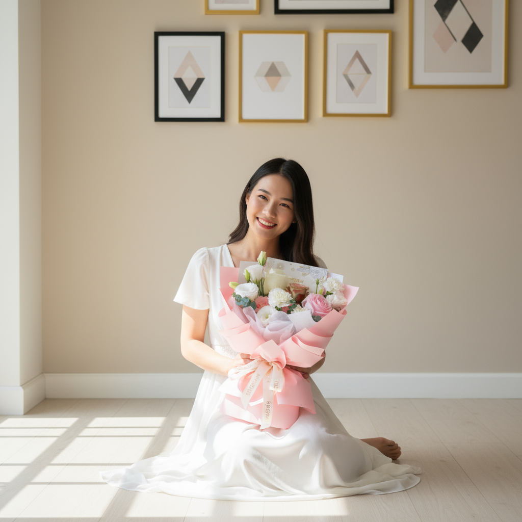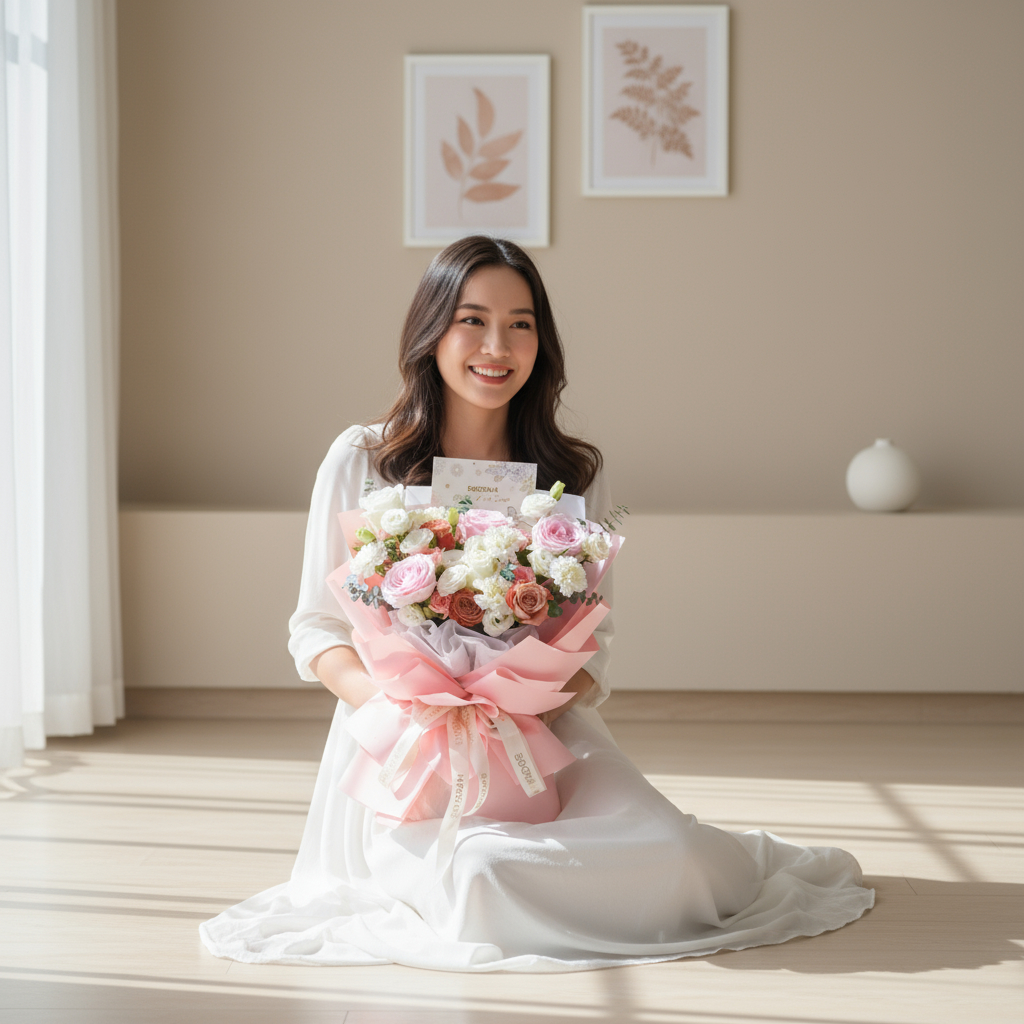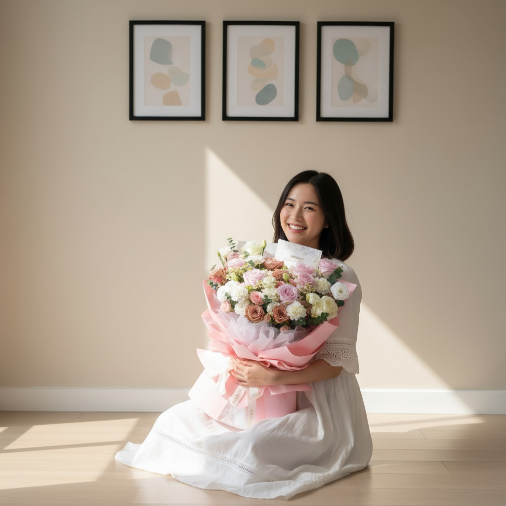 The soft pink roses represent tenderness, affection, and admiration, signifying the gentle and nurturing aspects of a relationship. On the other hand, the cappuccino roses, with their warm and inviting hues, symbolize a deep and enduring connection, much like the comfort of a beloved friend’s company.