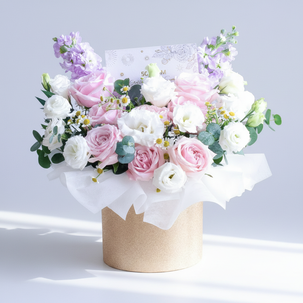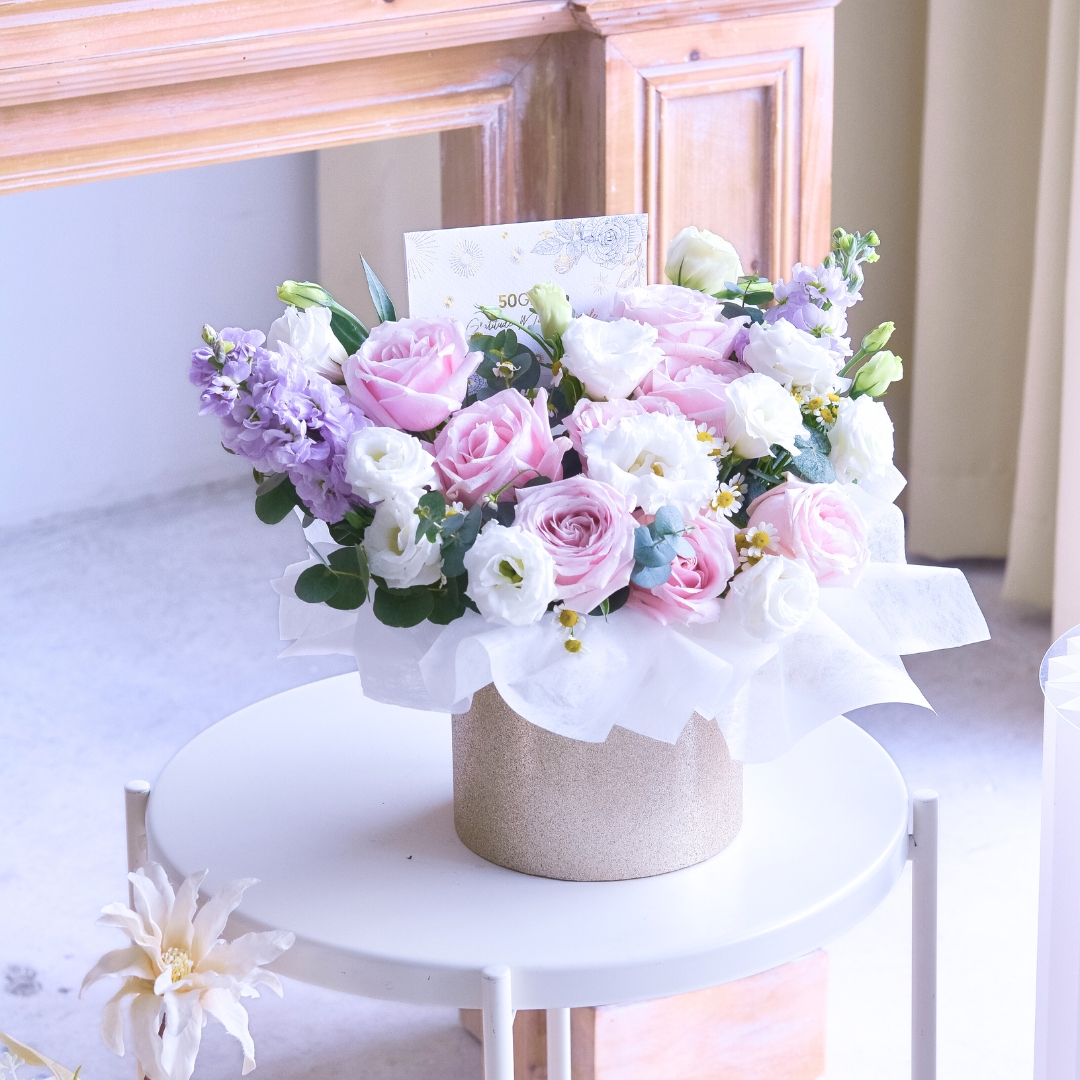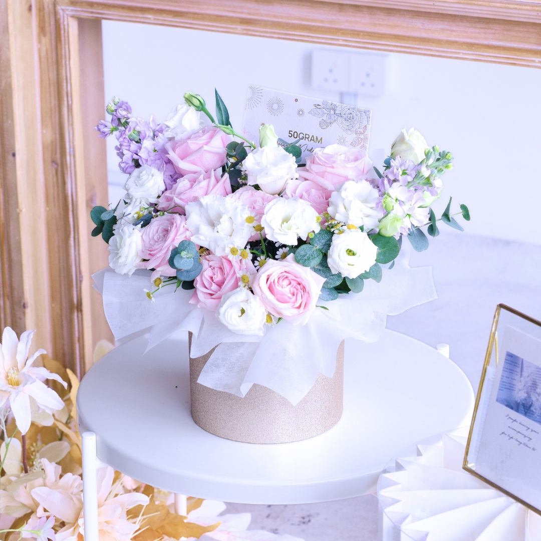 This flower box comes with Pink Rose x 7, White Eustoma, Chamomile, Lilac Matthiola, & Eucalyptus.