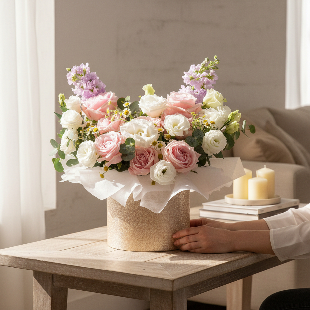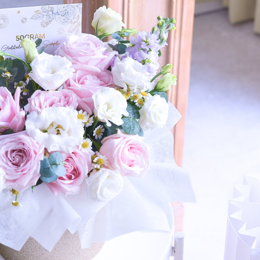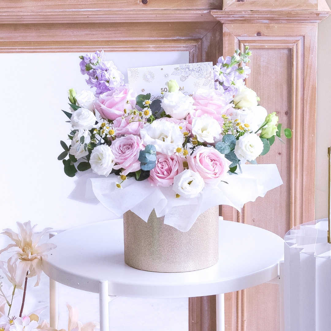 This flower box comes with Pink Rose x 7, White Eustoma, Chamomile, Lilac Matthiola, & Eucalyptus.