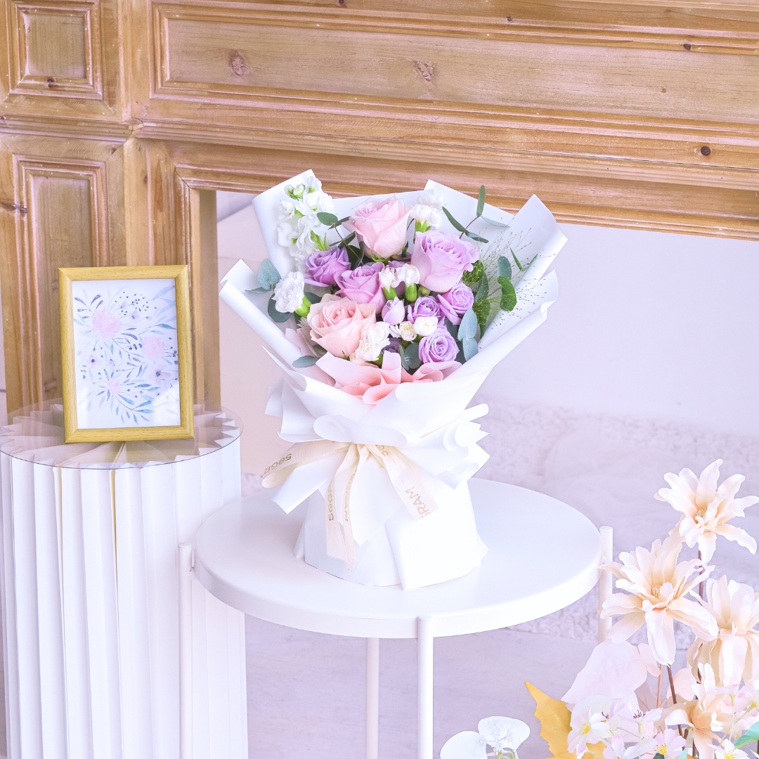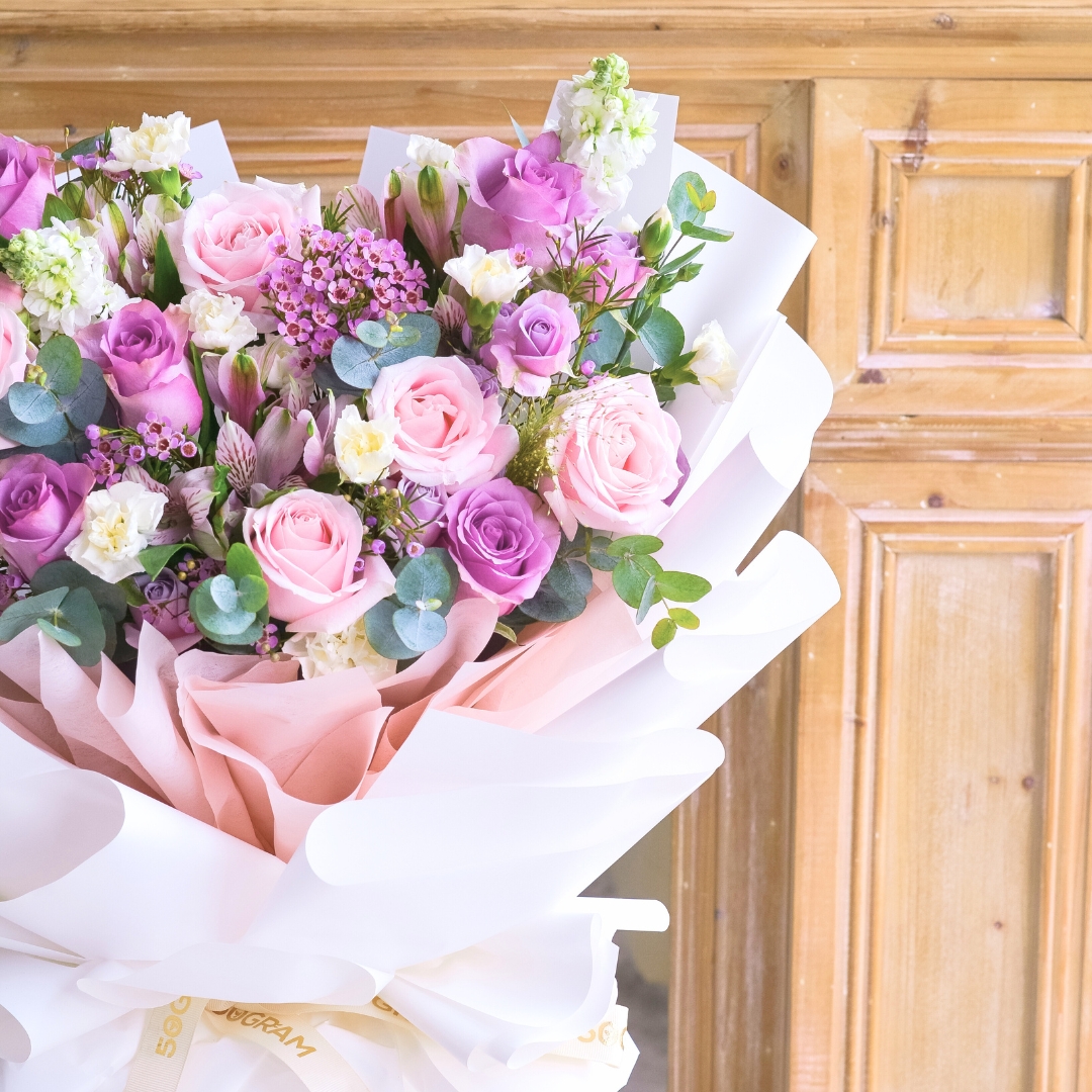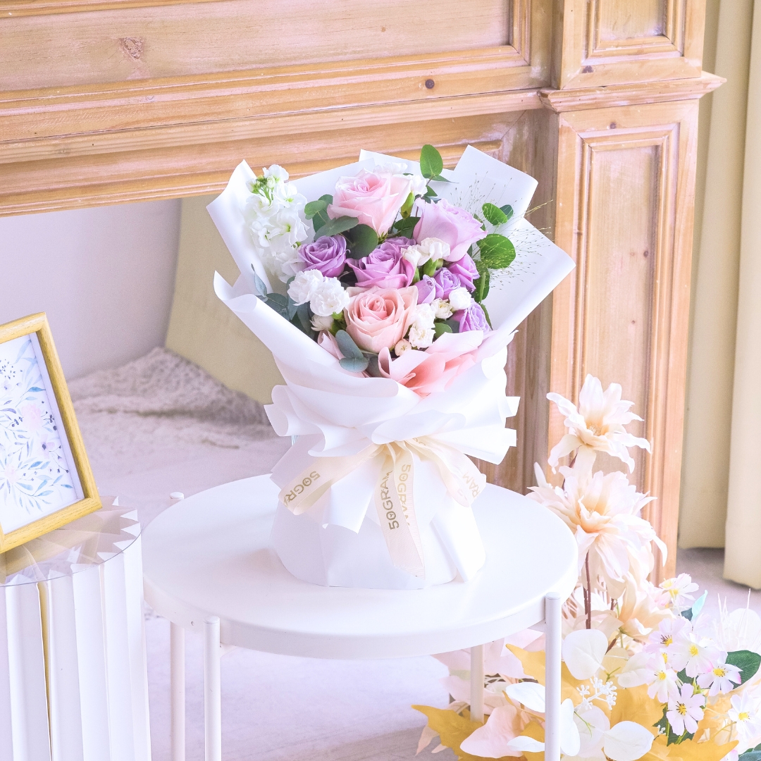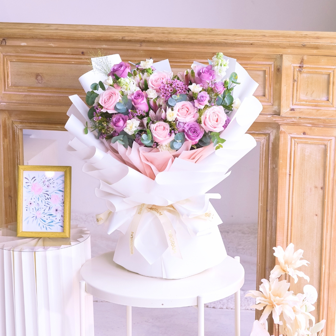 This Regular size bouquet comes with Pink Rose x 2, Purple Rose x 1, Spray Rose Lilac, White Matthiola, Panicum Fountain, Spray Carnation White & Eucalyptus.