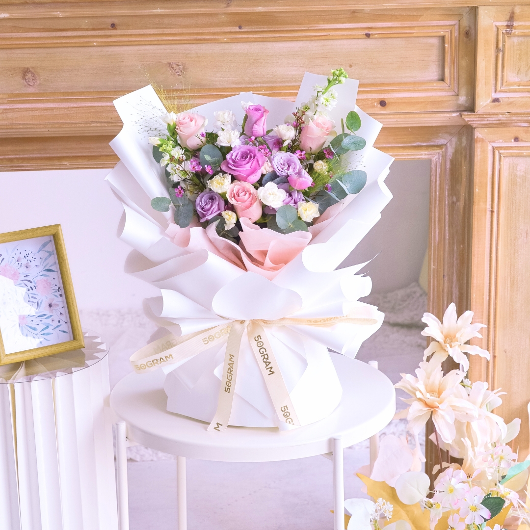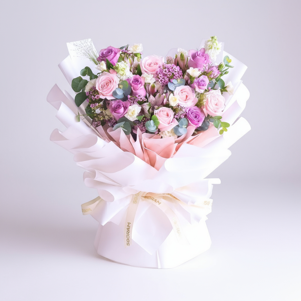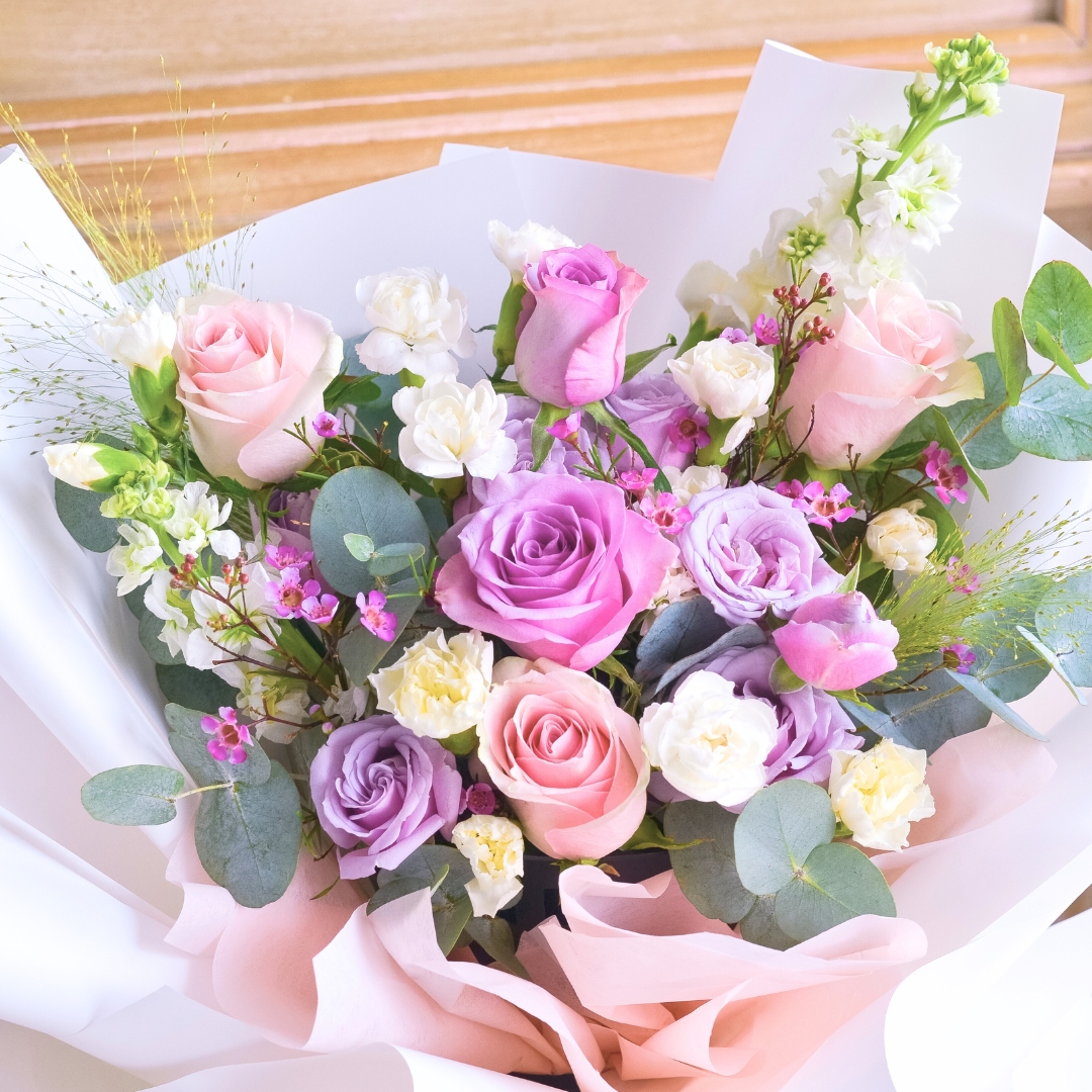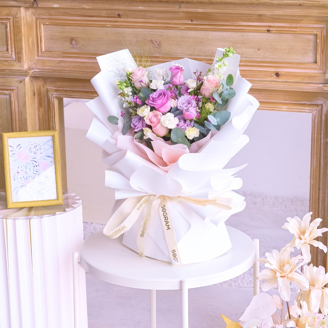 This Regular size bouquet comes with Pink Rose x 2, Purple Rose x 1, Spray Rose Lilac, White Matthiola, Panicum Fountain, Spray Carnation White & Eucalyptus.