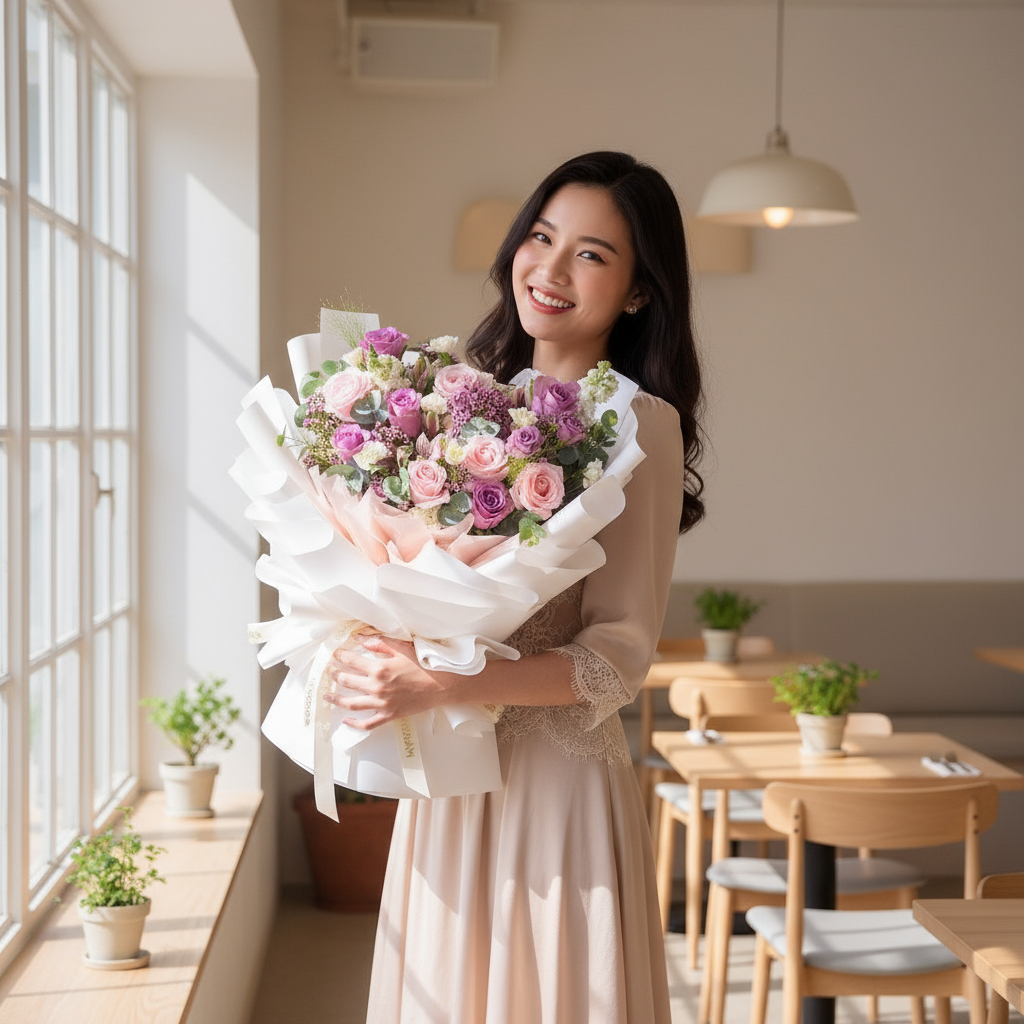 The “Lovely Blush Pink Purple Roses Hand Bouquet” is a beautifully harmonious arrangement featuring elegant purple roses, soft pink roses, and delicate white matthiola. Enhanced with charming white mini carnations, this bouquet exudes a gentle, romantic charm. Perfect for expressing affection and admiration, it symbolizes love, grace, and the timeless beauty of tender moments. πŸŒΉπŸ’œπŸŒΈπŸ€