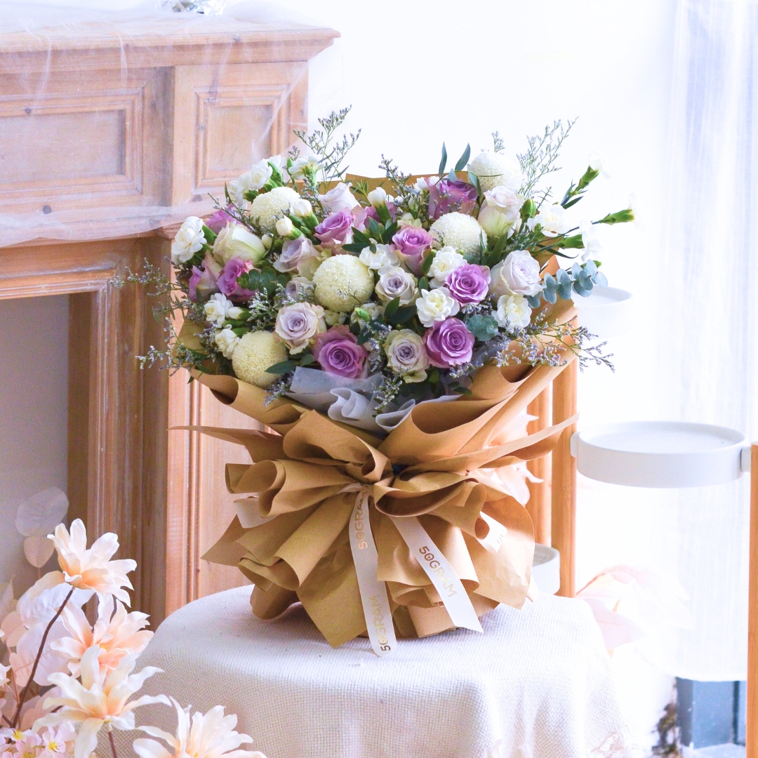 1 review for Mauve Elegance Purple Roses Hand Bouquet