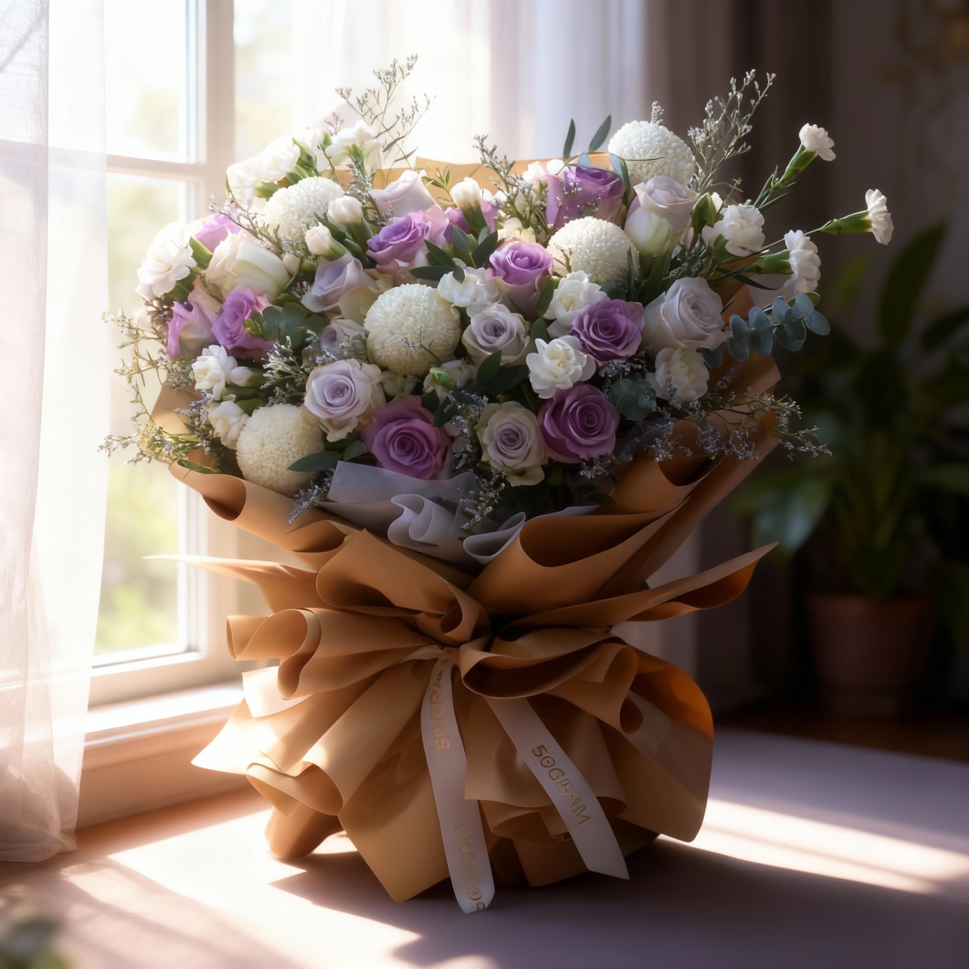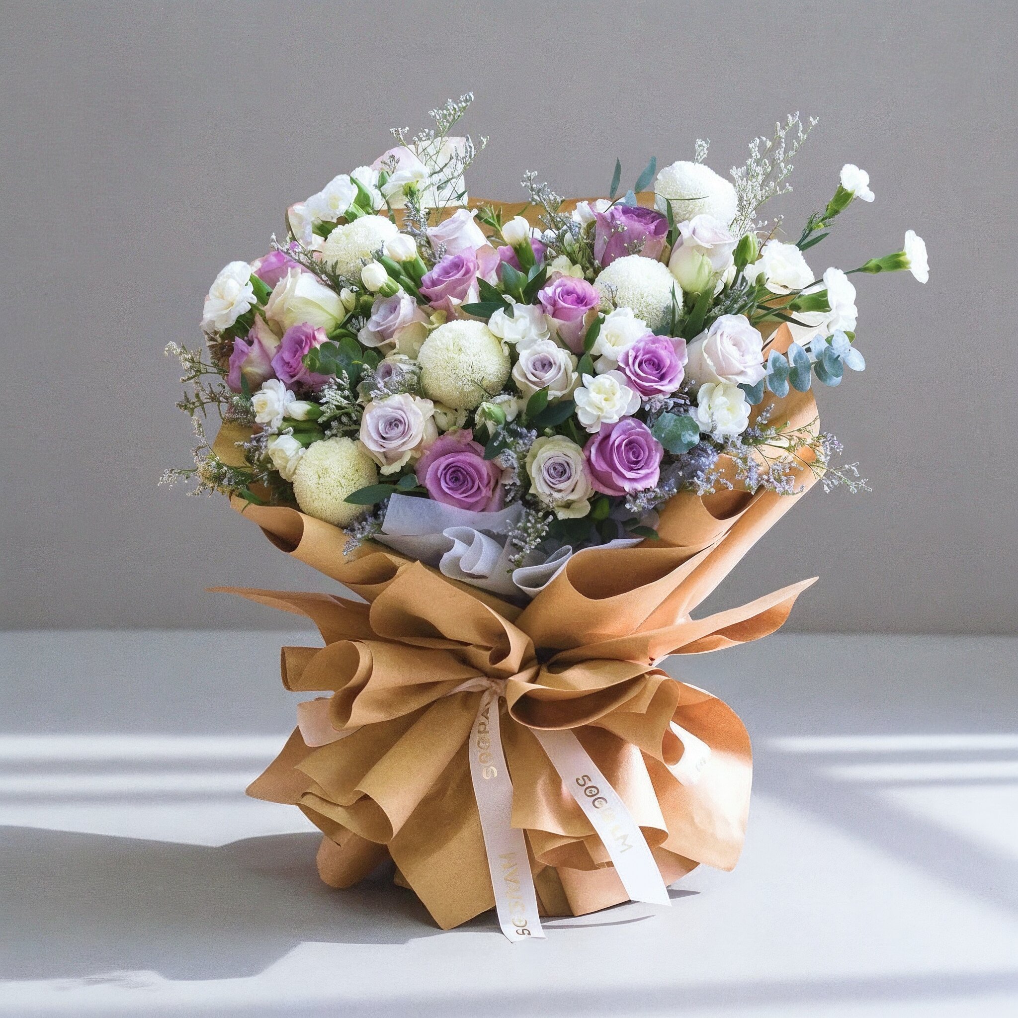 The “Mauve Elegance Purple Roses Hand Bouquet” is a sophisticated and chic arrangement featuring striking purple roses paired with delicate white ping pong blooms. Wrapped in natural craft paper, this bouquet blends elegance with a touch of rustic charm. Perfect for those who appreciate understated beauty, it symbolizes grace, admiration, and refined taste. 💜🤍🌿