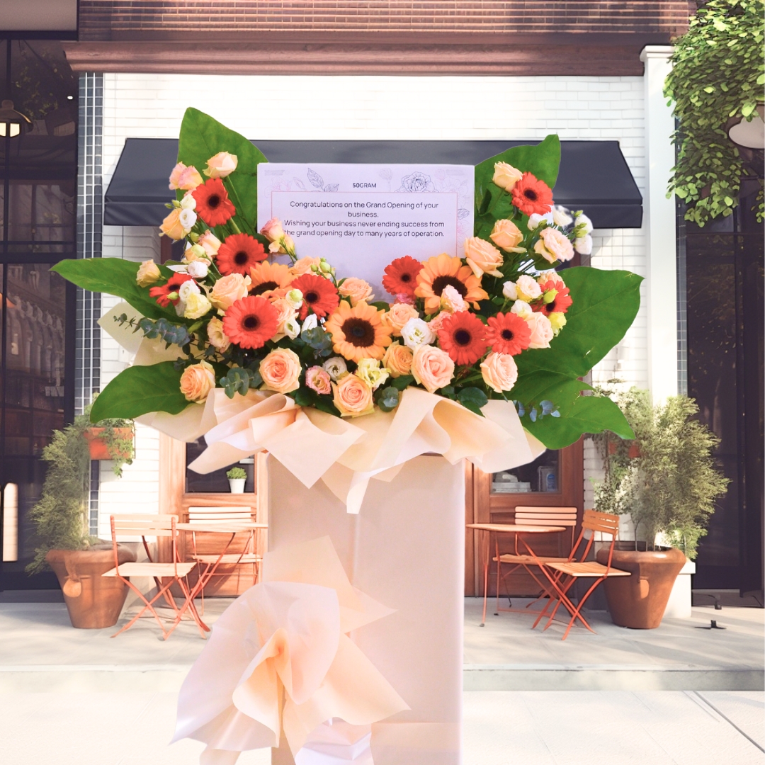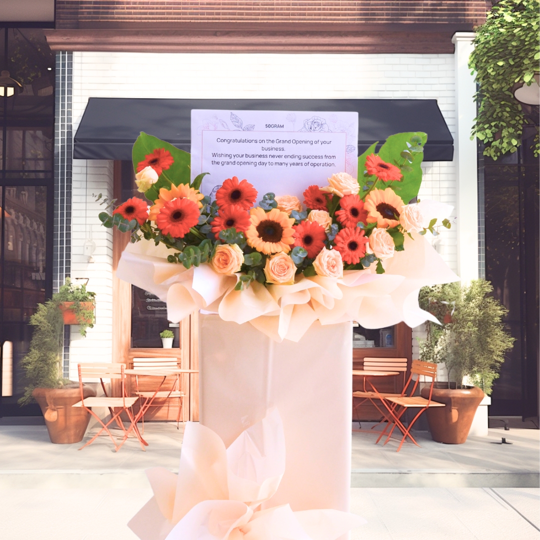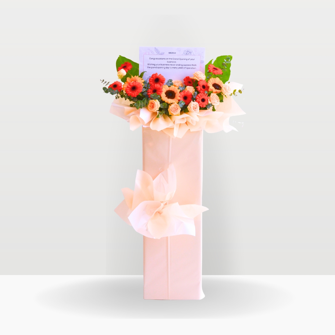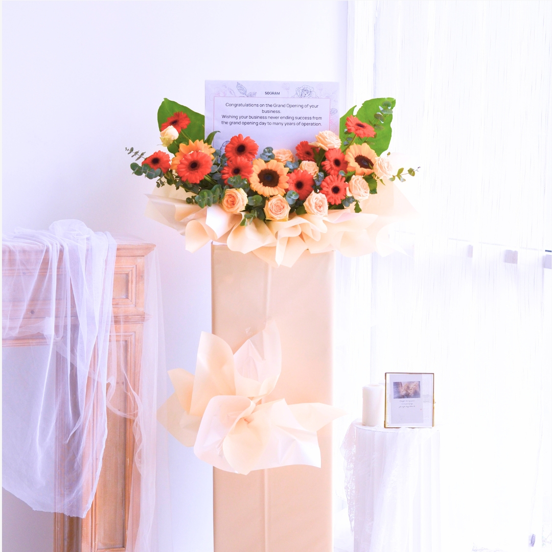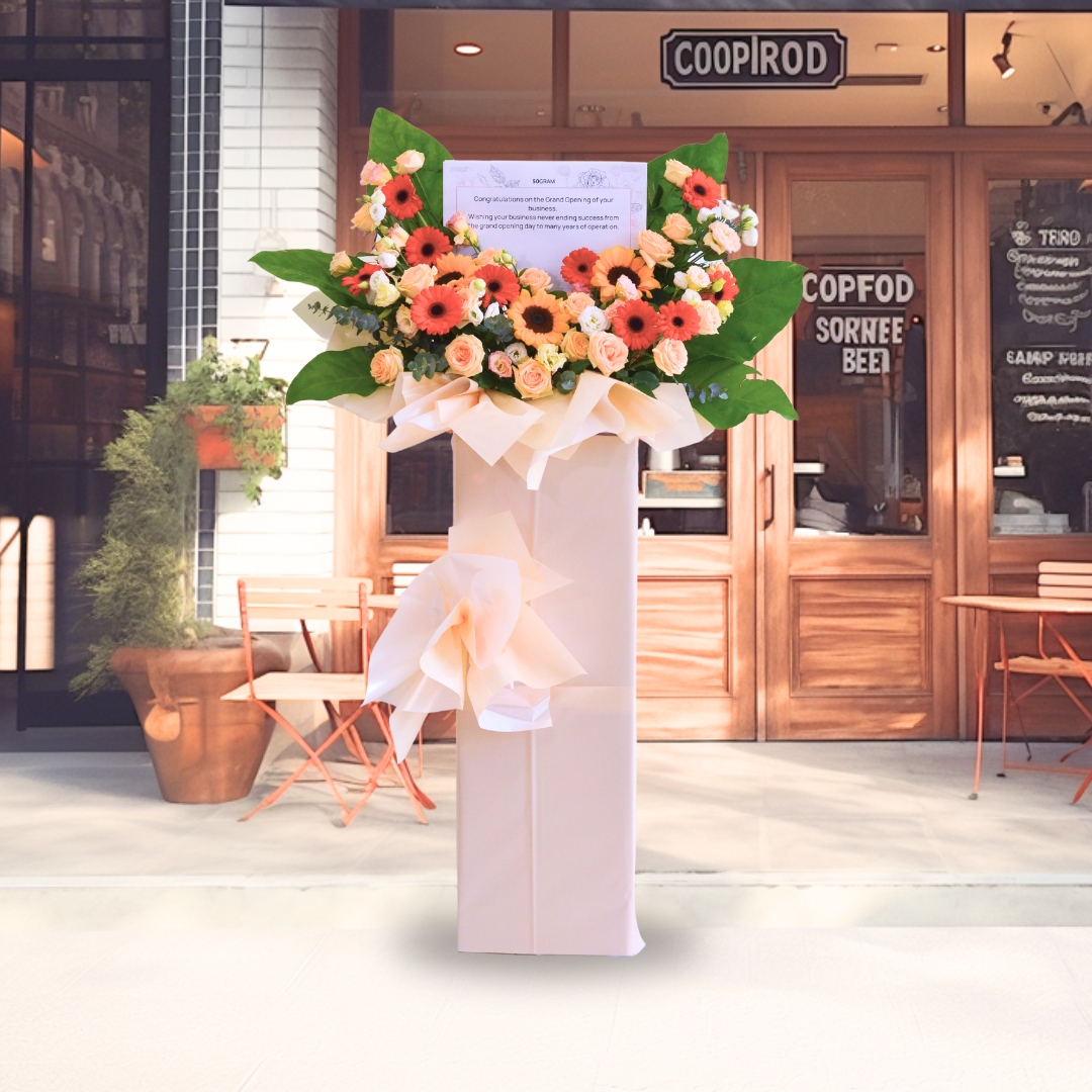 • Experience the Medley Bliss of our Business Opening Stand by 50Gram. This gorgeous arrangement combines a medley of exquisite blooms, creating a harmonious display of elegance and charm.