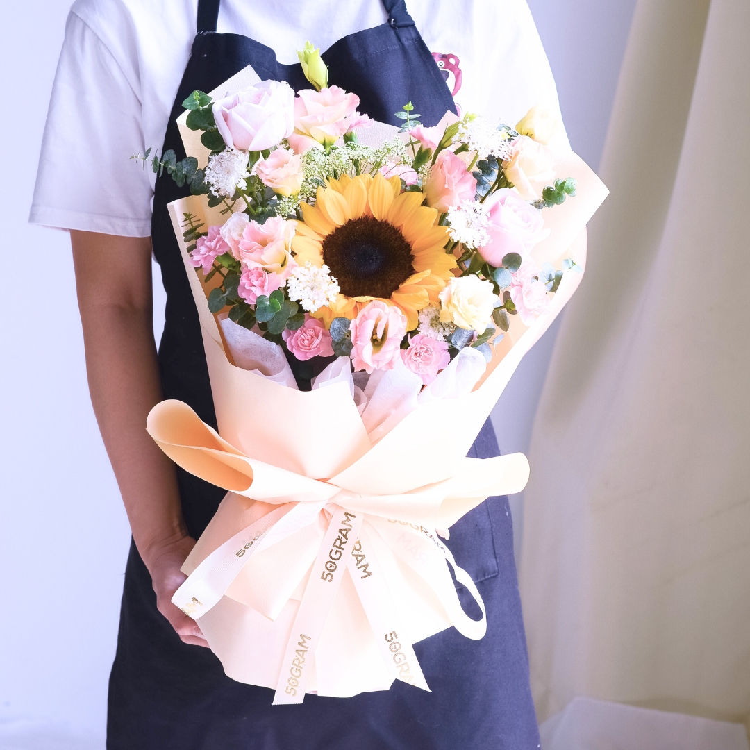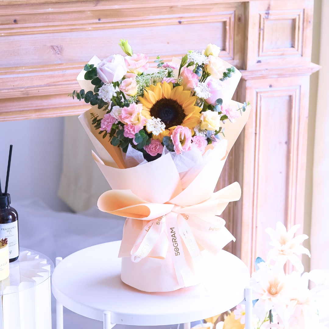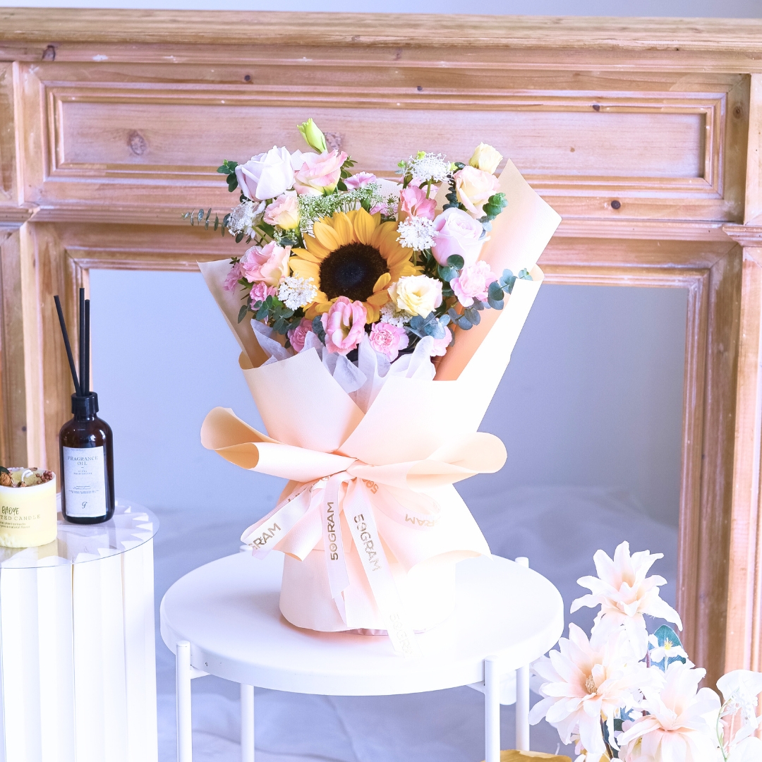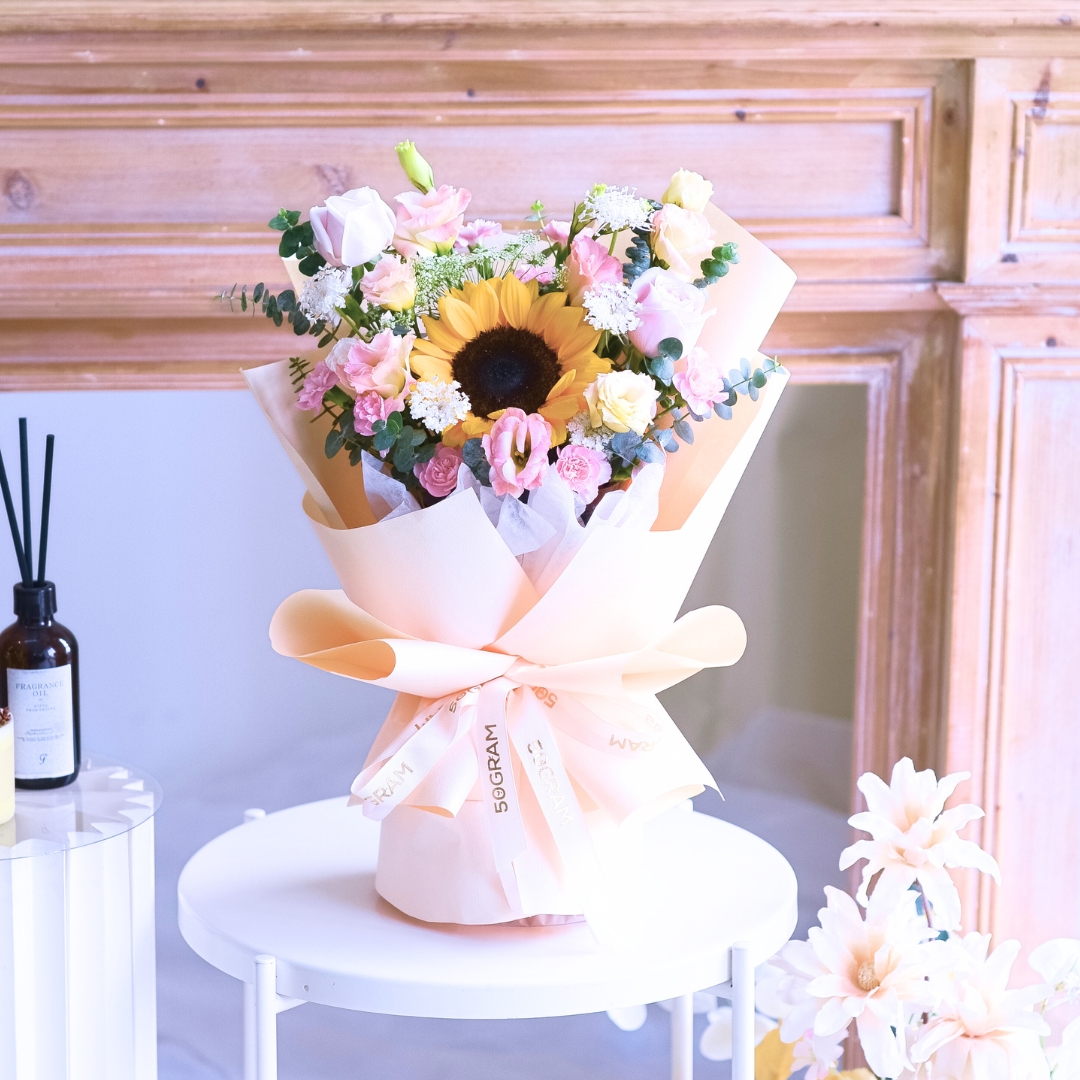 The bouquet comes with Sunflower x 1, Pink Rose x 2, Champagne Eustoma, Ammi, Spray Carnation Pink, Laced Flower & Eucalpytus.
