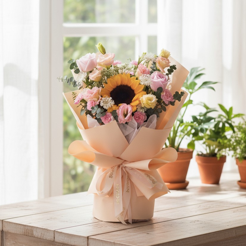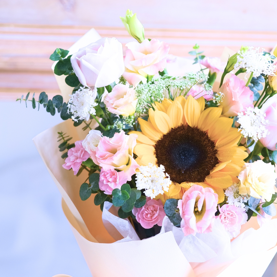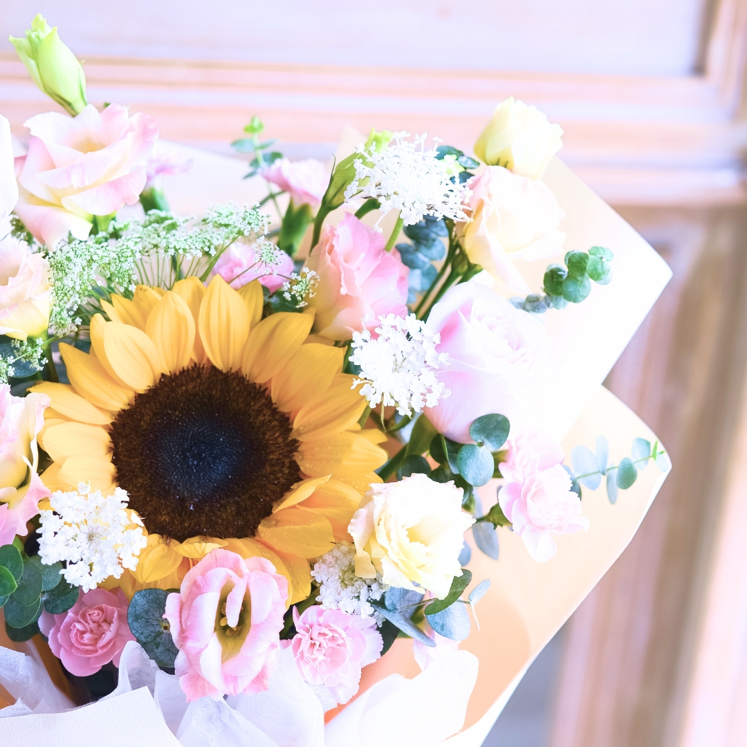 At the heart of the bouquet is a bright, joyful sunflower, surrounded by soft China AV pink roses, champagne eustoma, and spray pink carnations. Airy touches of ammi and laced flower add texture and softness, while eucalyptus baby blue introduces a refreshing, herbaceous finish.