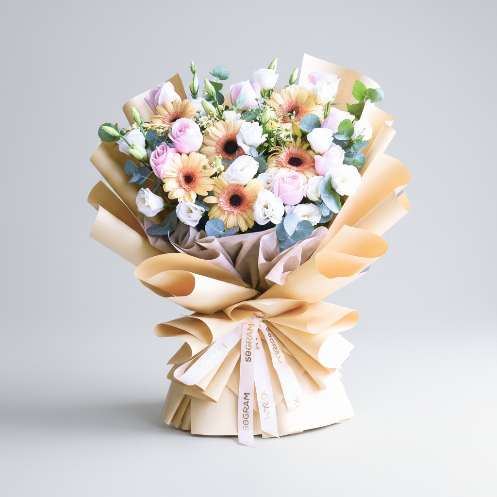 • M Size: Champagne Gerbera x 3, Pink Rose x 5, Matricaria, White Eustoma, Eucalyptus