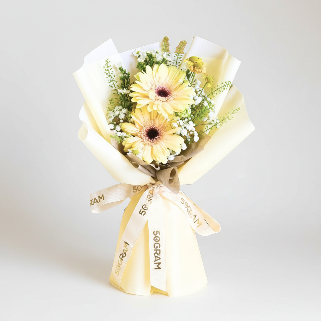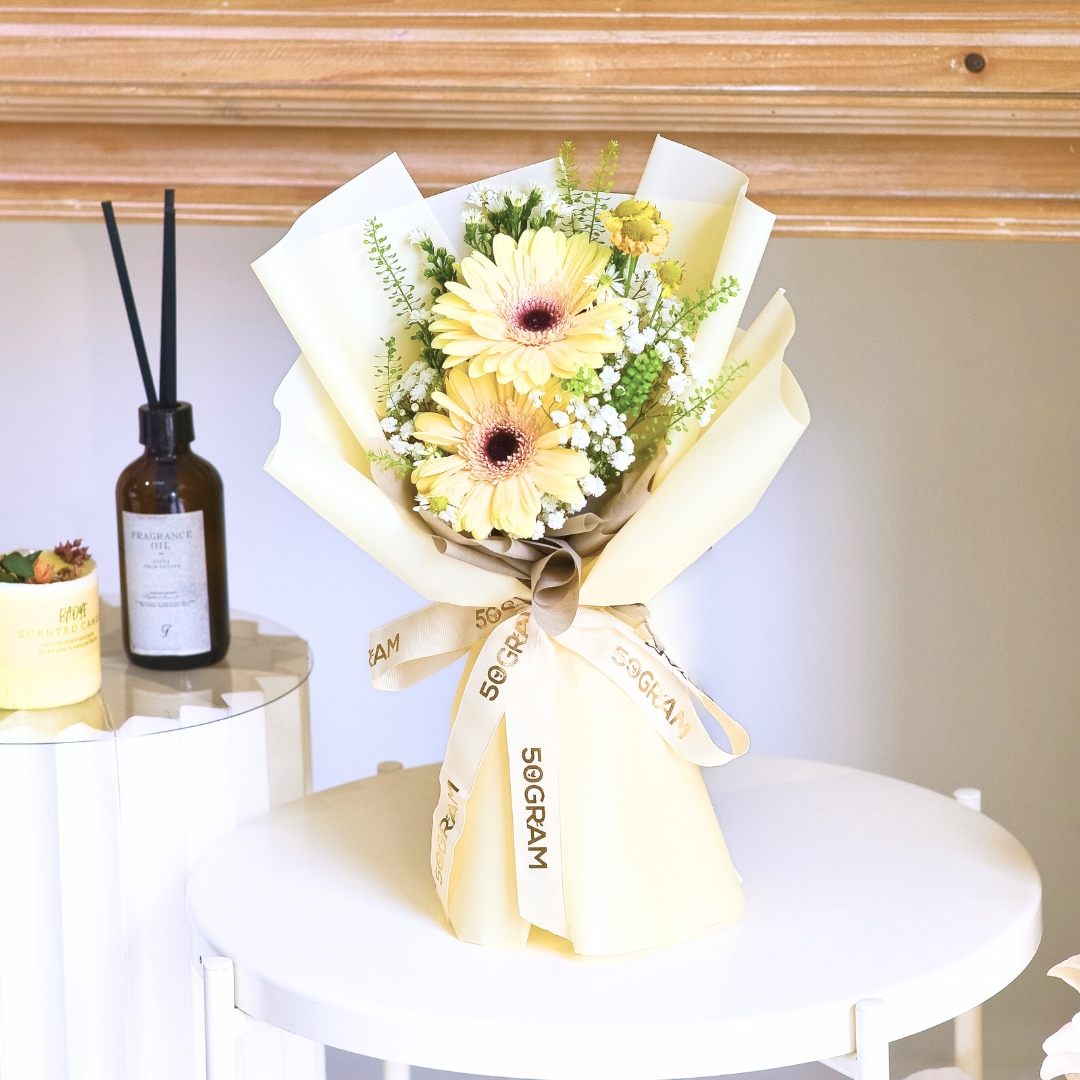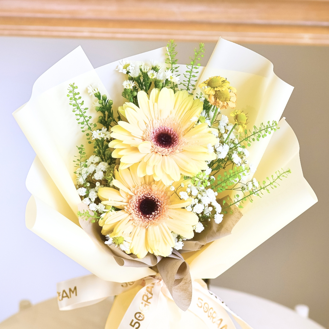 The bouquet comes with Champagne Daisy x 2, Thalapsi Green Bells, Peacock White, Chrysanthemum Painted Yellow & Baby Breath.