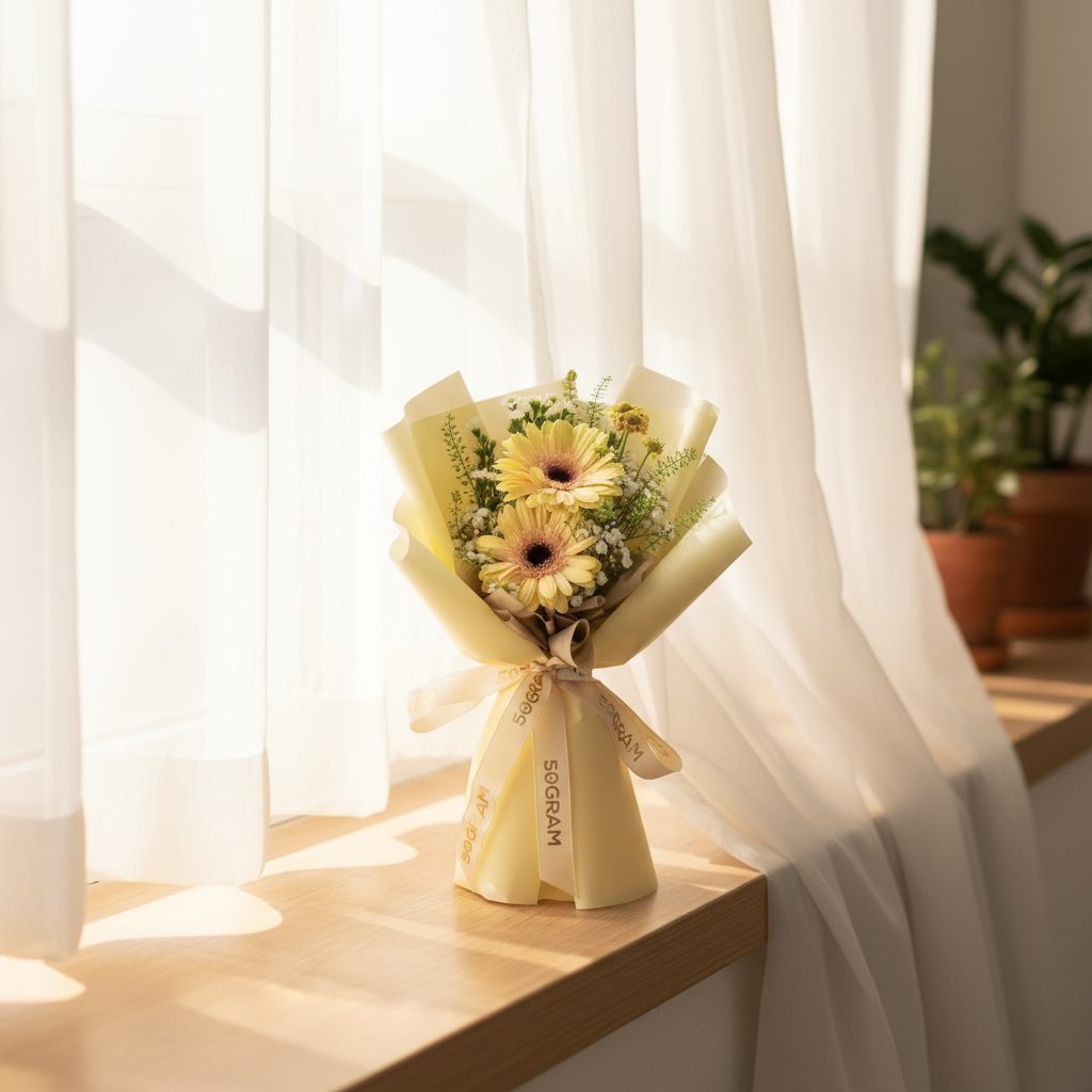 Wrapped in a champagne-toned wrap, this bouquet is perfect for celebrations, thank-you gestures, or brightening someone’s day with a splash of joy.